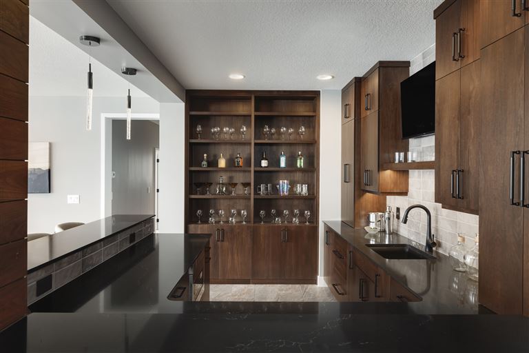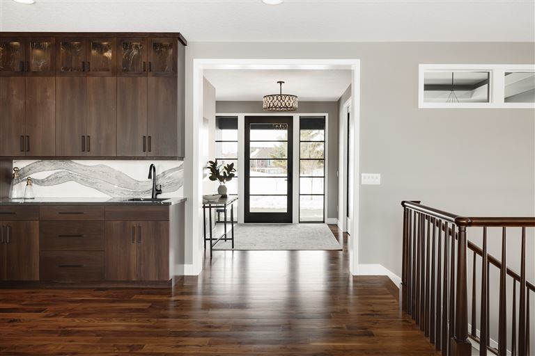 Palmer Prairie with a Modern Flare's home office features dark wood built-in shelving to provide a contemporary feel in any professional setting. Combining existing traditional elements with modern touches, this space has been designed with both comfort and function in mind. Crafted with natural tones, the dark shelving adds a unique depth to the room, providing plenty of storage space as well as a sophisticated atmosphere. Enjoy the warm atmosphere of this one-of-a-kind office setting and let the style inspire you.