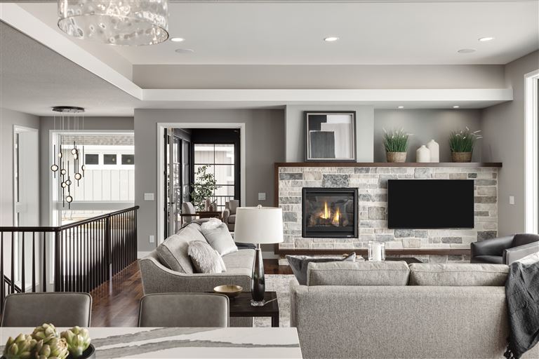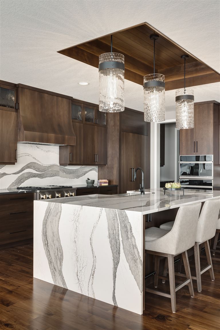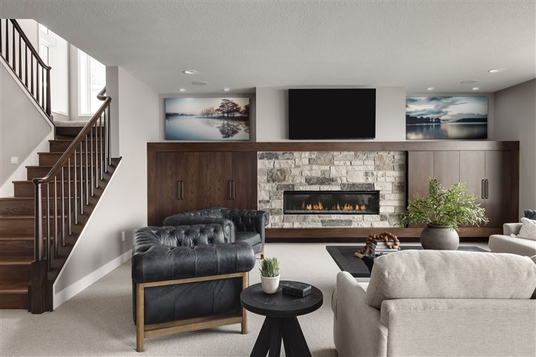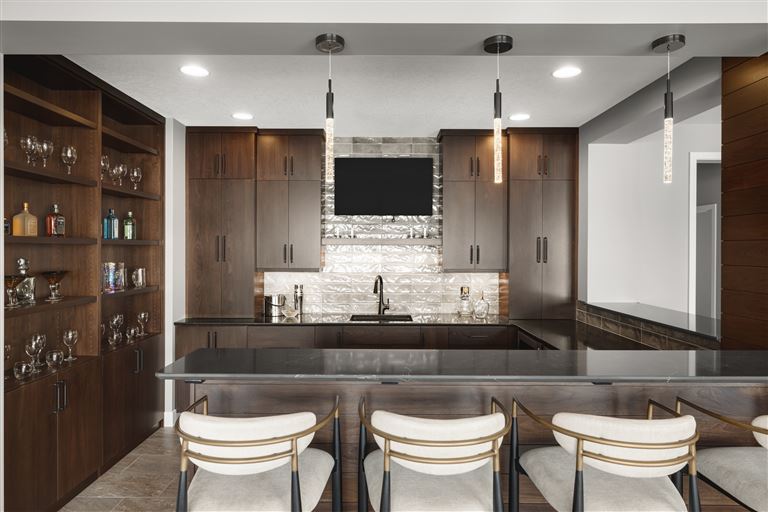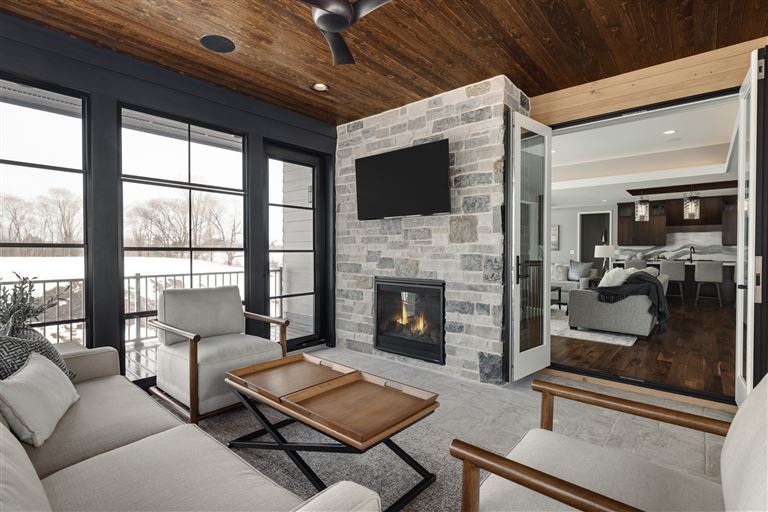 This modern prairie home, located within the Royal Golf Club Neighborhood, showcases natural stone and Hardie siding on the exterior. Walnut cabinetry and Cambria countertops are used throughout. Main level highlights include walnut flooring, Monogram appliances, a dropped ceiling detail over the island and dinette, and a walk-in pantry with built-in shelving and a second refrigerator. Expansive windows in the great room offer gorgeous golf course views. Other great room features include a box vaulted ceiling, a stone fireplace with a walnut mantle and hearth, and built-in cabinetry. Just off the great room is the three-season porch with a stone fireplace and an attached grill deck. A fully equipped wet bar, a media room with a stone fireplace, and a game room with a card table are located in the lower level, along with three additional bedrooms and an exercise room.