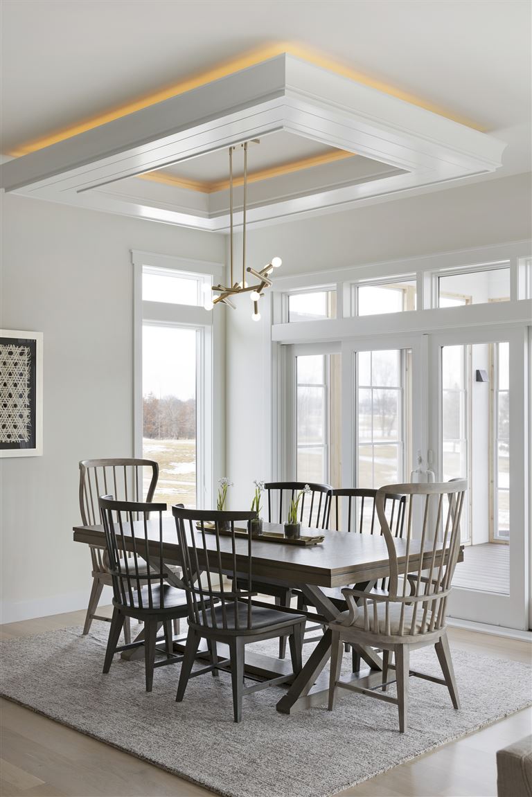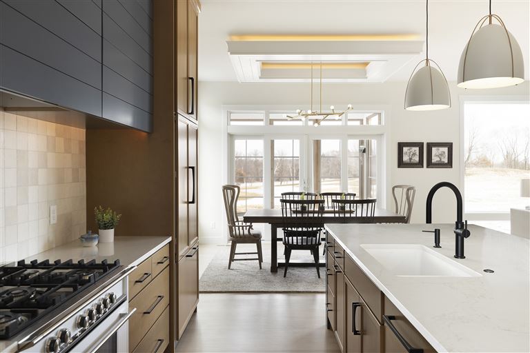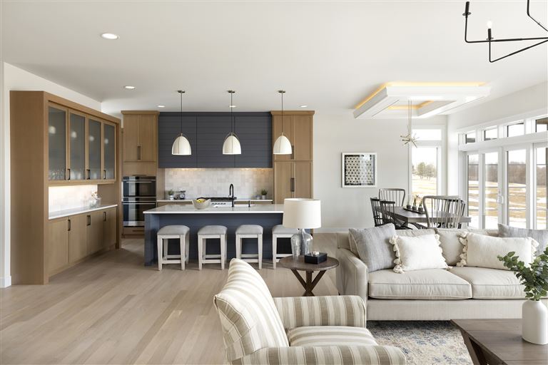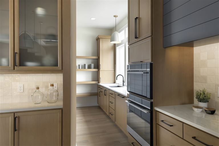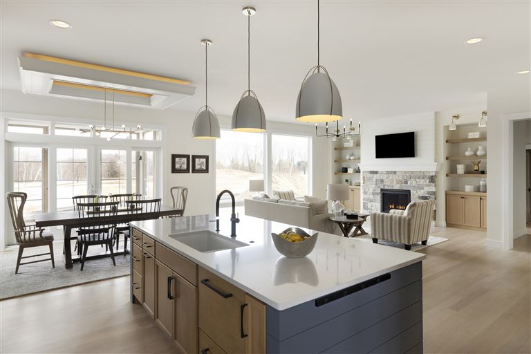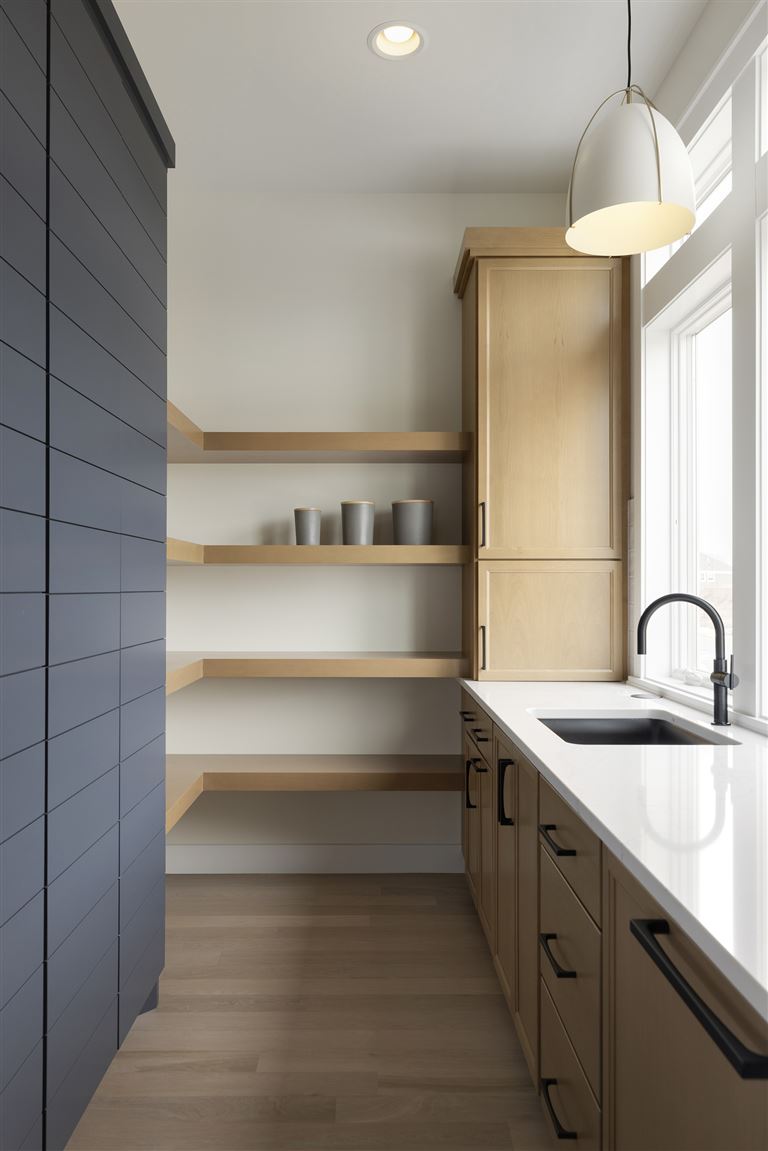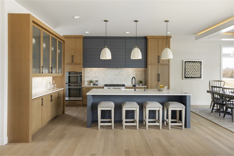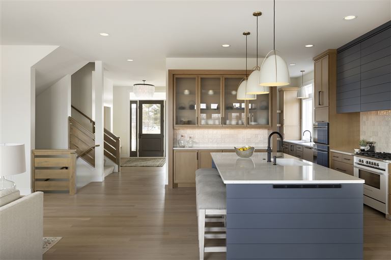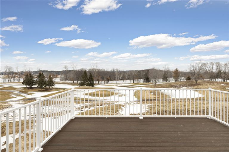 Inside this Scandi Modern Cottage, you’ll find stained alder wood cabinetry on the kitchen perimeter, Slate Blue painted island, Corian Quartz counters, and white oak flooring. The thoughtfully designed wrap-around pantry w/sink, refrigerator/freezer drawers, and open shelving add to the room's functionality. Expansive windows in the great room allow for ample natural lighting. Other features include a reverse box vault in the dining room. Sliding patio doors open up to the 3 season porch with Spiced Rum Trex flooring. The upper level offers two additional bedrooms, a full bath, and a large family room with a deck that offers gorgeous panoramic lake & golf course views - perfect for entertaining!