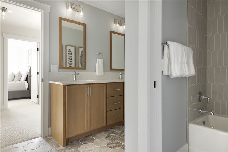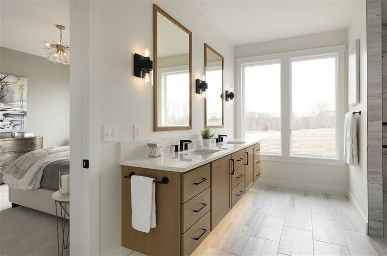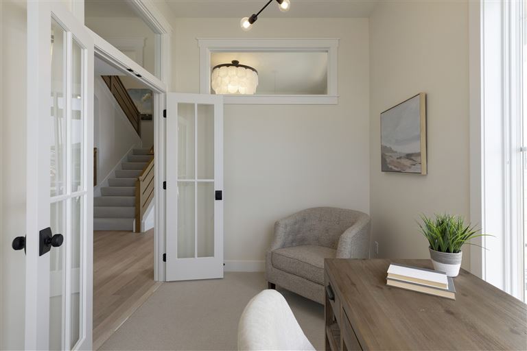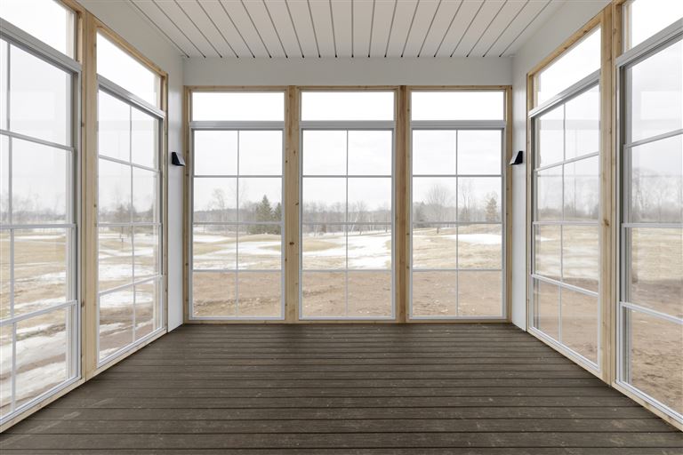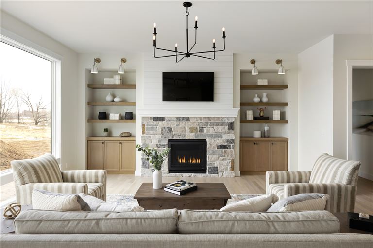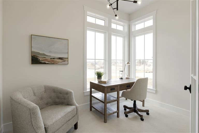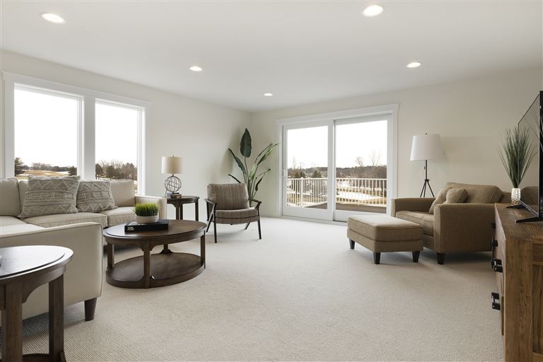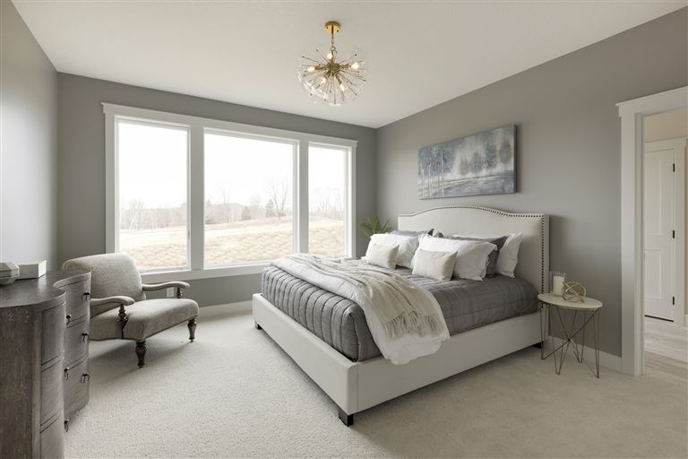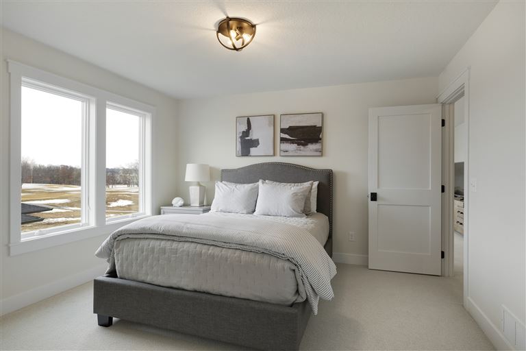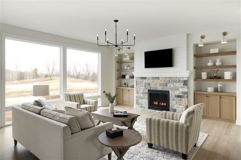 Inside this Scandi Modern Cottage, you’ll find stained alder wood cabinetry on the kitchen perimeter, Slate Blue painted island, Corian Quartz counters, and white oak flooring. The thoughtfully designed wrap-around pantry w/sink, refrigerator/freezer drawers, and open shelving add to the room's functionality. Expansive windows in the great room allow for ample natural lighting. Other features include a reverse box vault in the dining room. Sliding patio doors open up to the 3 season porch with Spiced Rum Trex flooring. The upper level offers two additional bedrooms, a full bath, and a large family room with a deck that offers gorgeous panoramic lake & golf course views - perfect for entertaining!