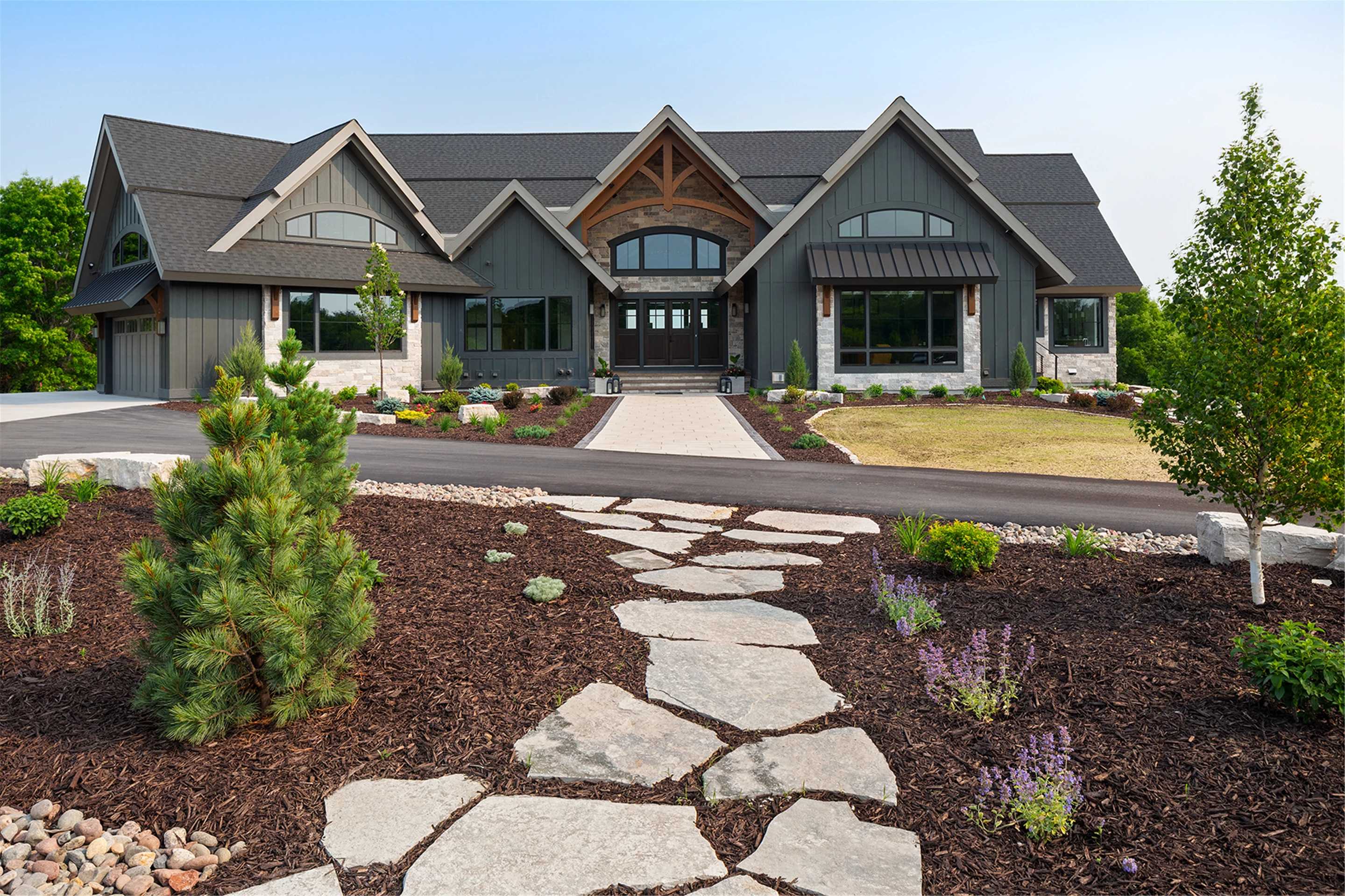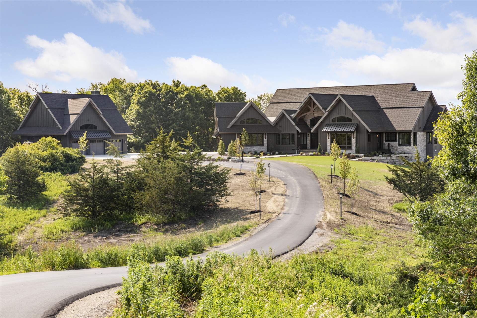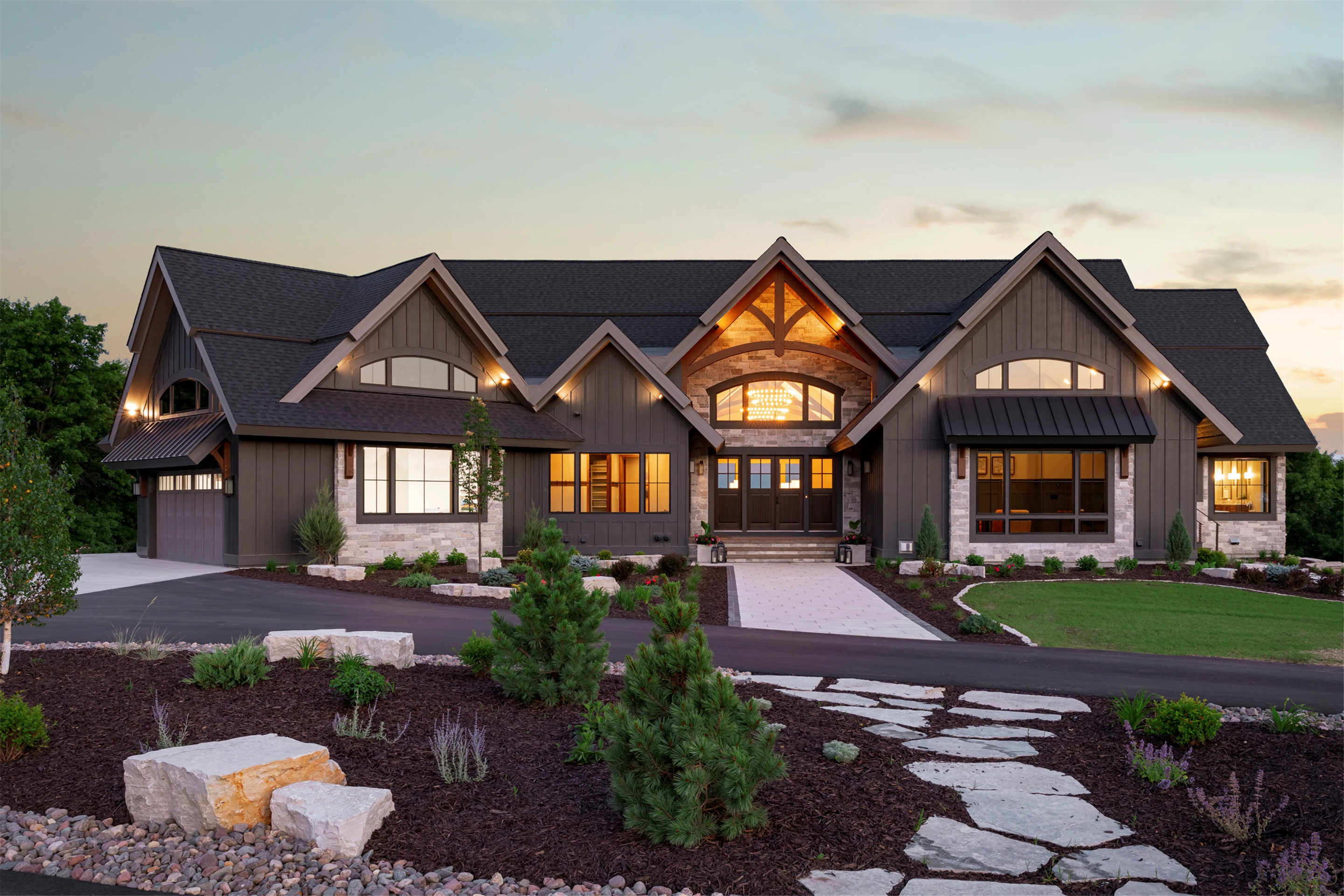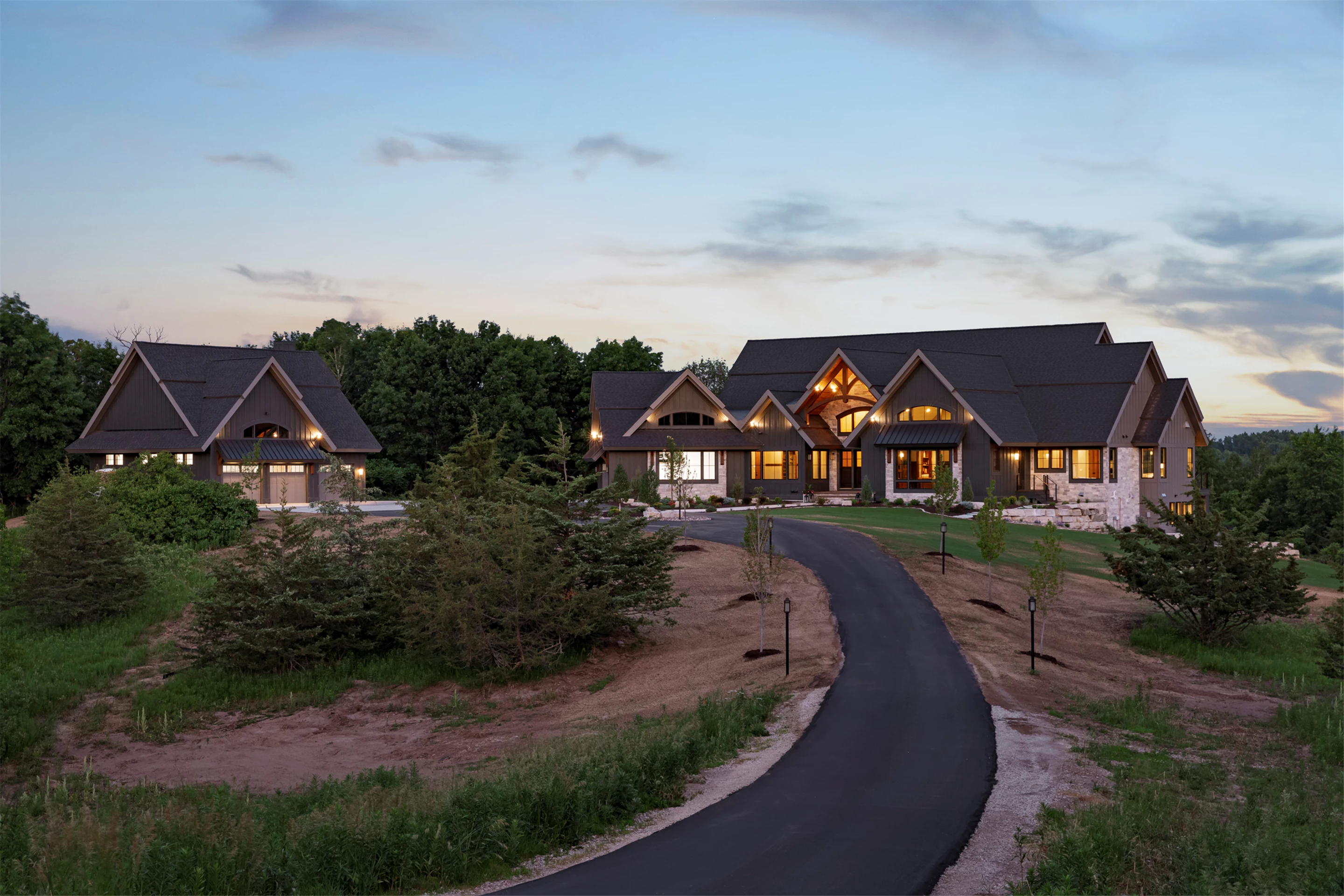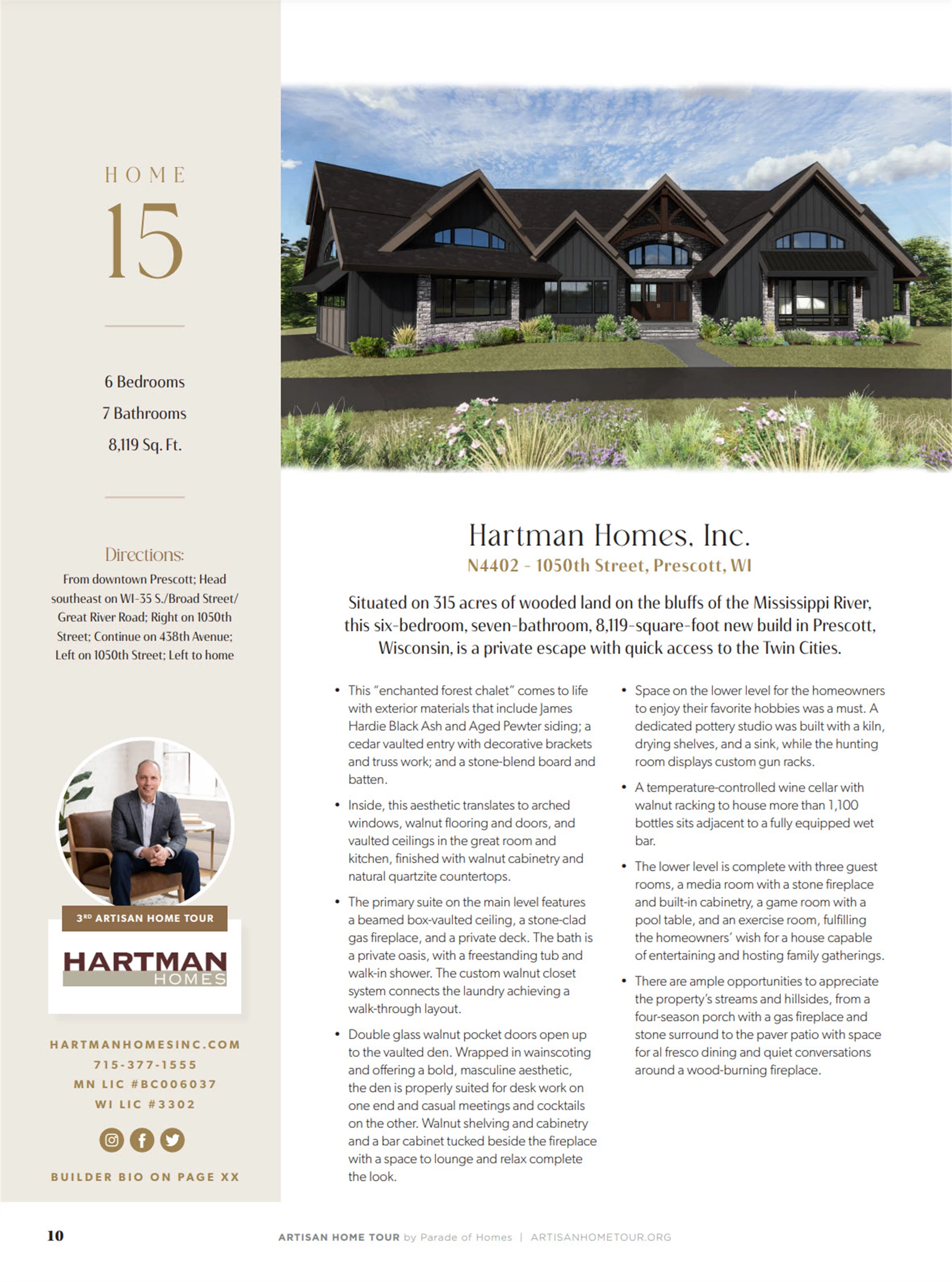 Come see the Enchanted Forest Chalet during the 2023 Artisan Home Tour! Situated on 315 acres of wooded land on the bluffs of the Mississippi River, this six-bedroom, seven-bathroom, 8,119-square-foot new build in Prescott, Wisconsin, is a private escape with quick access to the Twin Cities. The Enchanted Forest Chalet comes to life with exterior materials that include James Hardie Black Ash and Aged Pewter siding; a cedar vaulted entry with decorative brackets and truss work; and a stone-blend board and batten. Inside, this aesthetic translates to arched windows, walnut flooring and doors, and vaulted ceilings in the great room and kitchen, finished with walnut cabinetry and natural quartzite countertops. The primary suite on the main level features a beamed box-vaulted ceiling, a stone-clad gas fireplace, and a private deck. The bath is a private oasis, with a freestanding tub and walk-in shower. The custom walnut closet system connects the laundry achieving a walk-through layout. There are ample opportunities to appreciate the property’s streams and hillsides, from a four-season porch with a gas fireplace and stone surround to the paver patio with space for al fresco dining and quiet conversations around a wood-burning fireplace.
