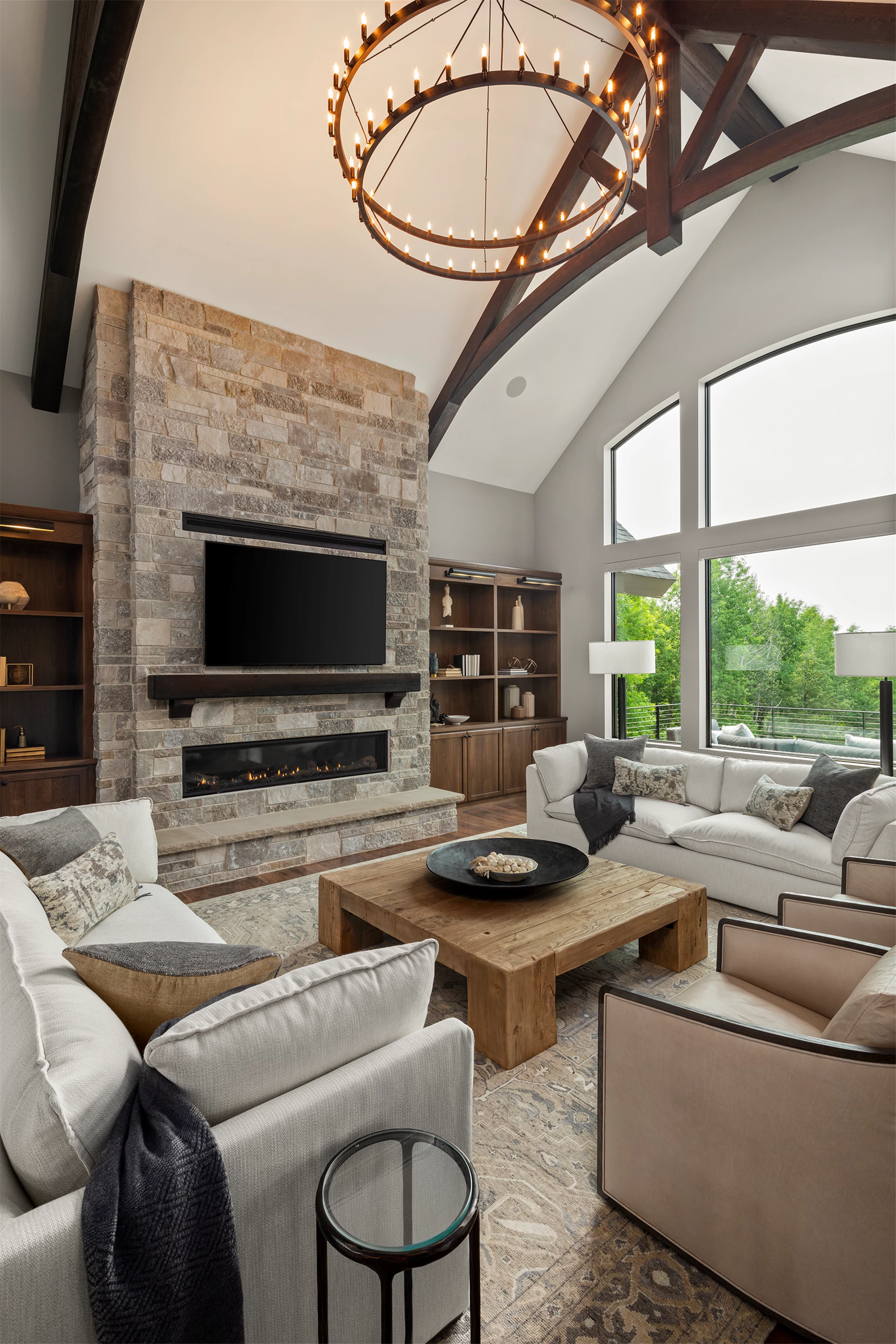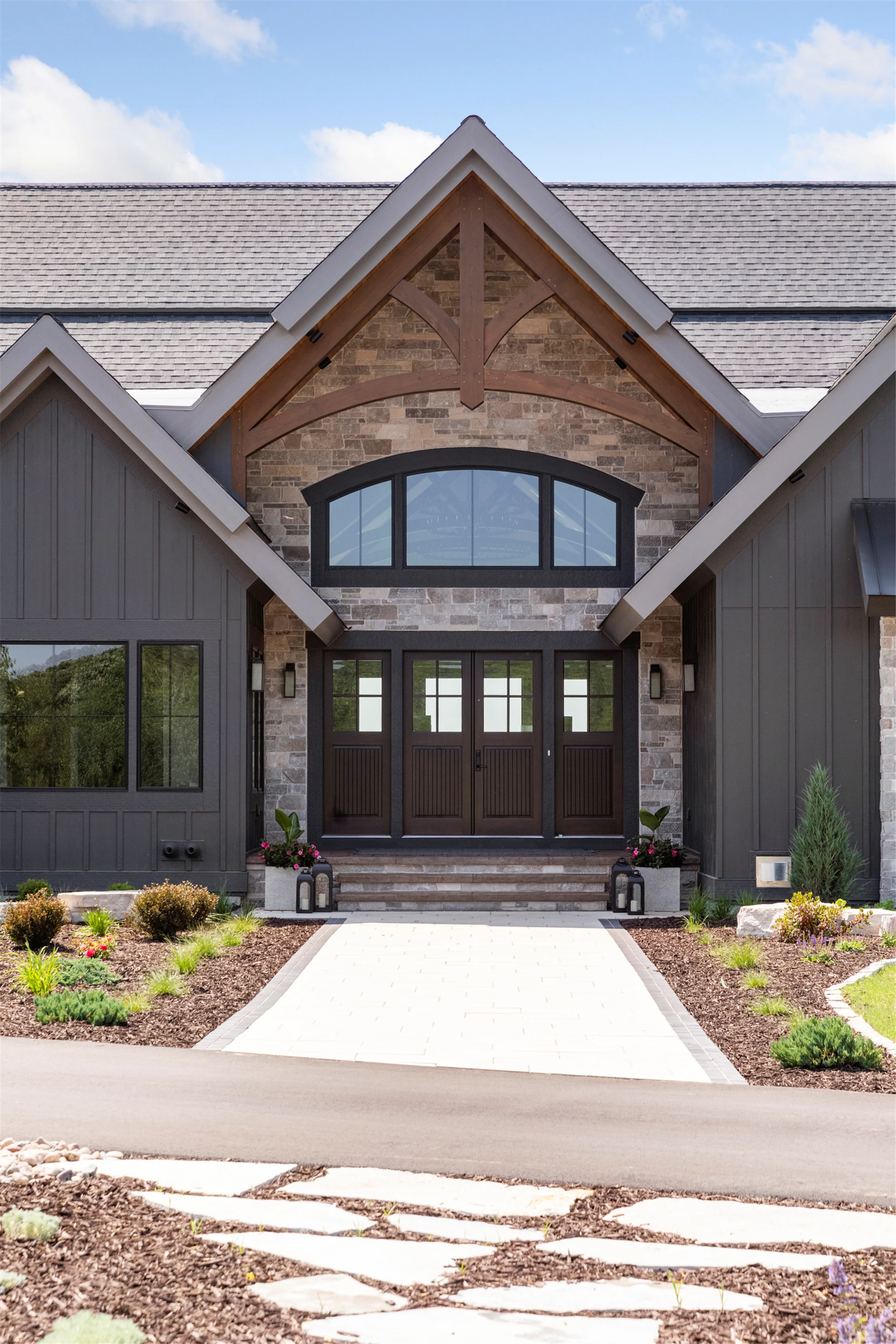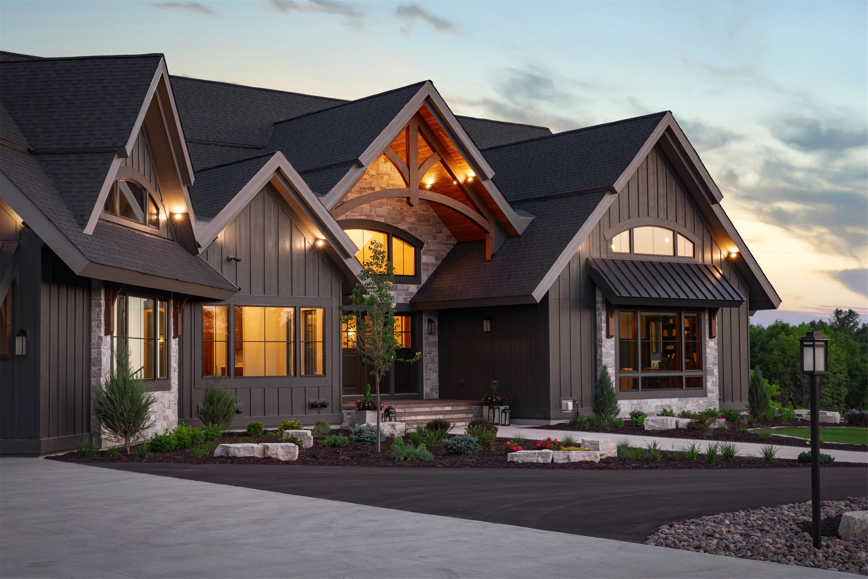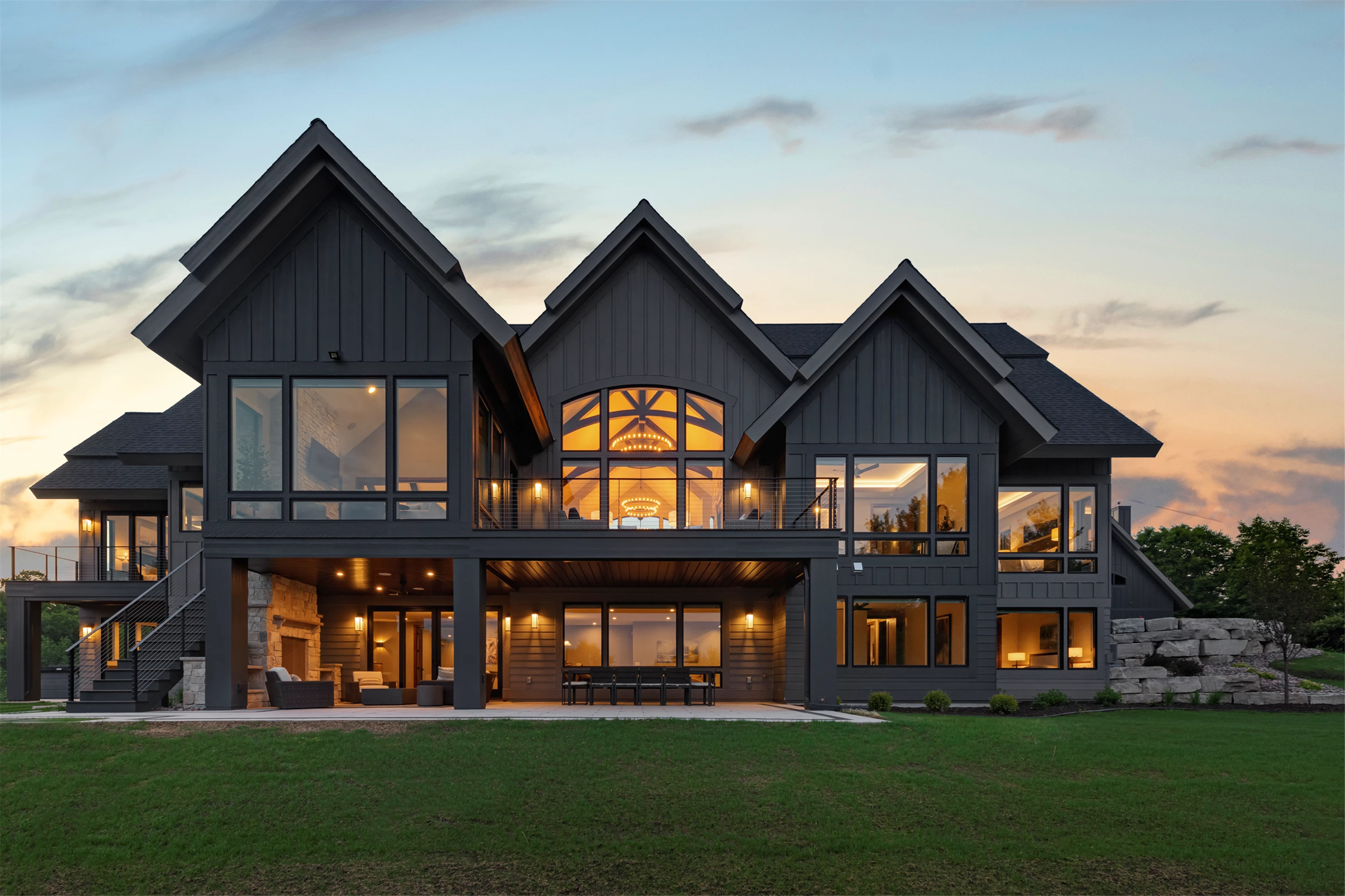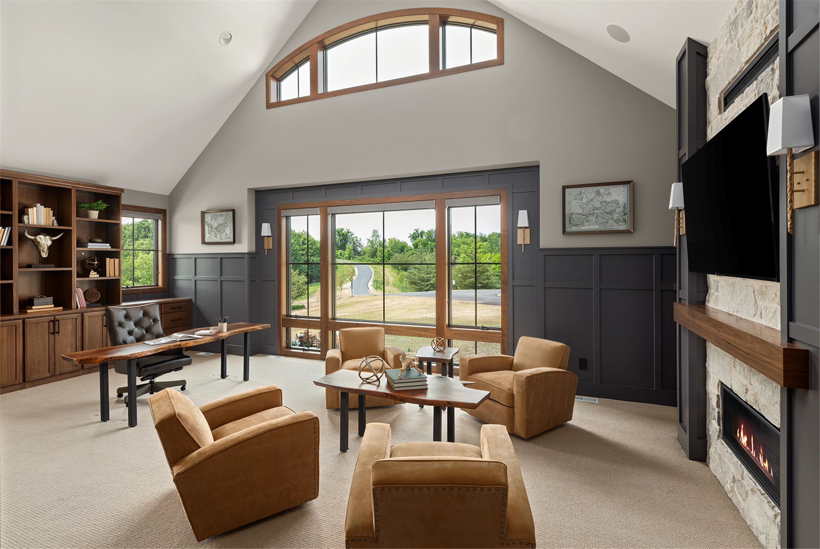 Come see the Enchanted Forest Chalet during the 2023 Artisan Home Tour! Situated on 315 acres of wooded land on the bluffs of the Mississippi River, this six-bedroom, seven-bathroom, 8,119-square-foot new build in Prescott, Wisconsin, is a private escape with quick access to the Twin Cities. The Enchanted Forest Chalet comes to life with exterior materials that include James Hardie Black Ash and Aged Pewter siding; a cedar vaulted entry with decorative brackets and truss work; and a stone-blend board and batten. Inside, this aesthetic translates to arched windows, walnut flooring and doors, and vaulted ceilings in the great room and kitchen, finished with walnut cabinetry and natural quartzite countertops. The primary suite on the main level features a beamed box-vaulted ceiling, a stone-clad gas fireplace, and a private deck. The bath is a private oasis, with a freestanding tub and walk-in shower. The custom walnut closet system connects the laundry achieving a walk-through layout. There are ample opportunities to appreciate the property’s streams and hillsides, from a four-season porch with a gas fireplace and stone surround to the paver patio with space for al fresco dining and quiet conversations around a wood-burning fireplace.
