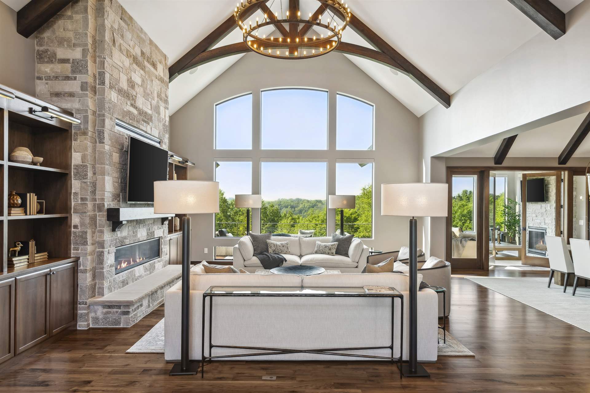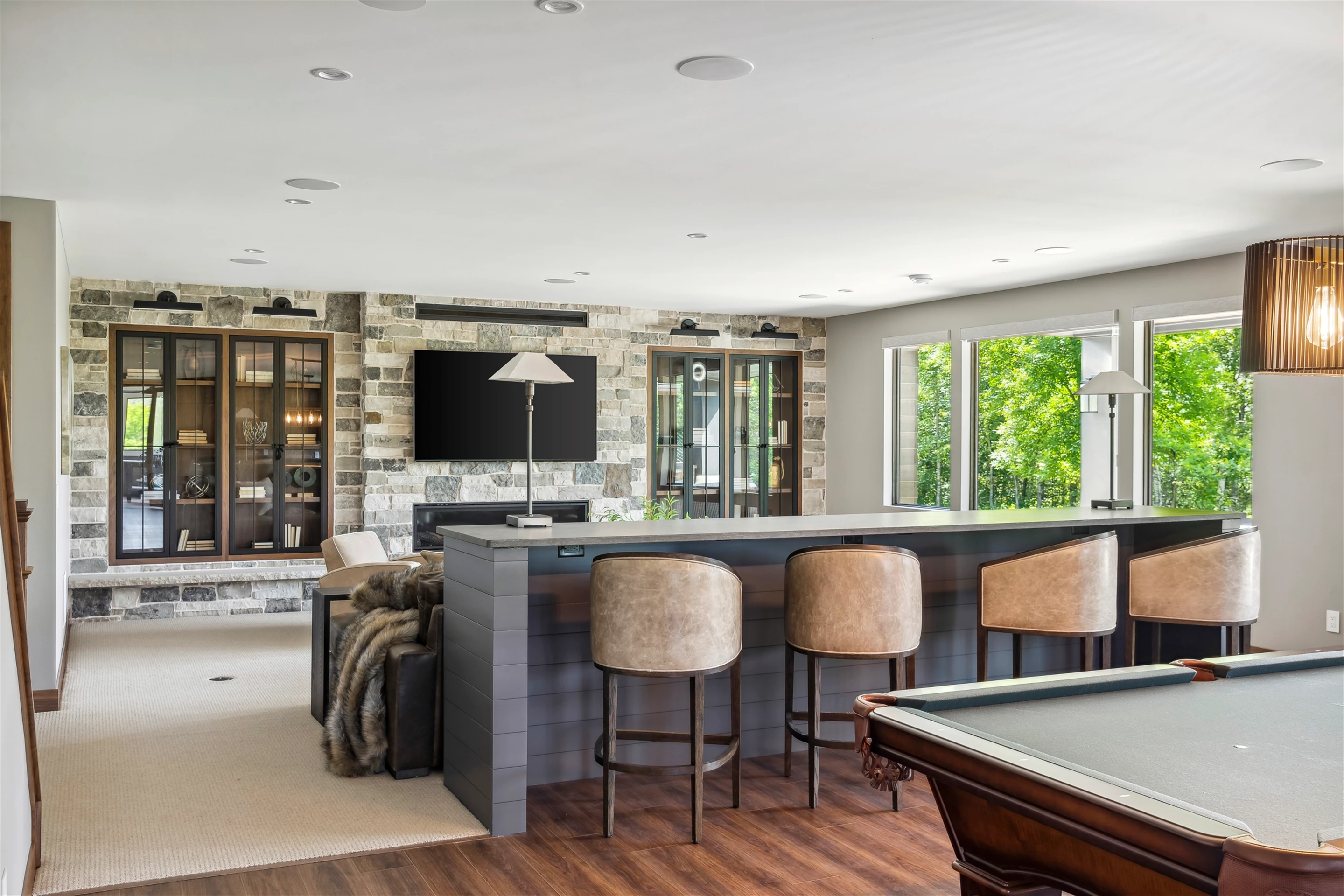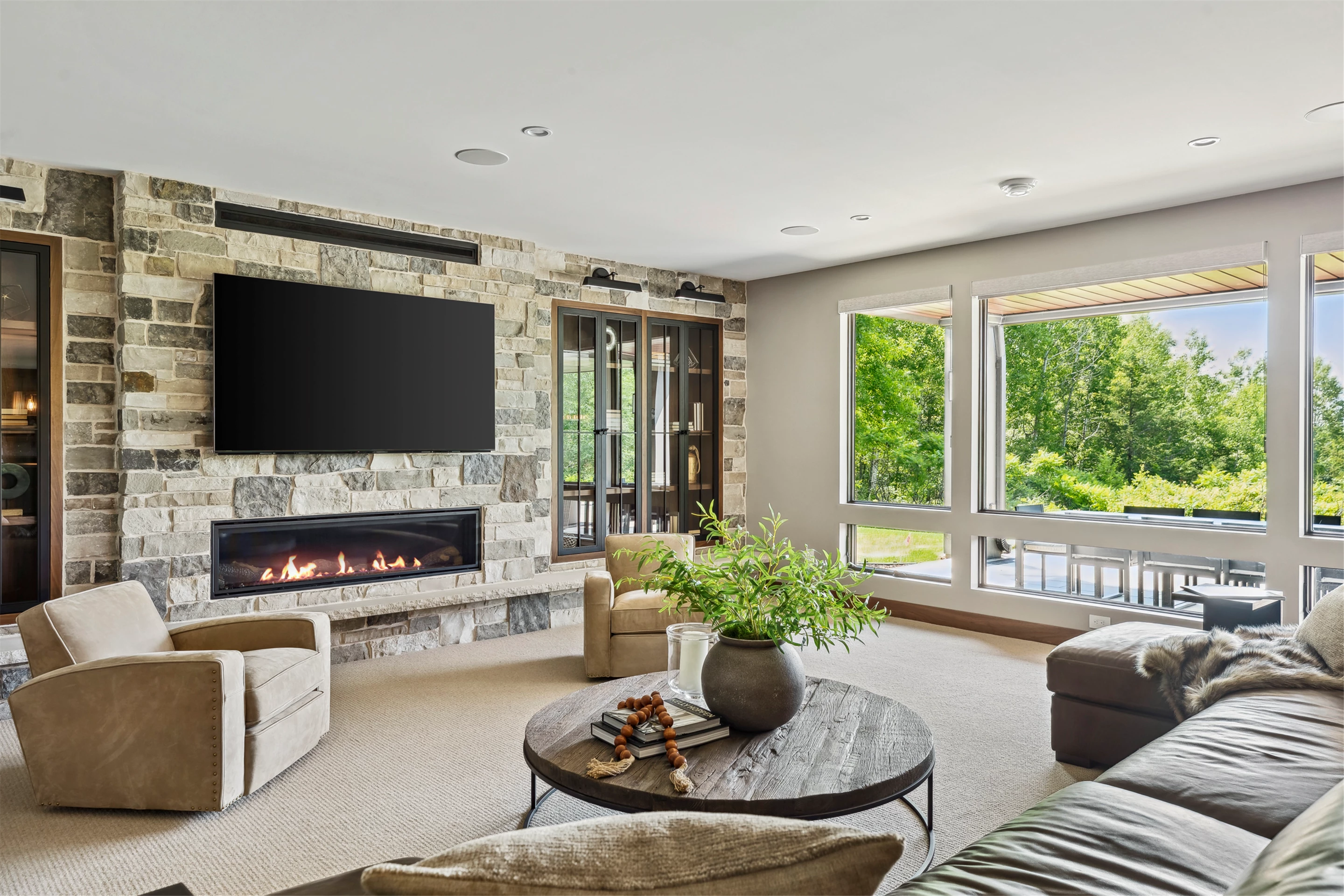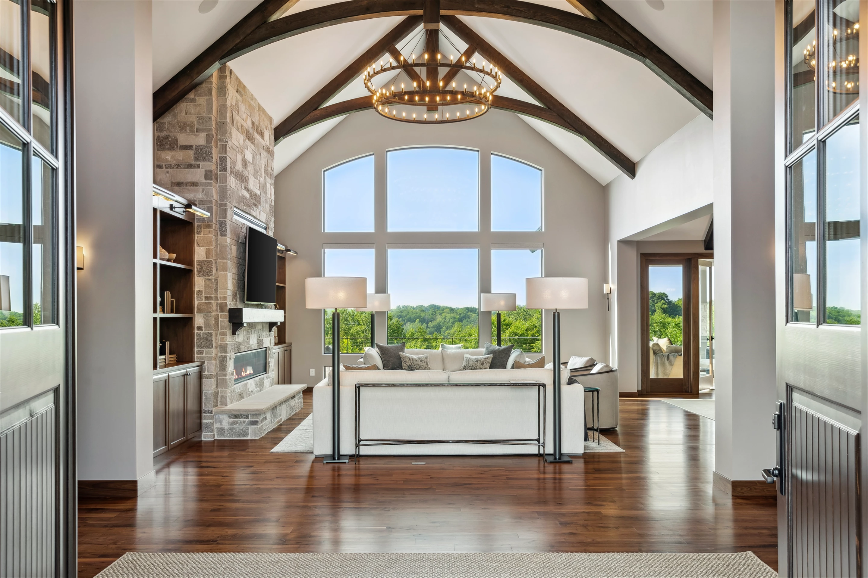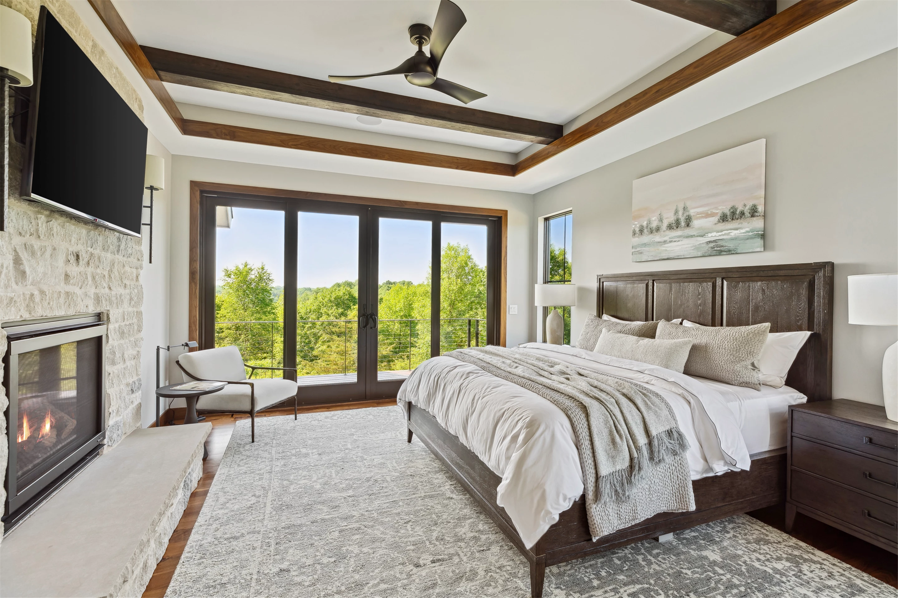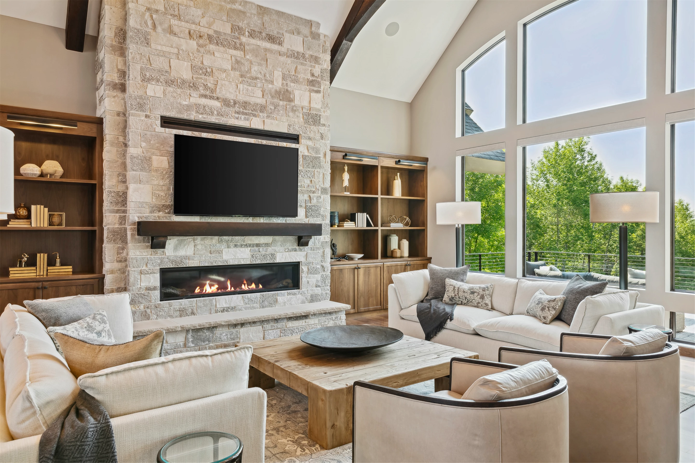 Come see the Enchanted Forest Chalet during the 2023 Artisan Home Tour! Situated on 315 acres of wooded land on the bluffs of the Mississippi River, this six-bedroom, seven-bathroom, 8,119-square-foot new build in Prescott, Wisconsin, is a private escape with quick access to the Twin Cities. The Enchanted Forest Chalet comes to life with exterior materials that include James Hardie Black Ash and Aged Pewter siding; a cedar vaulted entry with decorative brackets and truss work; and a stone-blend board and batten. Inside, this aesthetic translates to arched windows, walnut flooring and doors, and vaulted ceilings in the great room and kitchen, finished with walnut cabinetry and natural quartzite countertops. The primary suite on the main level features a beamed box-vaulted ceiling, a stone-clad gas fireplace, and a private deck. The bath is a private oasis, with a freestanding tub and walk-in shower. The custom walnut closet system connects the laundry achieving a walk-through layout. There are ample opportunities to appreciate the property’s streams and hillsides, from a four-season porch with a gas fireplace and stone surround to the paver patio with space for al fresco dining and quiet conversations around a wood-burning fireplace.