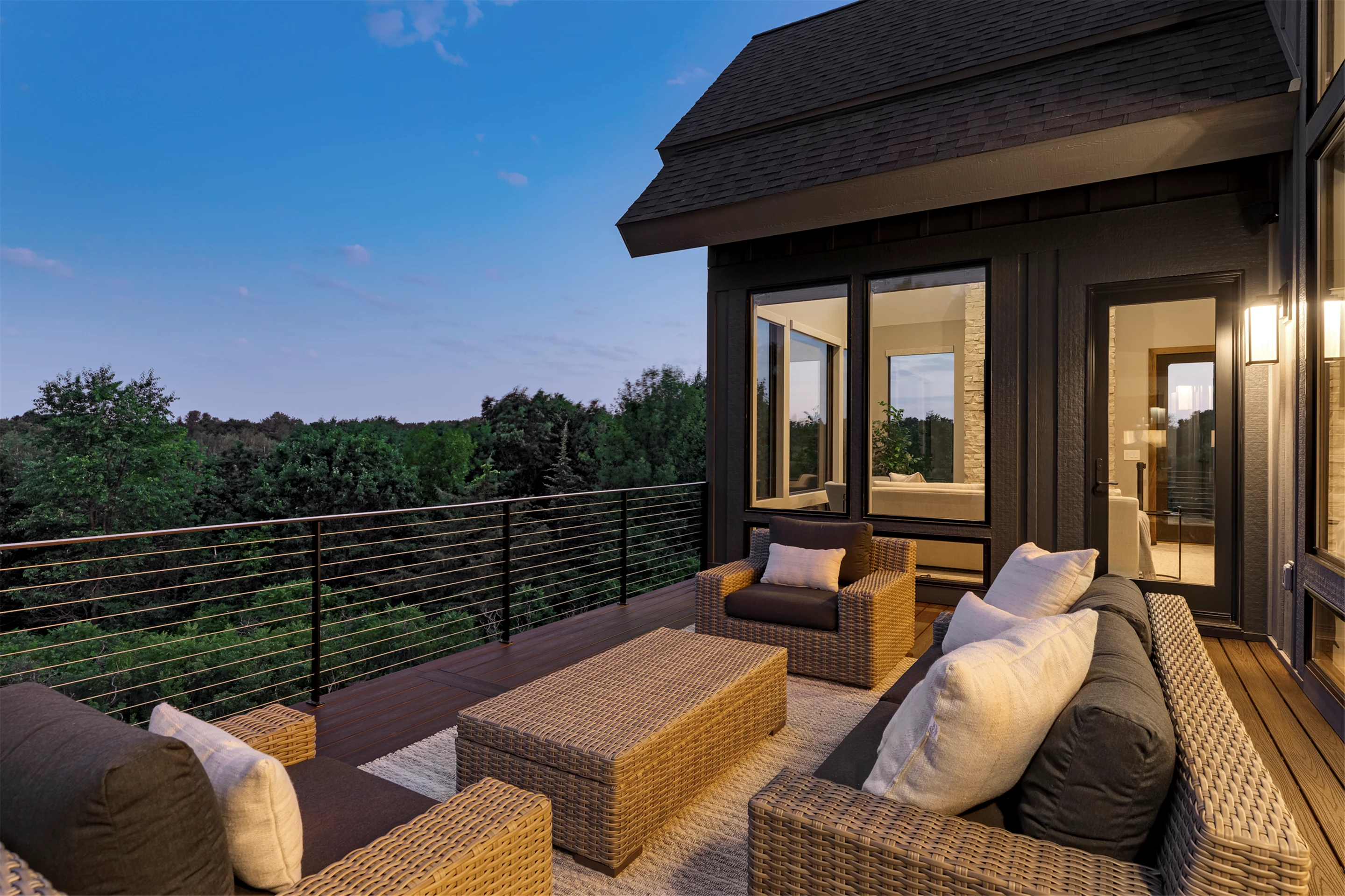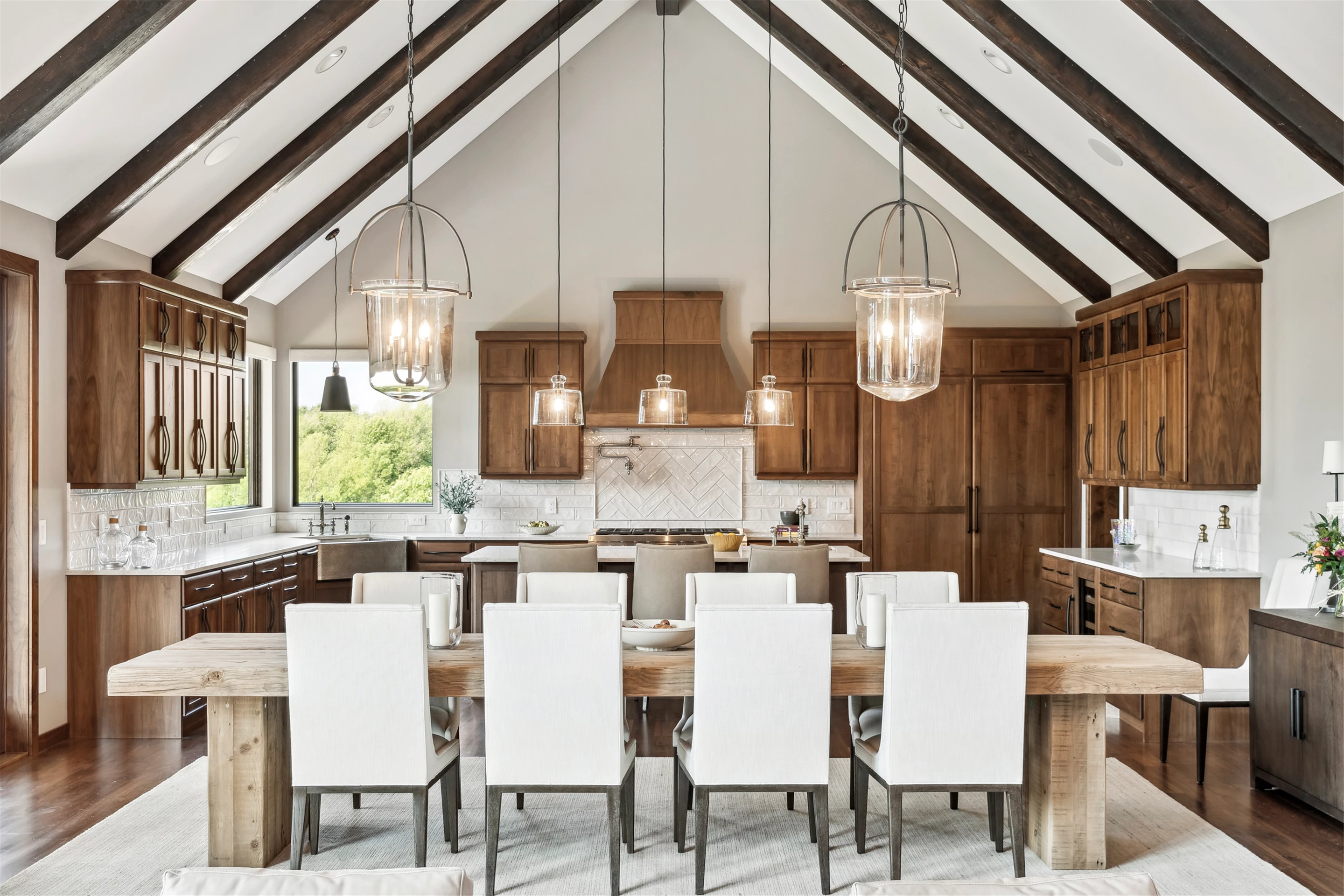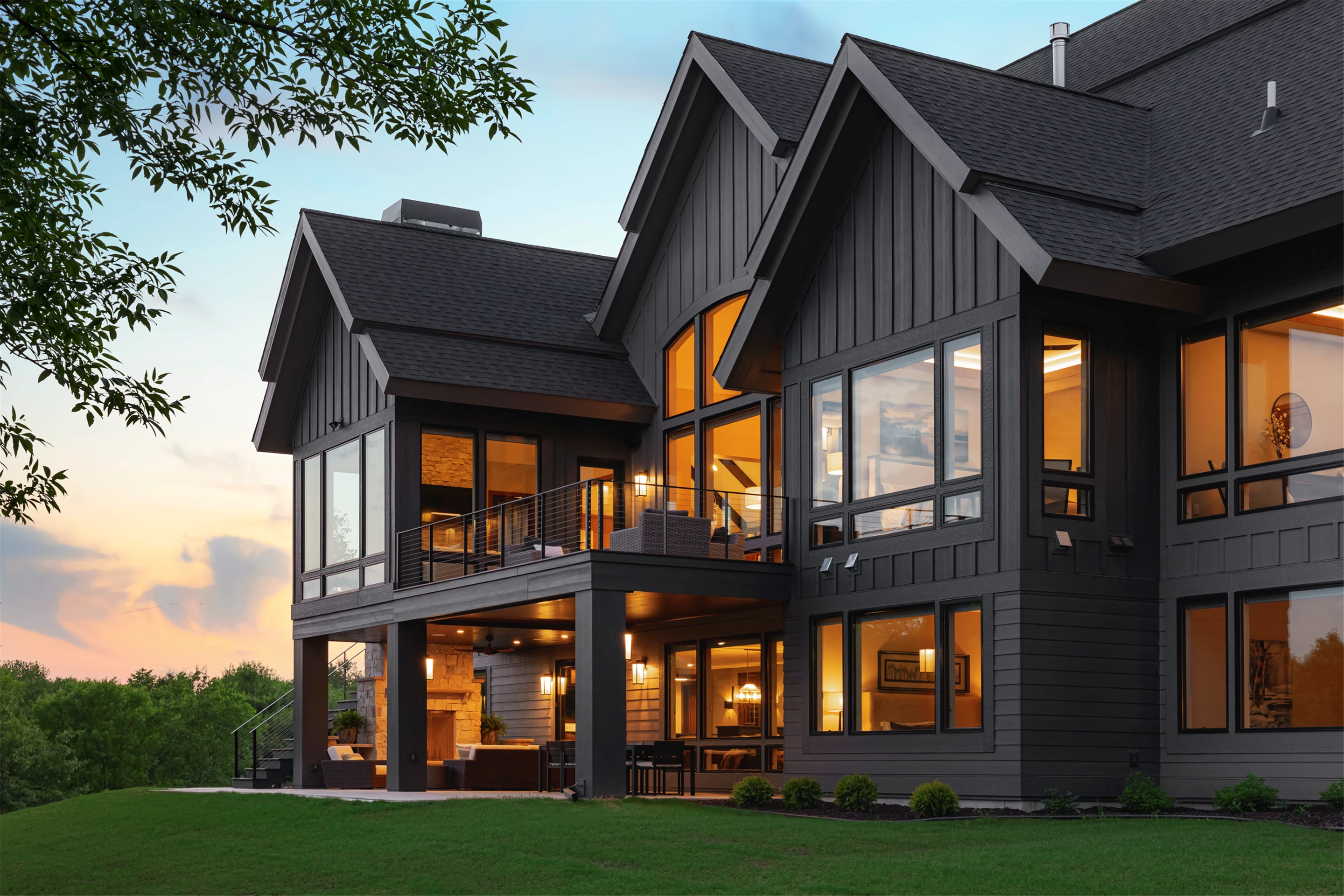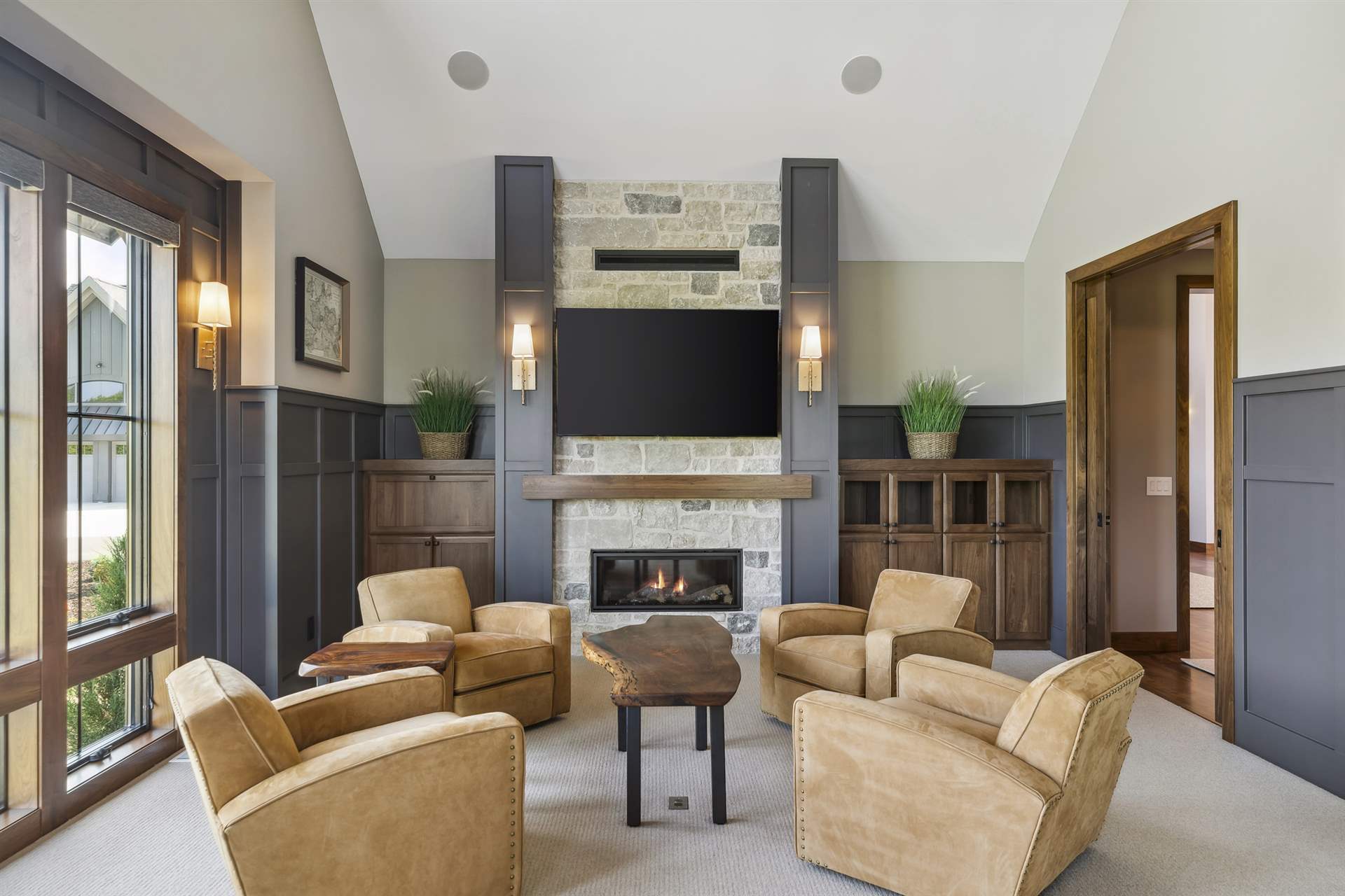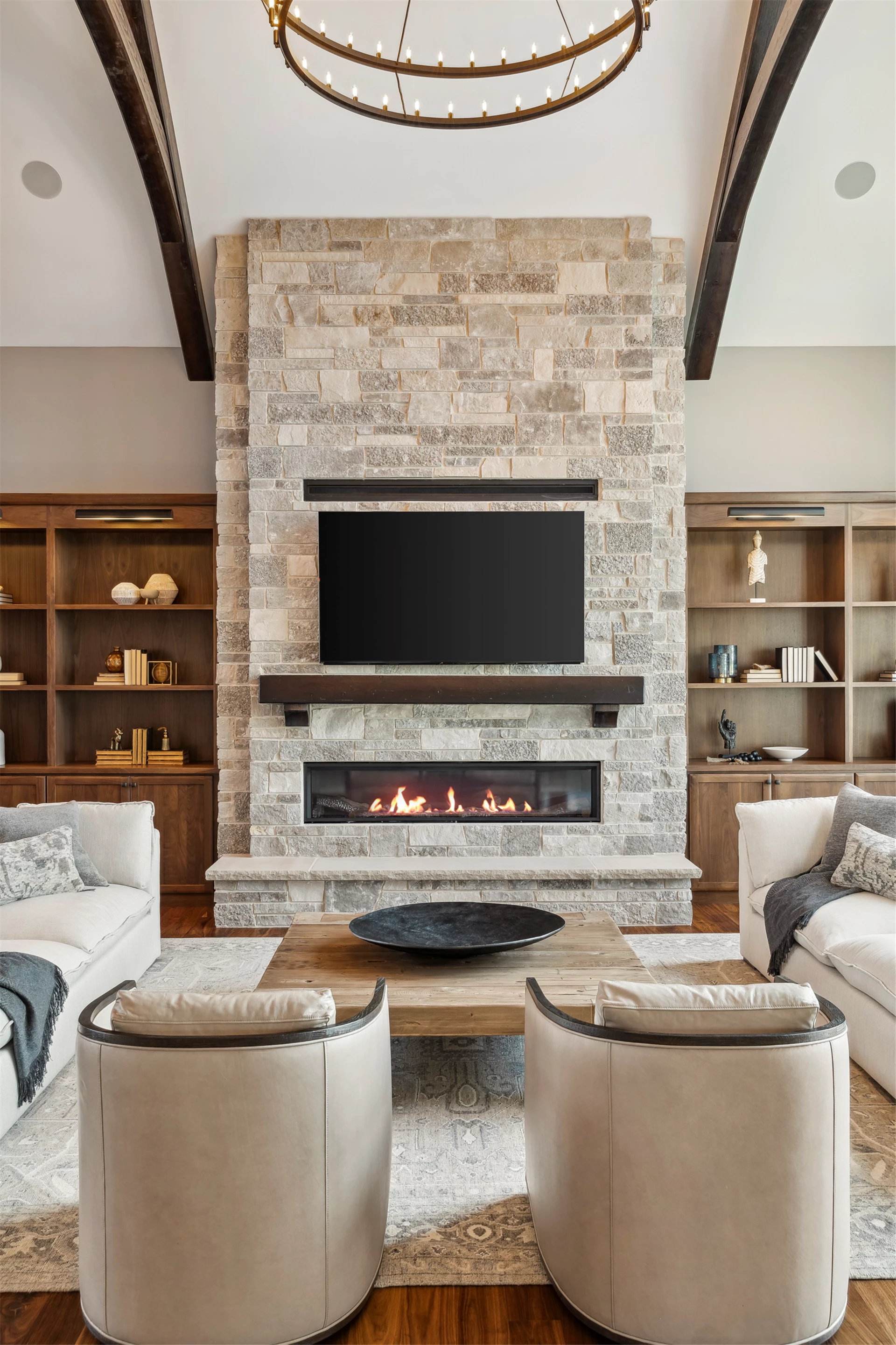 Come see the Enchanted Forest Chalet during the 2023 Artisan Home Tour! Situated on 315 acres of wooded land on the bluffs of the Mississippi River, this six-bedroom, seven-bathroom, 8,119-square-foot new build in Prescott, Wisconsin, is a private escape with quick access to the Twin Cities. The Enchanted Forest Chalet comes to life with exterior materials that include James Hardie Black Ash and Aged Pewter siding; a cedar vaulted entry with decorative brackets and truss work; and a stone-blend board and batten. Inside, this aesthetic translates to arched windows, walnut flooring and doors, and vaulted ceilings in the great room and kitchen, finished with walnut cabinetry and natural quartzite countertops. The primary suite on the main level features a beamed box-vaulted ceiling, a stone-clad gas fireplace, and a private deck. The bath is a private oasis, with a freestanding tub and walk-in shower. The custom walnut closet system connects the laundry achieving a walk-through layout. There are ample opportunities to appreciate the property’s streams and hillsides, from a four-season porch with a gas fireplace and stone surround to the paver patio with space for al fresco dining and quiet conversations around a wood-burning fireplace.