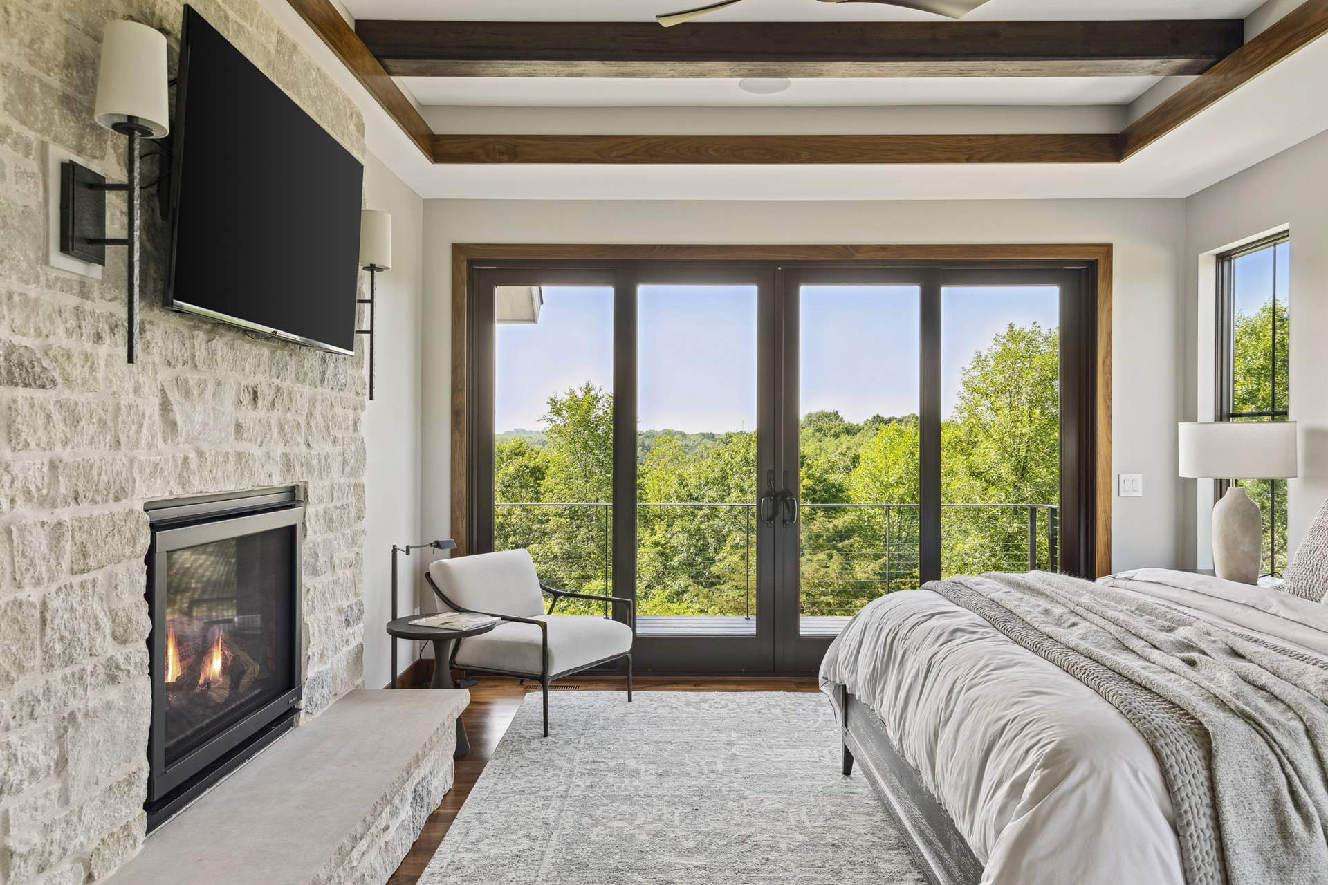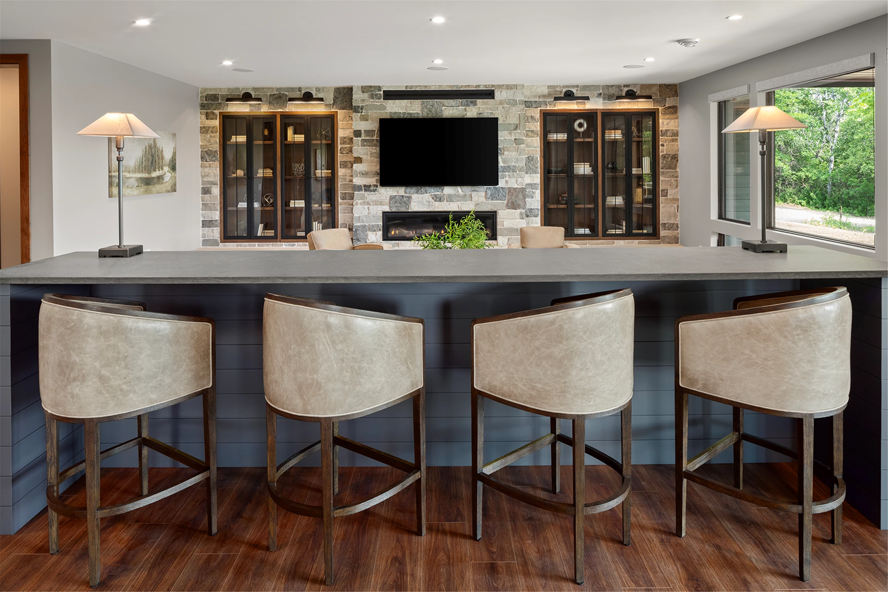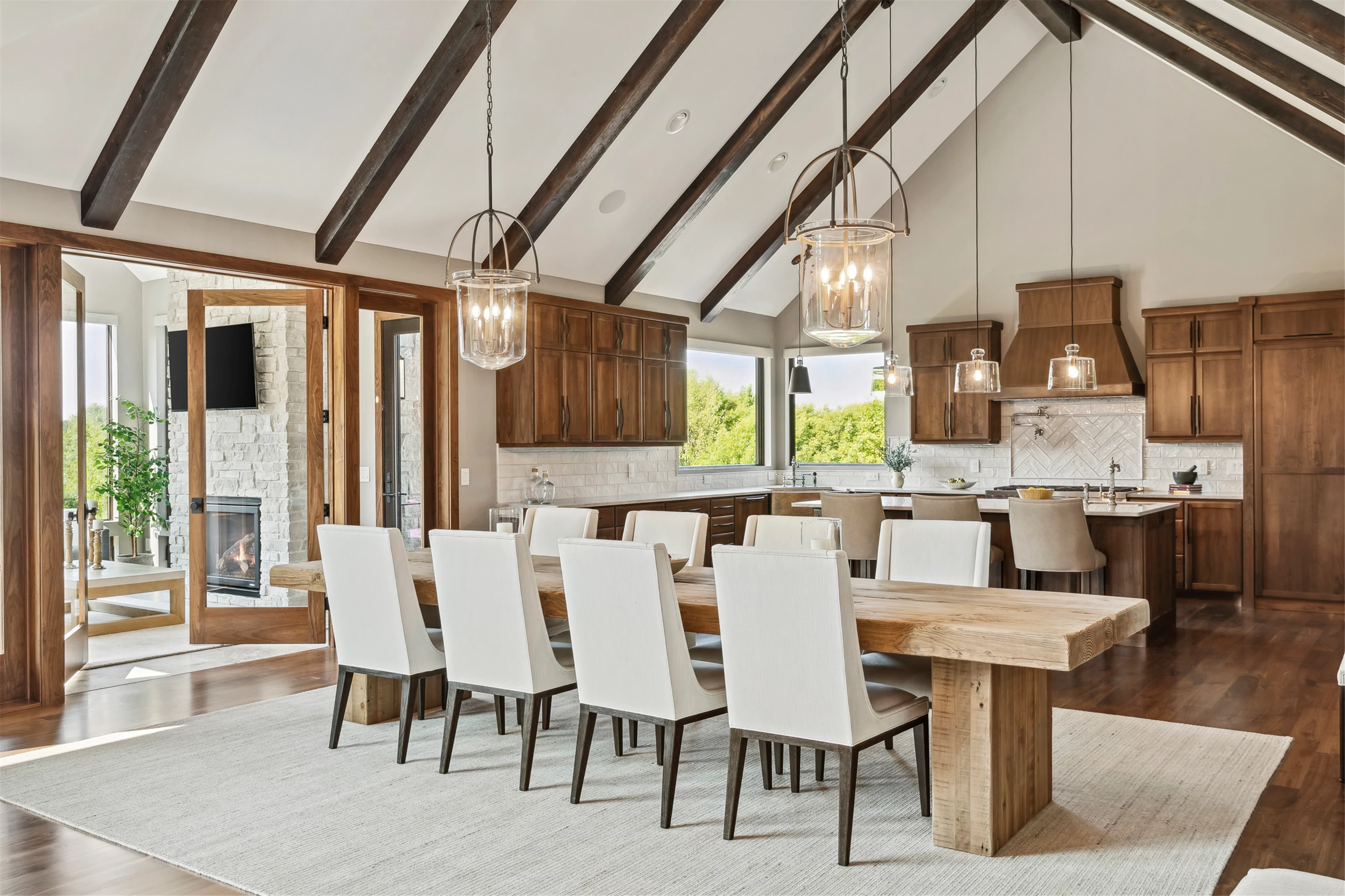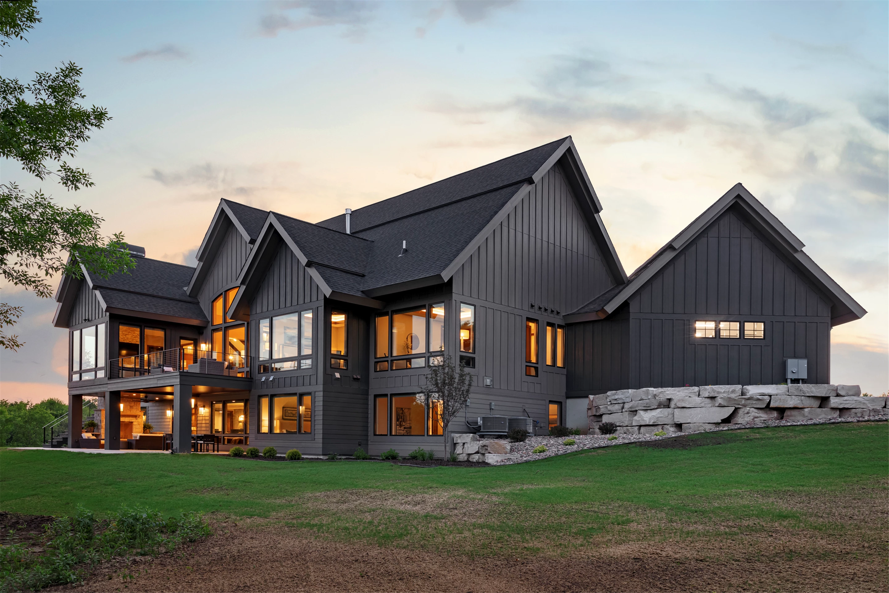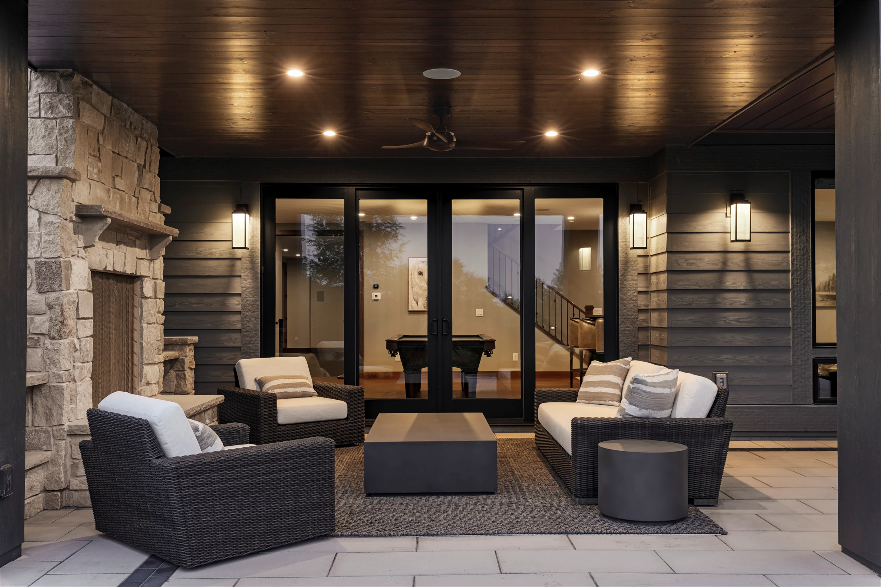 Come see the Enchanted Forest Chalet during the 2023 Artisan Home Tour! Situated on 315 acres of wooded land on the bluffs of the Mississippi River, this six-bedroom, seven-bathroom, 8,119-square-foot new build in Prescott, Wisconsin, is a private escape with quick access to the Twin Cities. The Enchanted Forest Chalet comes to life with exterior materials that include James Hardie Black Ash and Aged Pewter siding; a cedar vaulted entry with decorative brackets and truss work; and a stone-blend board and batten. Inside, this aesthetic translates to arched windows, walnut flooring and doors, and vaulted ceilings in the great room and kitchen, finished with walnut cabinetry and natural quartzite countertops. The primary suite on the main level features a beamed box-vaulted ceiling, a stone-clad gas fireplace, and a private deck. The bath is a private oasis, with a freestanding tub and walk-in shower. The custom walnut closet system connects the laundry achieving a walk-through layout. There are ample opportunities to appreciate the property’s streams and hillsides, from a four-season porch with a gas fireplace and stone surround to the paver patio with space for al fresco dining and quiet conversations around a wood-burning fireplace.