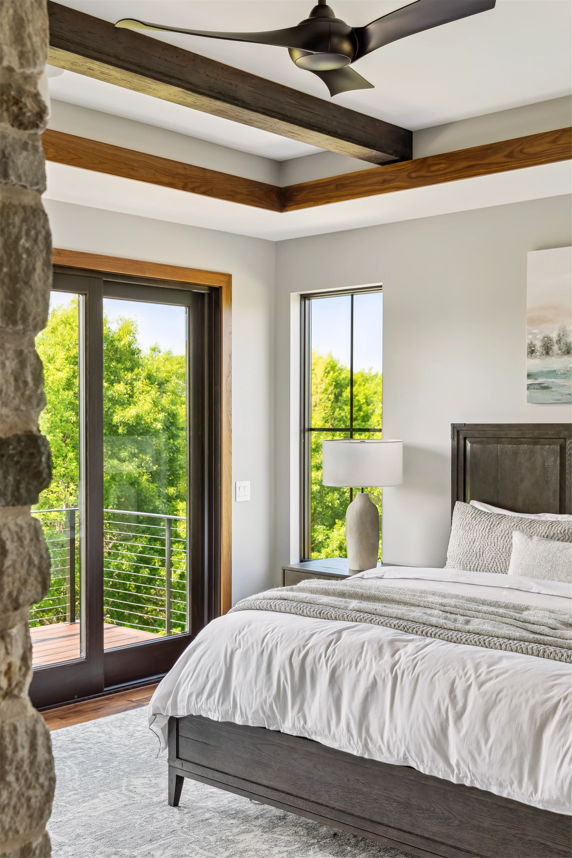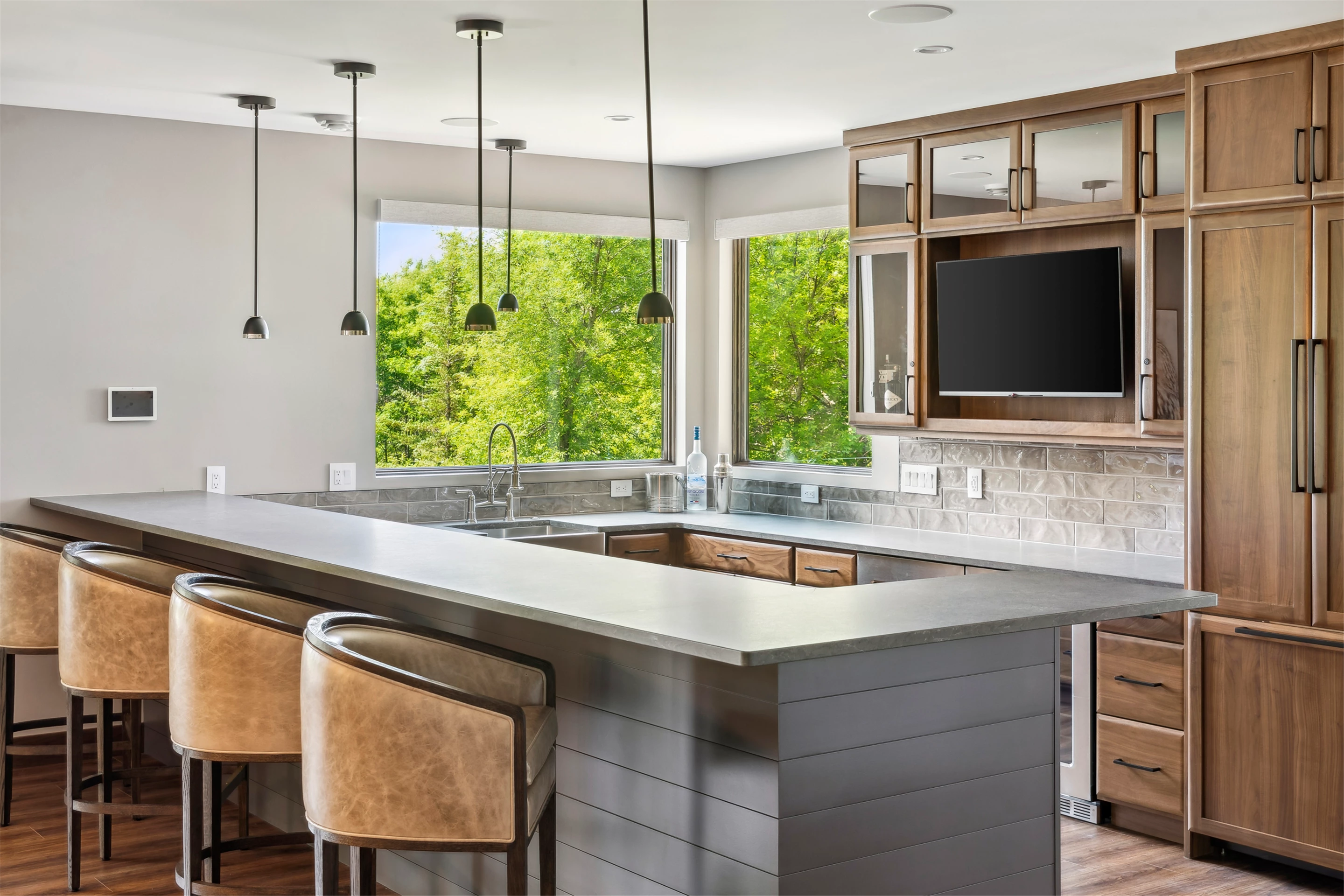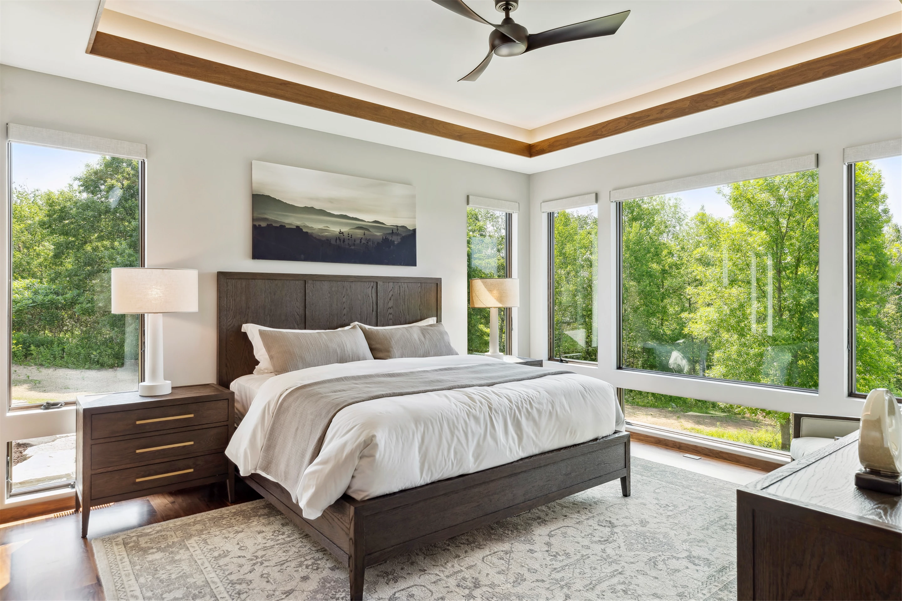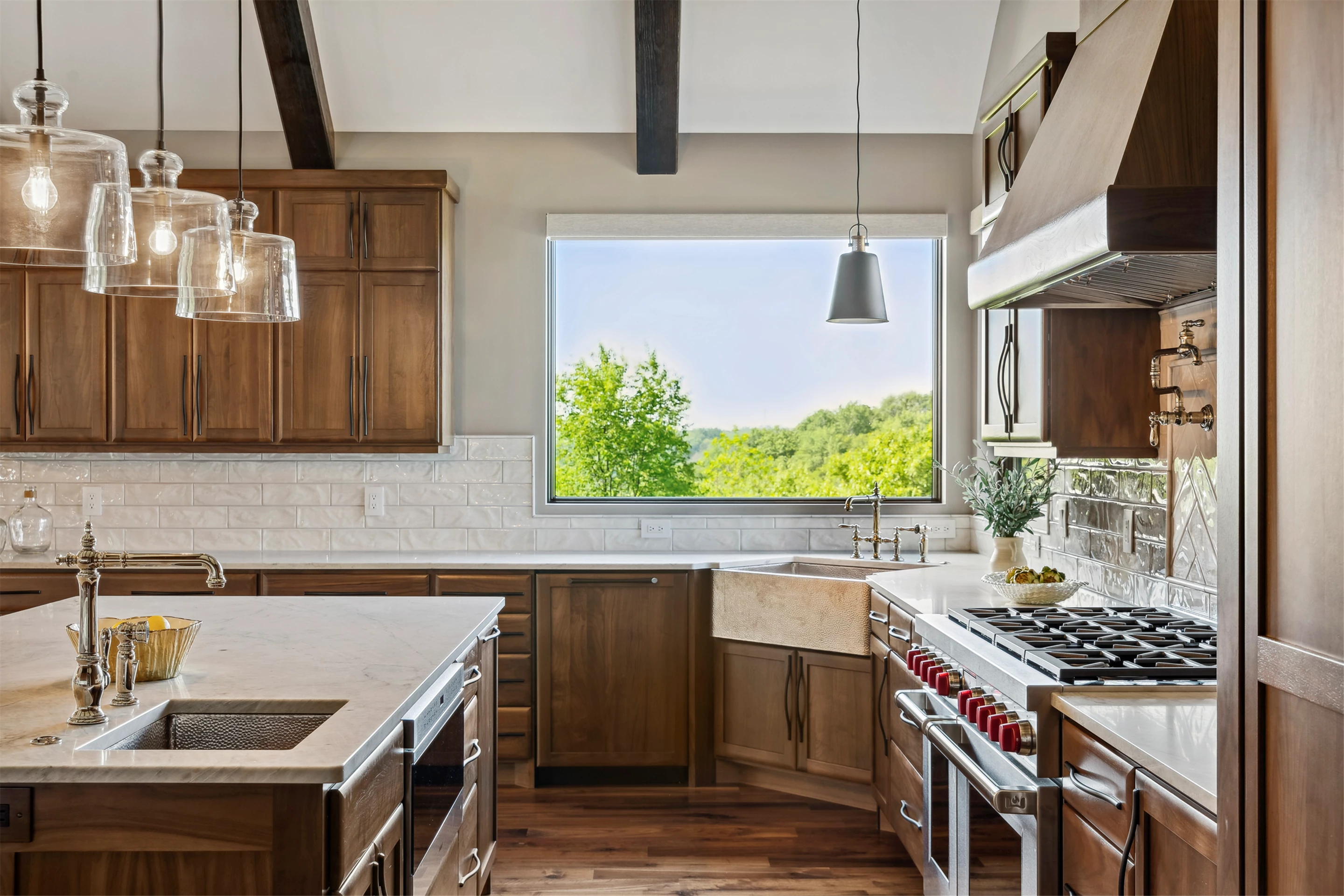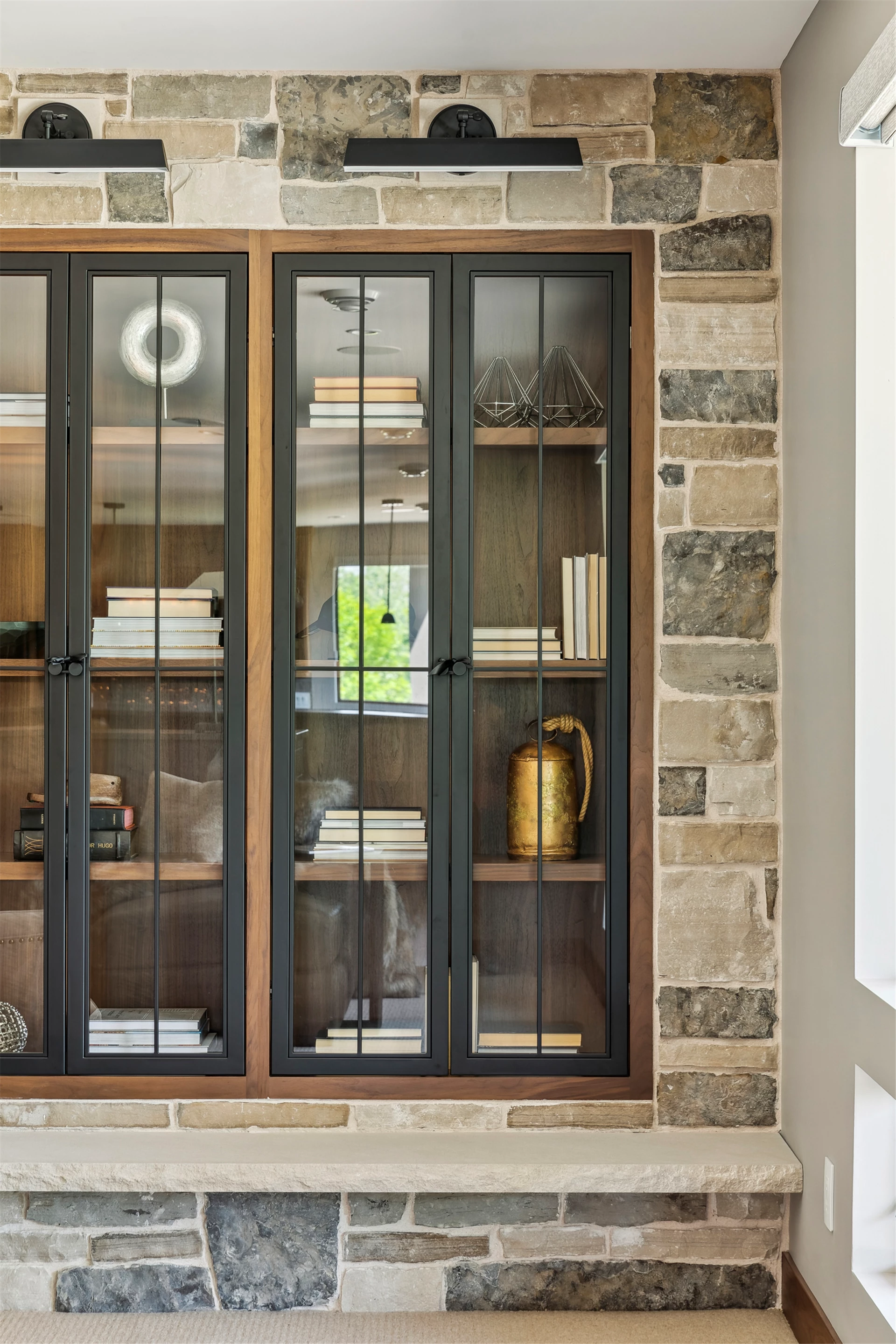 Come see the Enchanted Forest Chalet during the 2023 Artisan Home Tour! Situated on 315 acres of wooded land on the bluffs of the Mississippi River, this six-bedroom, seven-bathroom, 8,119-square-foot new build in Prescott, Wisconsin, is a private escape with quick access to the Twin Cities. The Enchanted Forest Chalet comes to life with exterior materials that include James Hardie Black Ash and Aged Pewter siding; a cedar vaulted entry with decorative brackets and truss work; and a stone-blend board and batten. Inside, this aesthetic translates to arched windows, walnut flooring and doors, and vaulted ceilings in the great room and kitchen, finished with walnut cabinetry and natural quartzite countertops. The primary suite on the main level features a beamed box-vaulted ceiling, a stone-clad gas fireplace, and a private deck. The bath is a private oasis, with a freestanding tub and walk-in shower. The custom walnut closet system connects the laundry achieving a walk-through layout. There are ample opportunities to appreciate the property’s streams and hillsides, from a four-season porch with a gas fireplace and stone surround to the paver patio with space for al fresco dining and quiet conversations around a wood-burning fireplace.