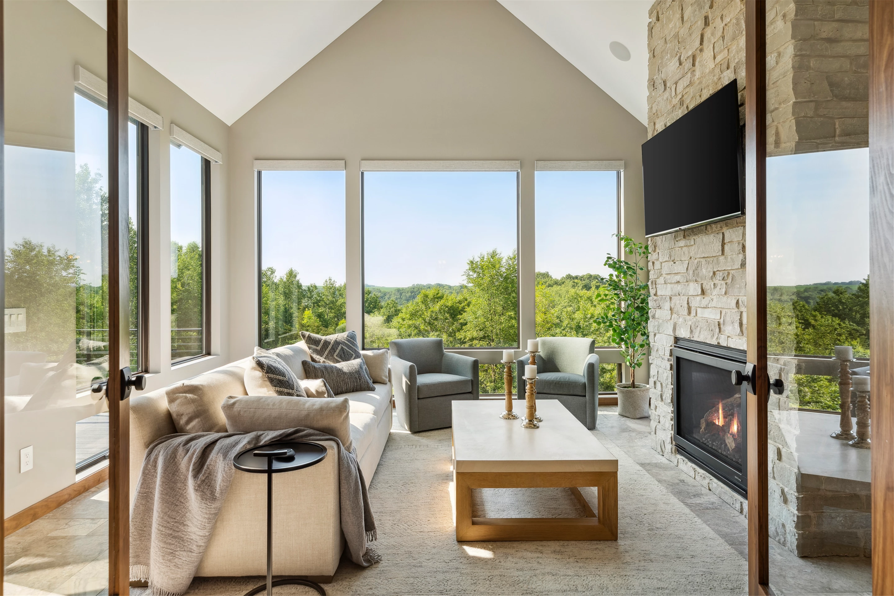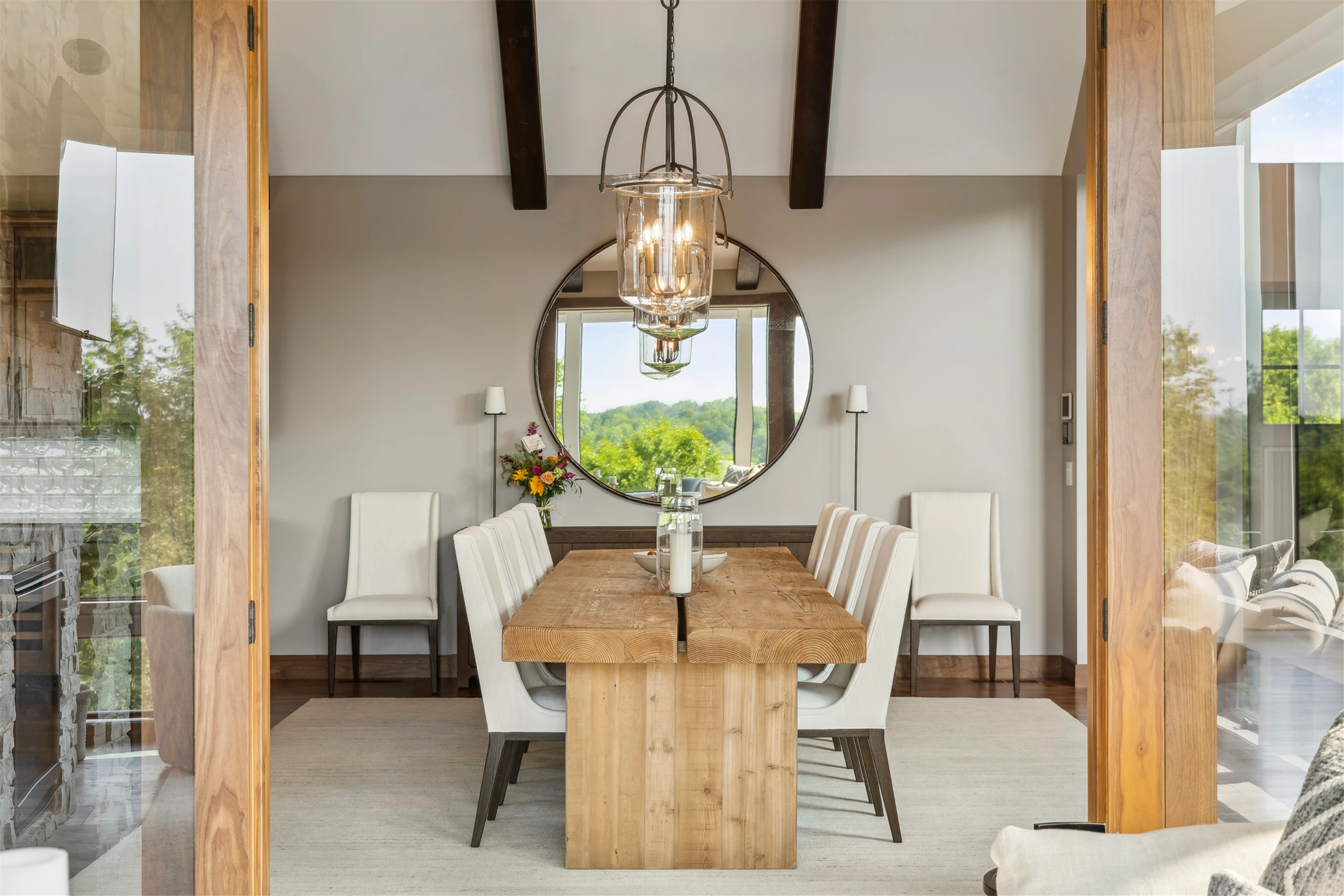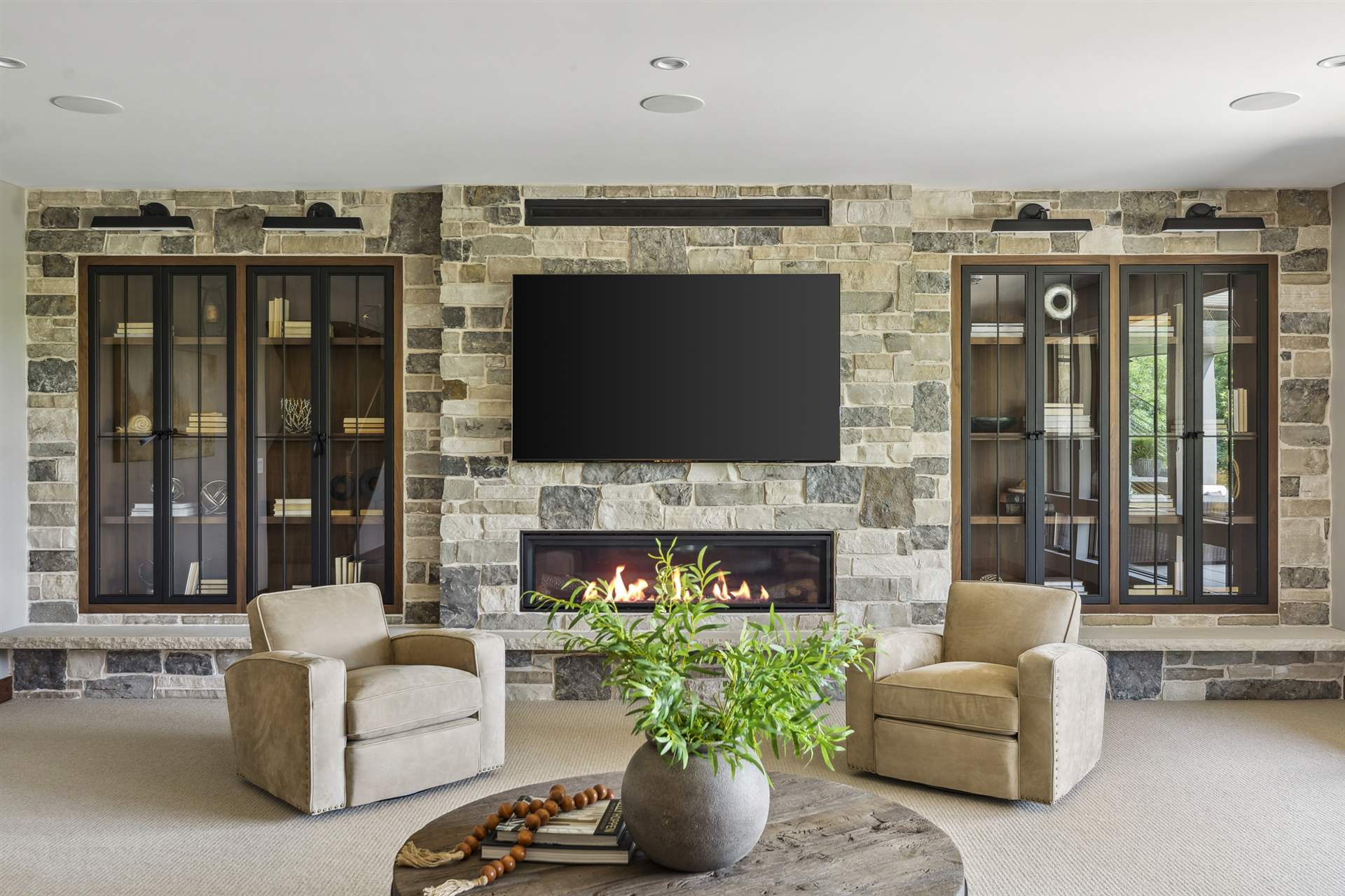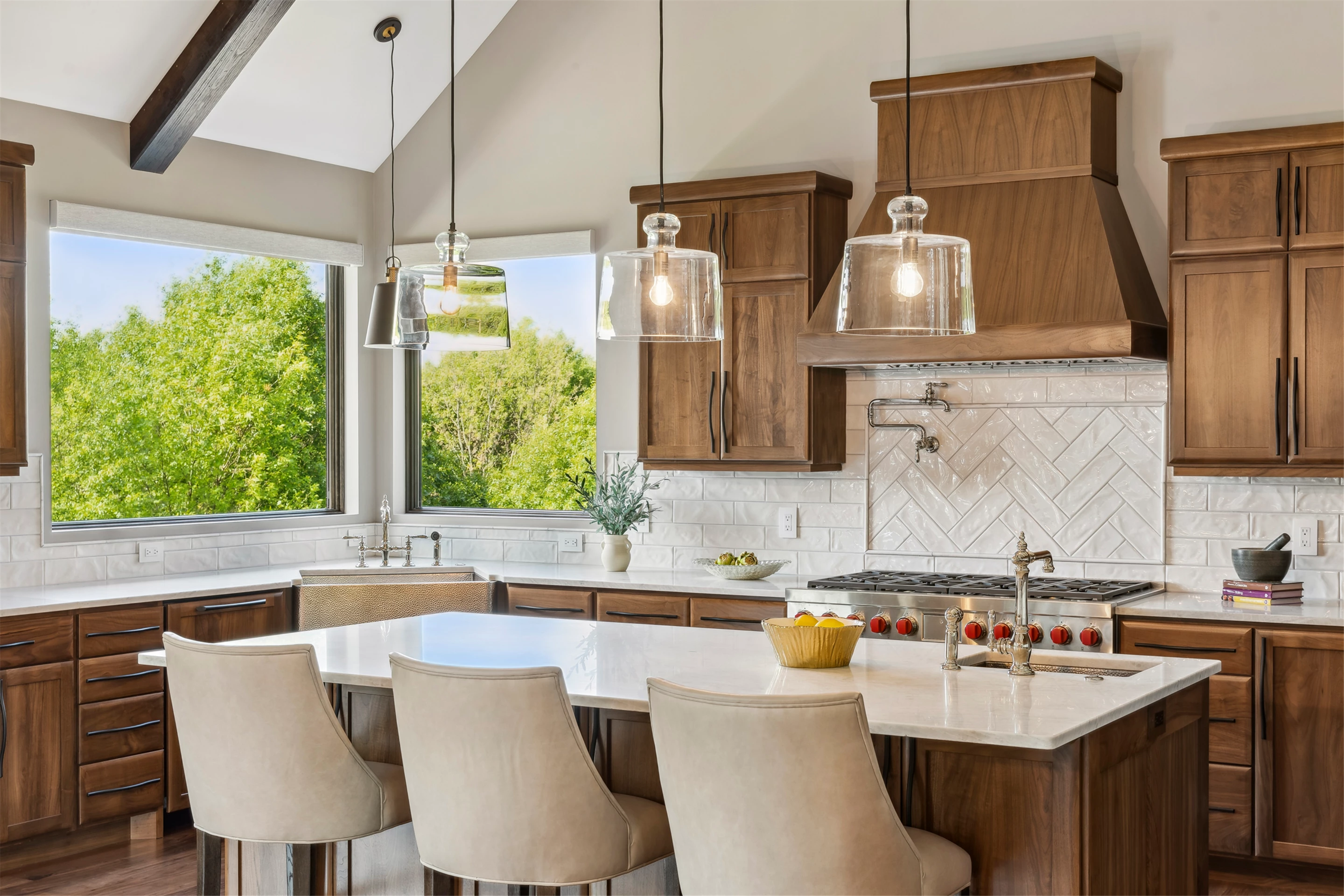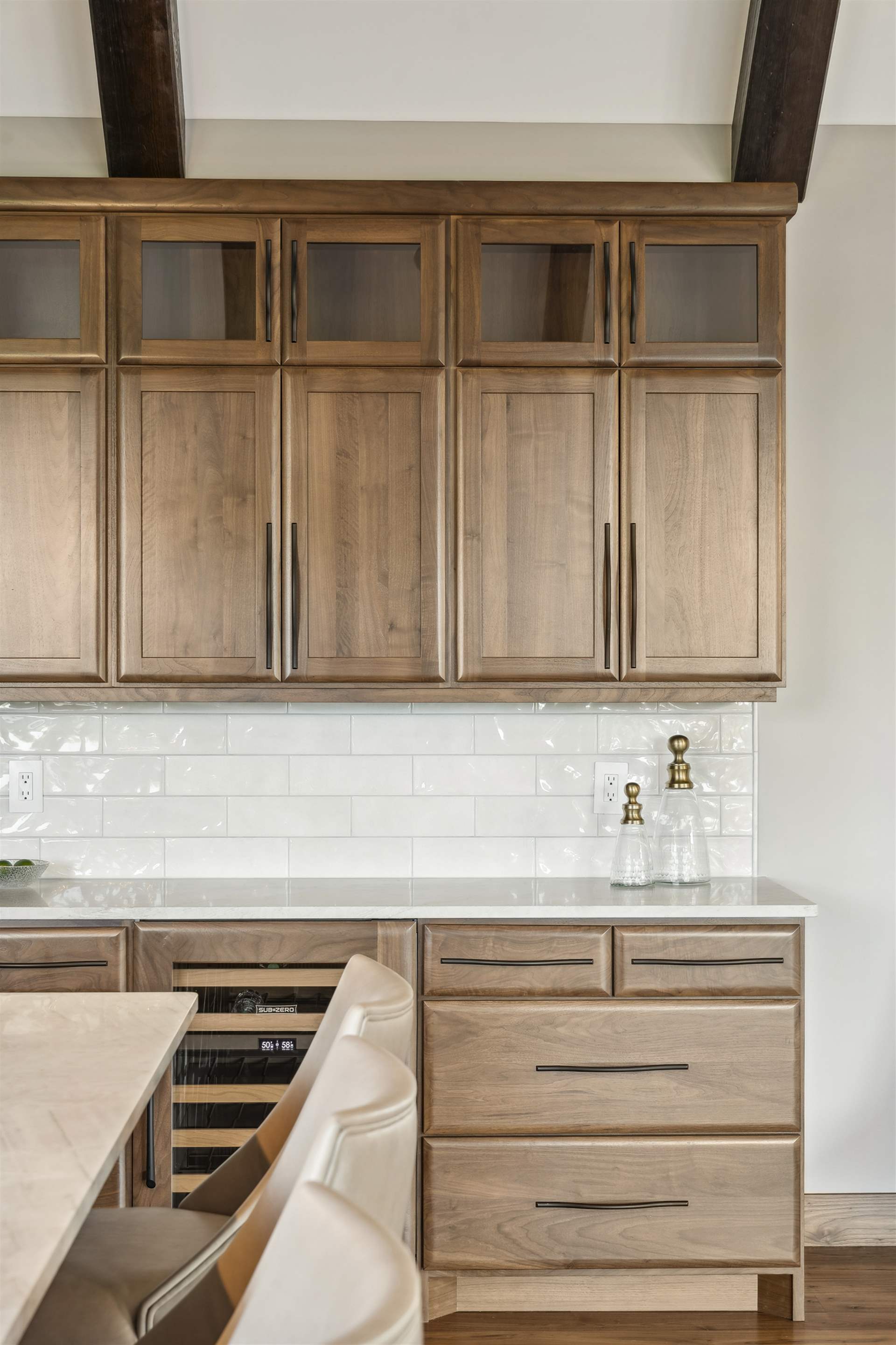 Come see the Enchanted Forest Chalet during the 2023 Artisan Home Tour! Situated on 315 acres of wooded land on the bluffs of the Mississippi River, this six-bedroom, seven-bathroom, 8,119-square-foot new build in Prescott, Wisconsin, is a private escape with quick access to the Twin Cities. The Enchanted Forest Chalet comes to life with exterior materials that include James Hardie Black Ash and Aged Pewter siding; a cedar vaulted entry with decorative brackets and truss work; and a stone-blend board and batten. Inside, this aesthetic translates to arched windows, walnut flooring and doors, and vaulted ceilings in the great room and kitchen, finished with walnut cabinetry and natural quartzite countertops. The primary suite on the main level features a beamed box-vaulted ceiling, a stone-clad gas fireplace, and a private deck. The bath is a private oasis, with a freestanding tub and walk-in shower. The custom walnut closet system connects the laundry achieving a walk-through layout. There are ample opportunities to appreciate the property’s streams and hillsides, from a four-season porch with a gas fireplace and stone surround to the paver patio with space for al fresco dining and quiet conversations around a wood-burning fireplace.