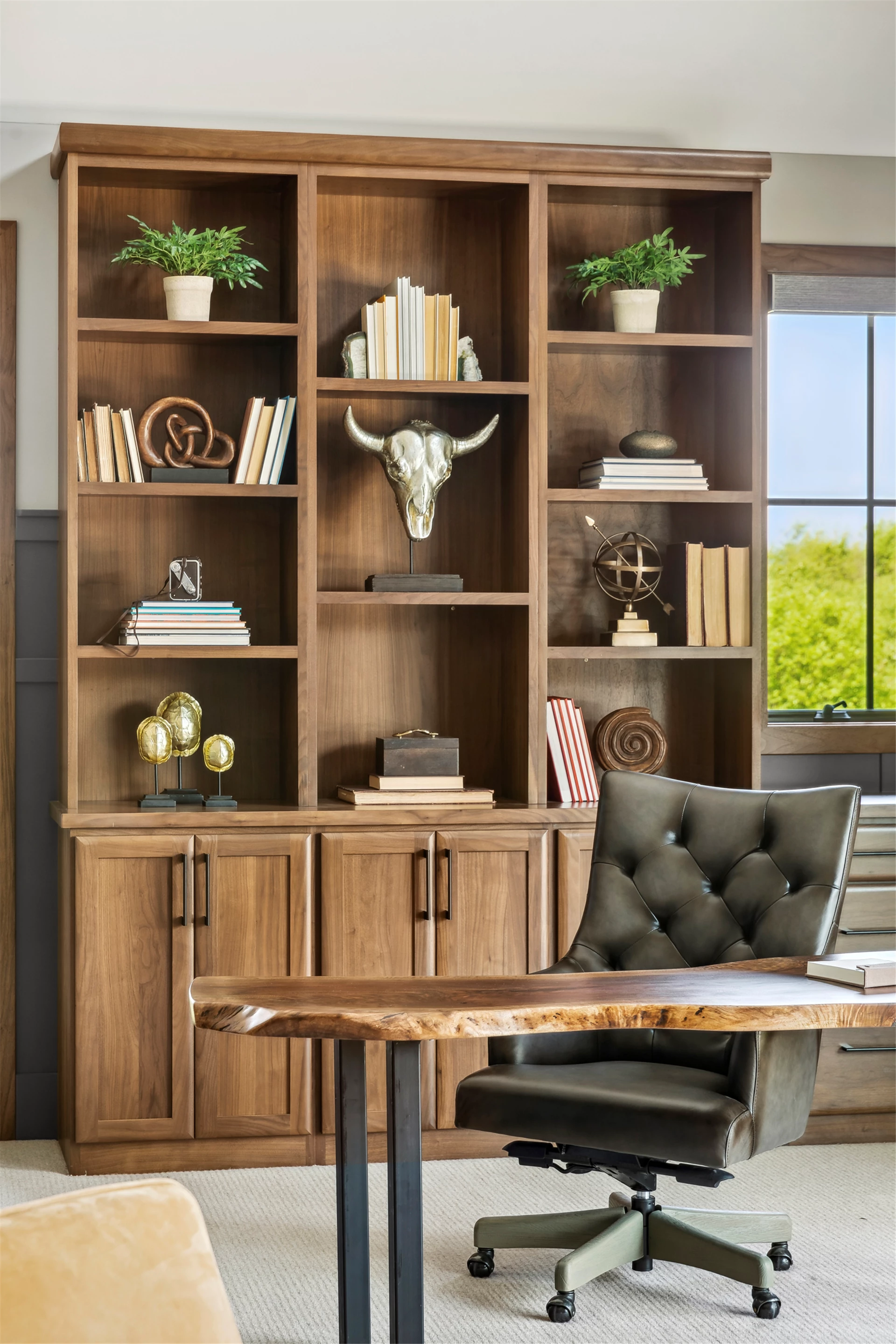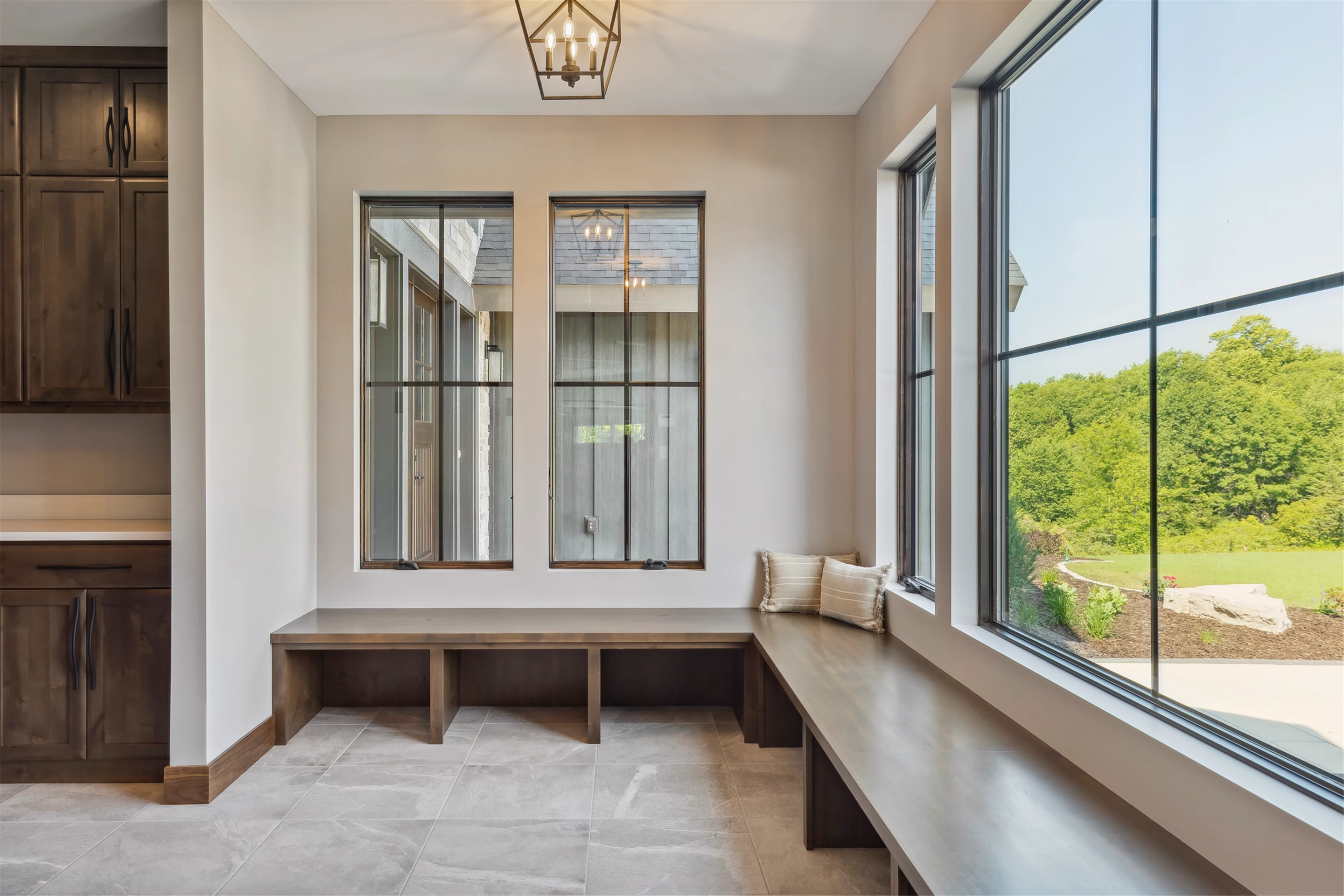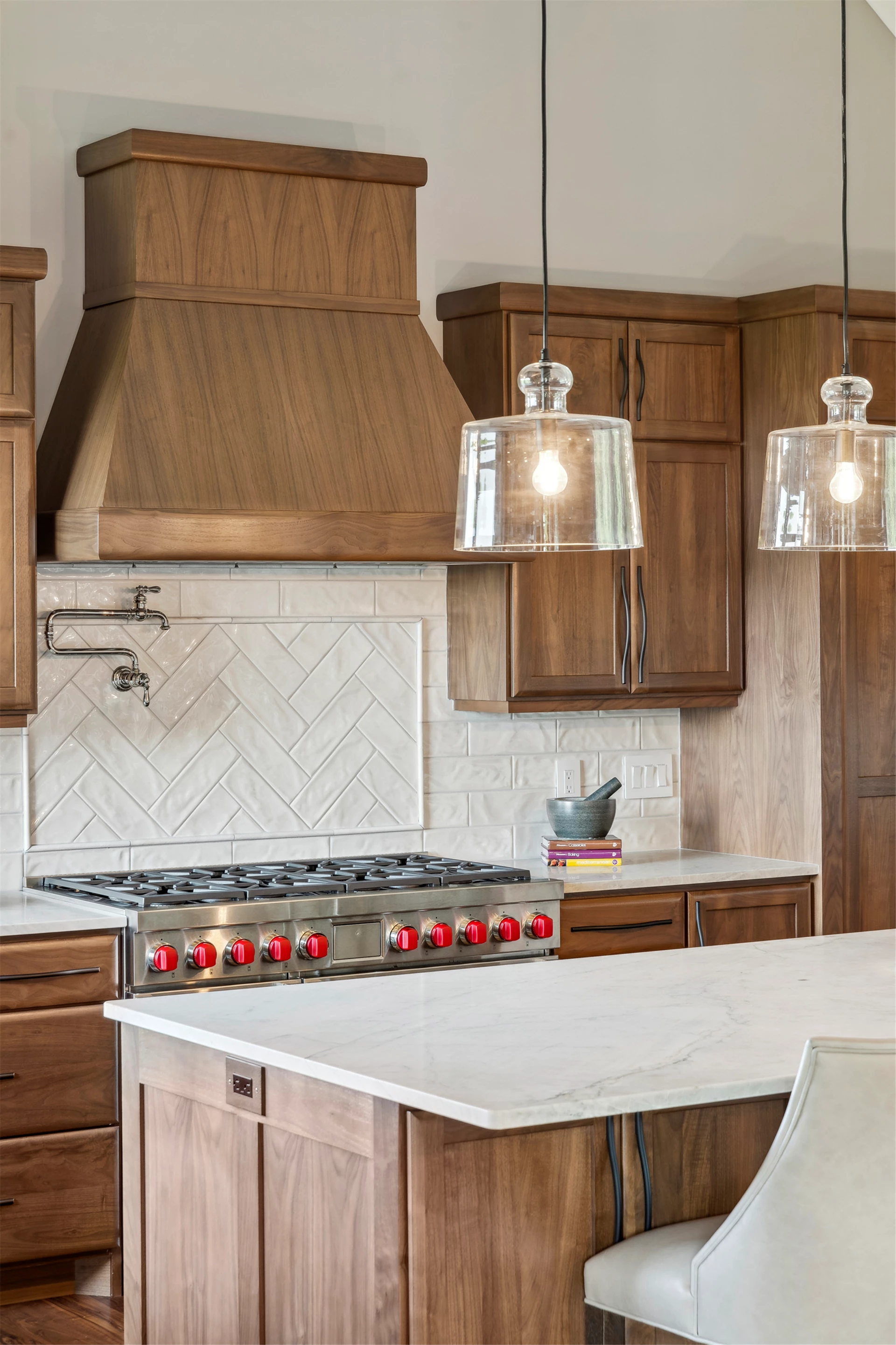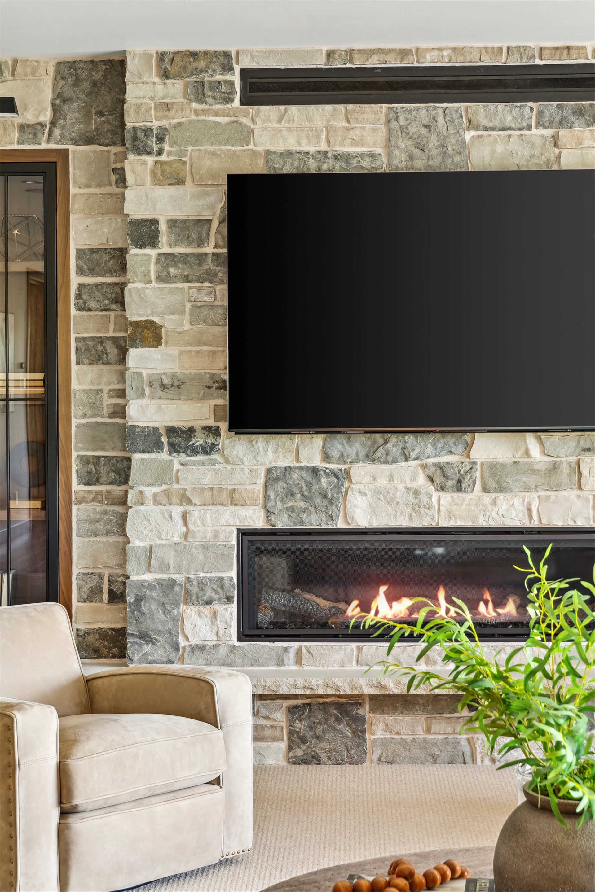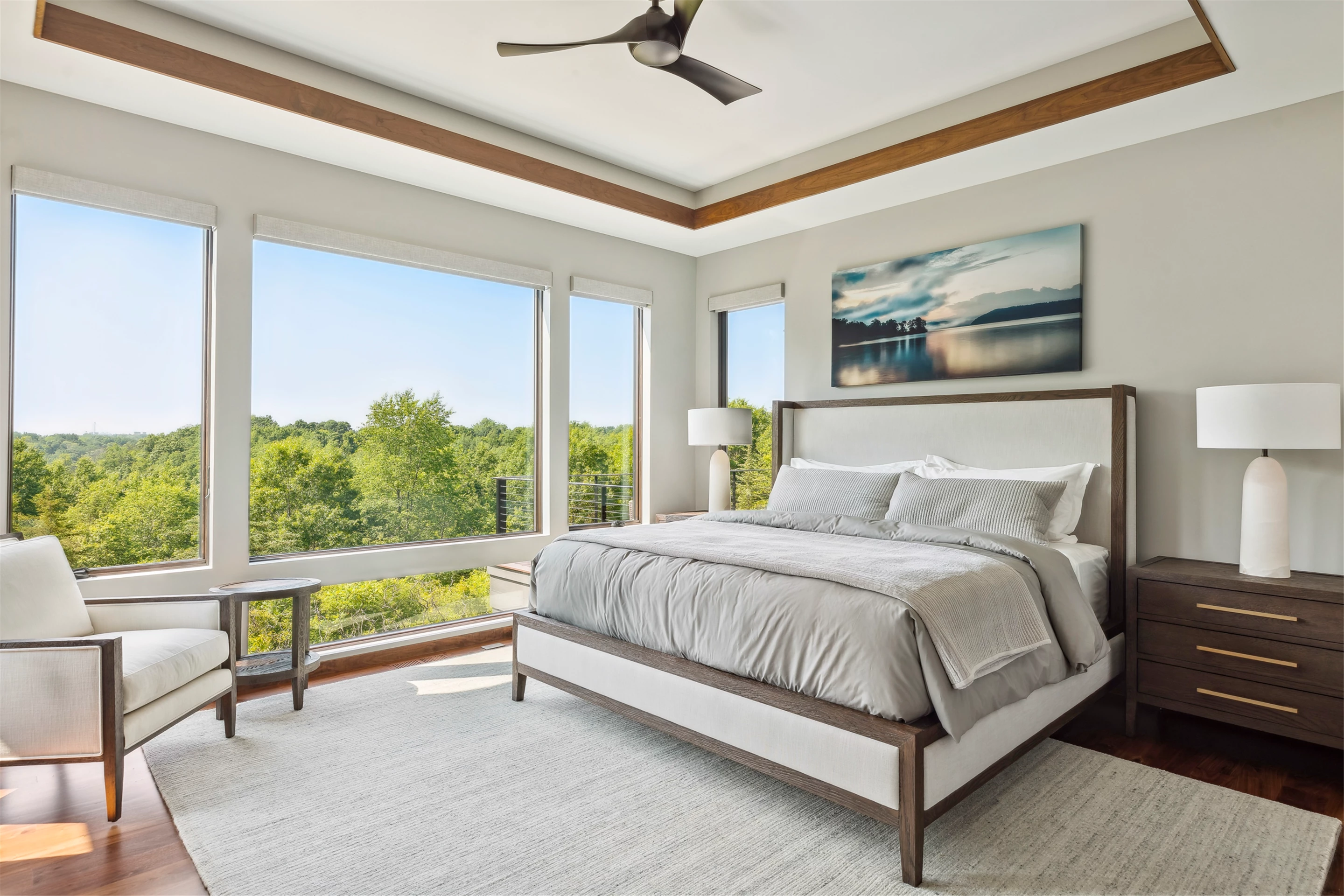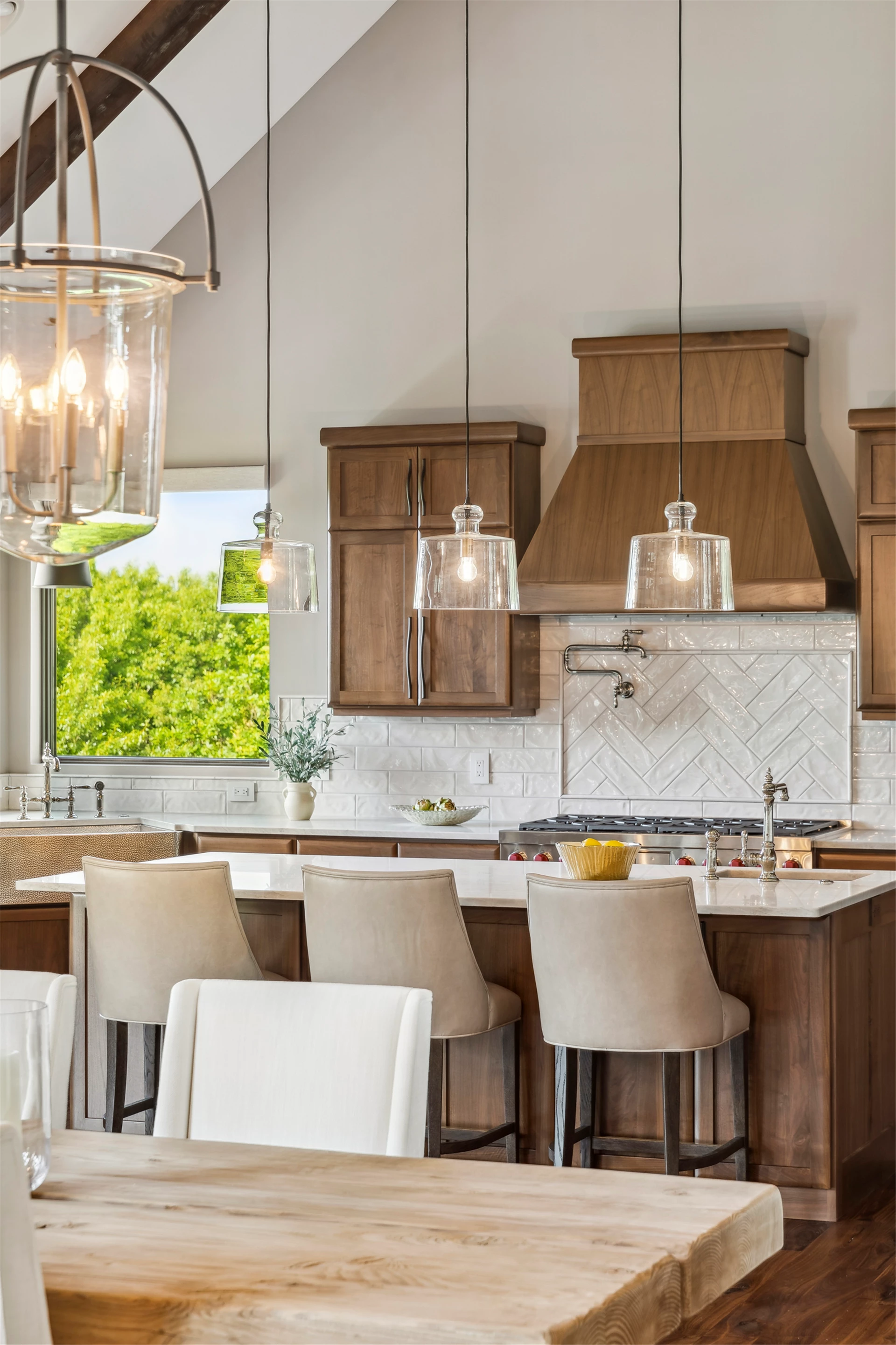 Come see the Enchanted Forest Chalet during the 2023 Artisan Home Tour! Situated on 315 acres of wooded land on the bluffs of the Mississippi River, this six-bedroom, seven-bathroom, 8,119-square-foot new build in Prescott, Wisconsin, is a private escape with quick access to the Twin Cities. The Enchanted Forest Chalet comes to life with exterior materials that include James Hardie Black Ash and Aged Pewter siding; a cedar vaulted entry with decorative brackets and truss work; and a stone-blend board and batten. Inside, this aesthetic translates to arched windows, walnut flooring and doors, and vaulted ceilings in the great room and kitchen, finished with walnut cabinetry and natural quartzite countertops. The primary suite on the main level features a beamed box-vaulted ceiling, a stone-clad gas fireplace, and a private deck. The bath is a private oasis, with a freestanding tub and walk-in shower. The custom walnut closet system connects the laundry achieving a walk-through layout. There are ample opportunities to appreciate the property’s streams and hillsides, from a four-season porch with a gas fireplace and stone surround to the paver patio with space for al fresco dining and quiet conversations around a wood-burning fireplace.