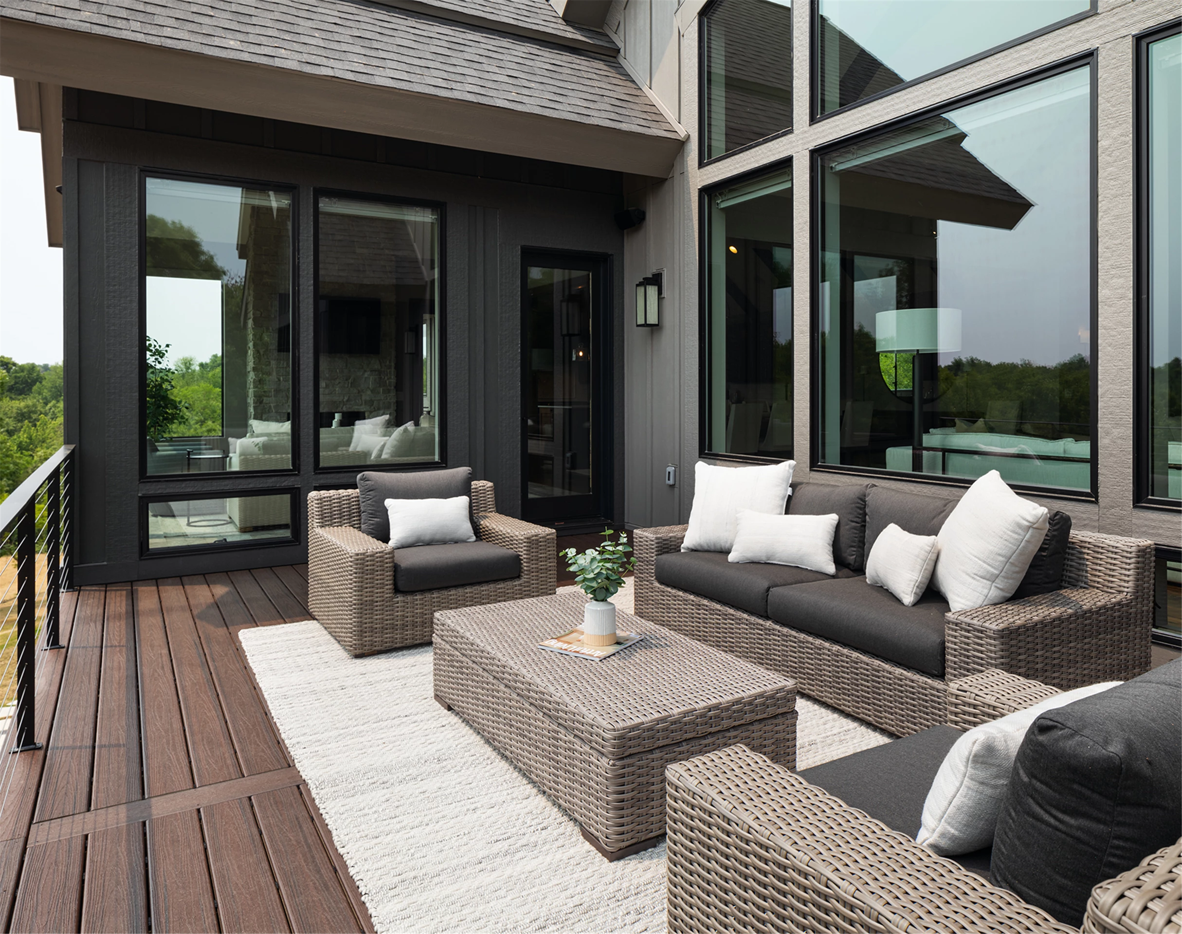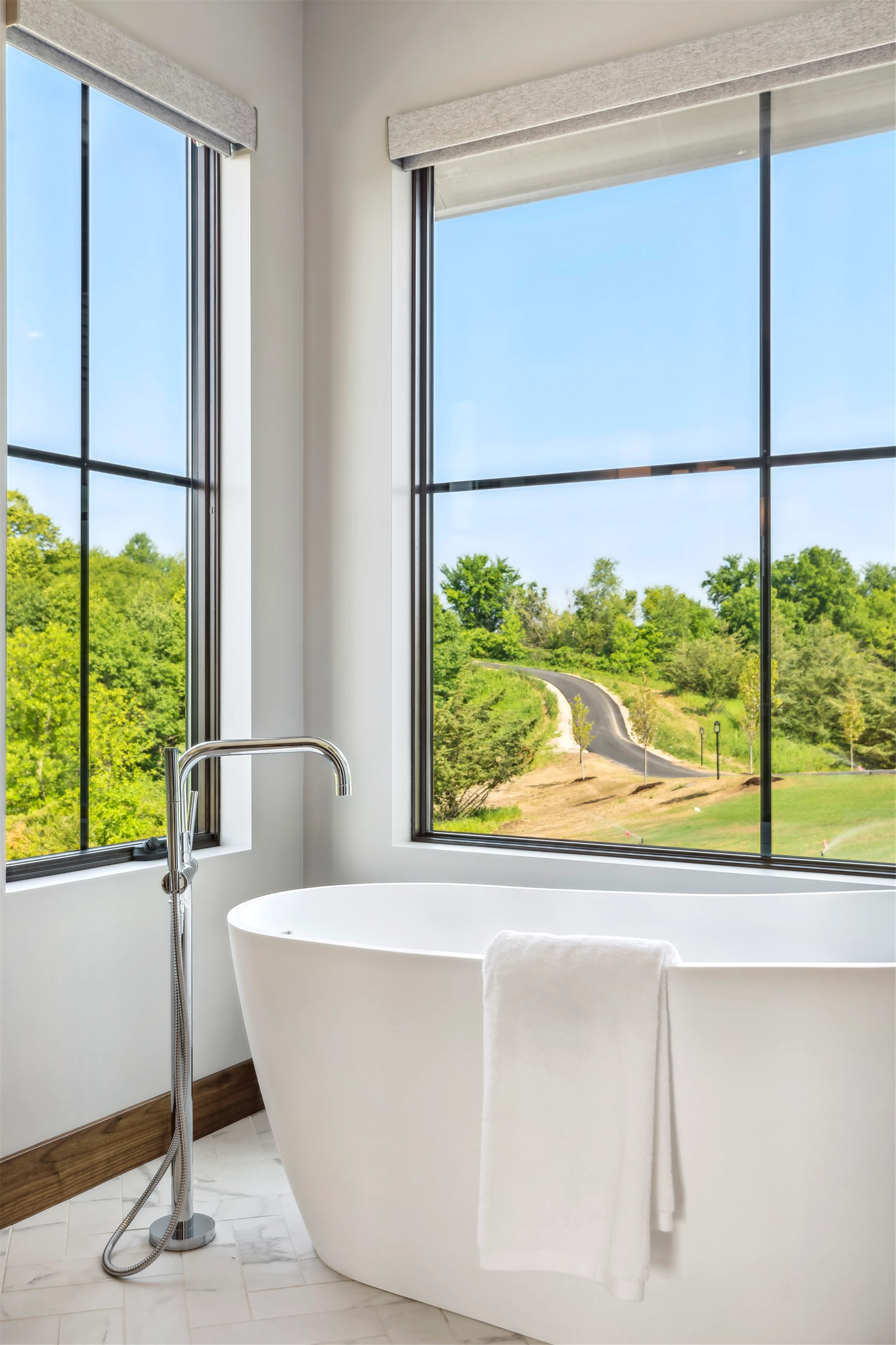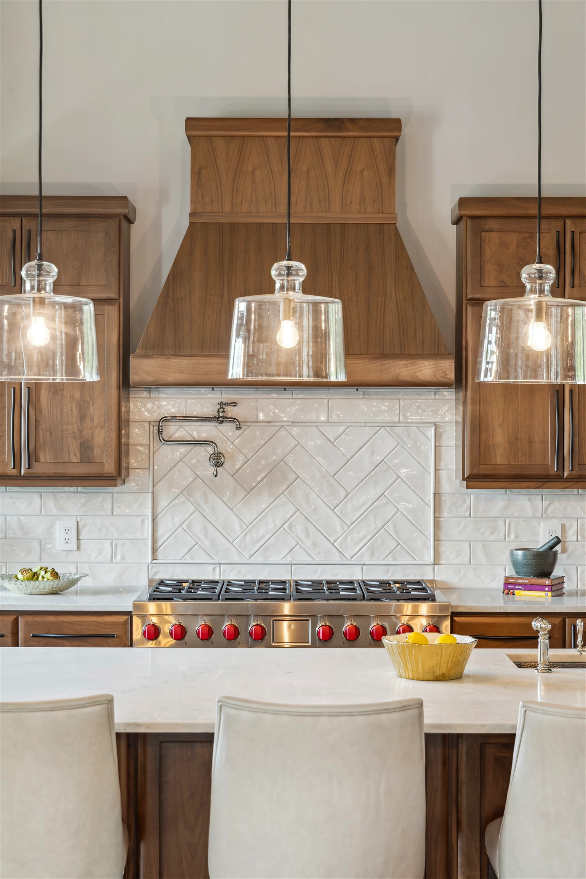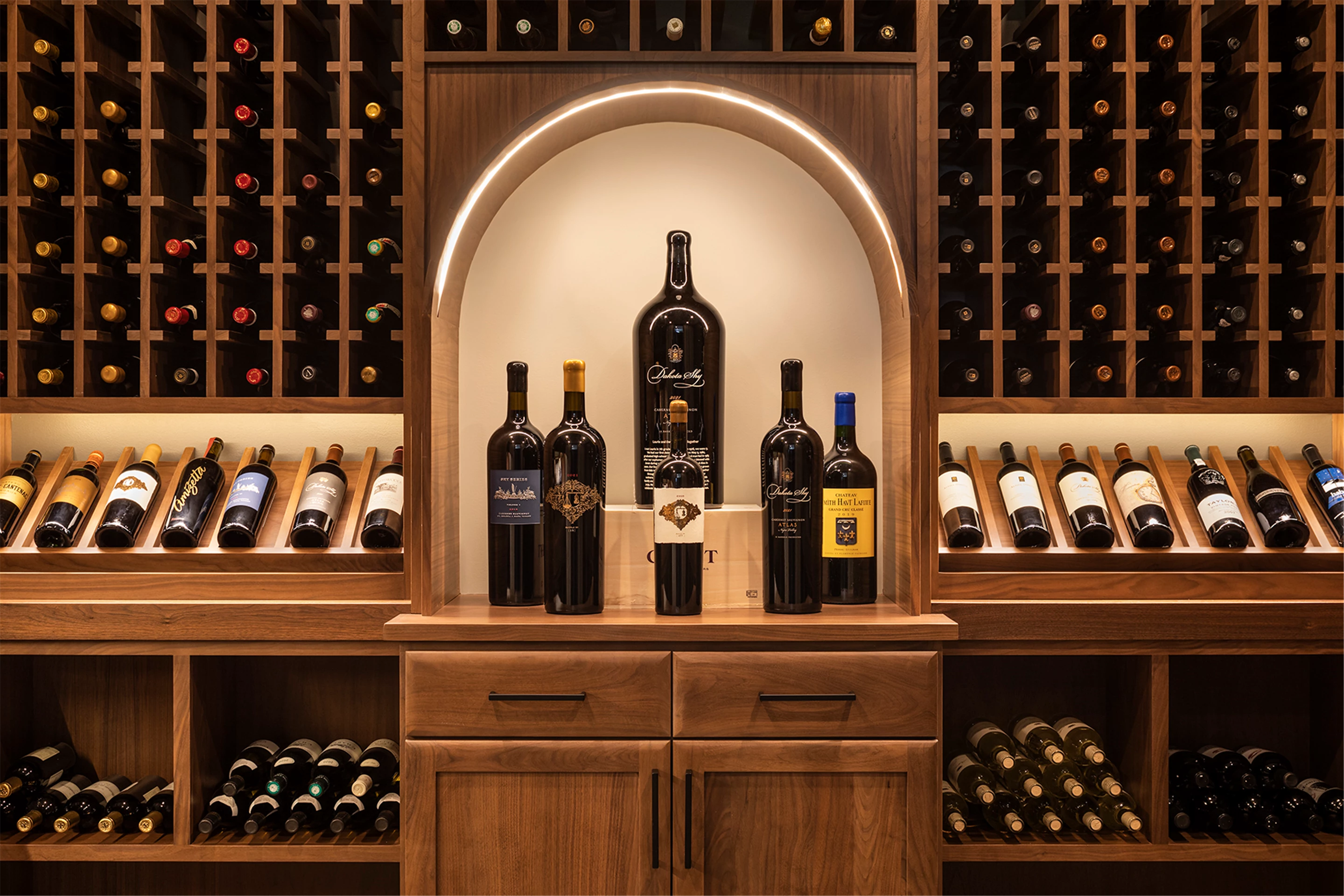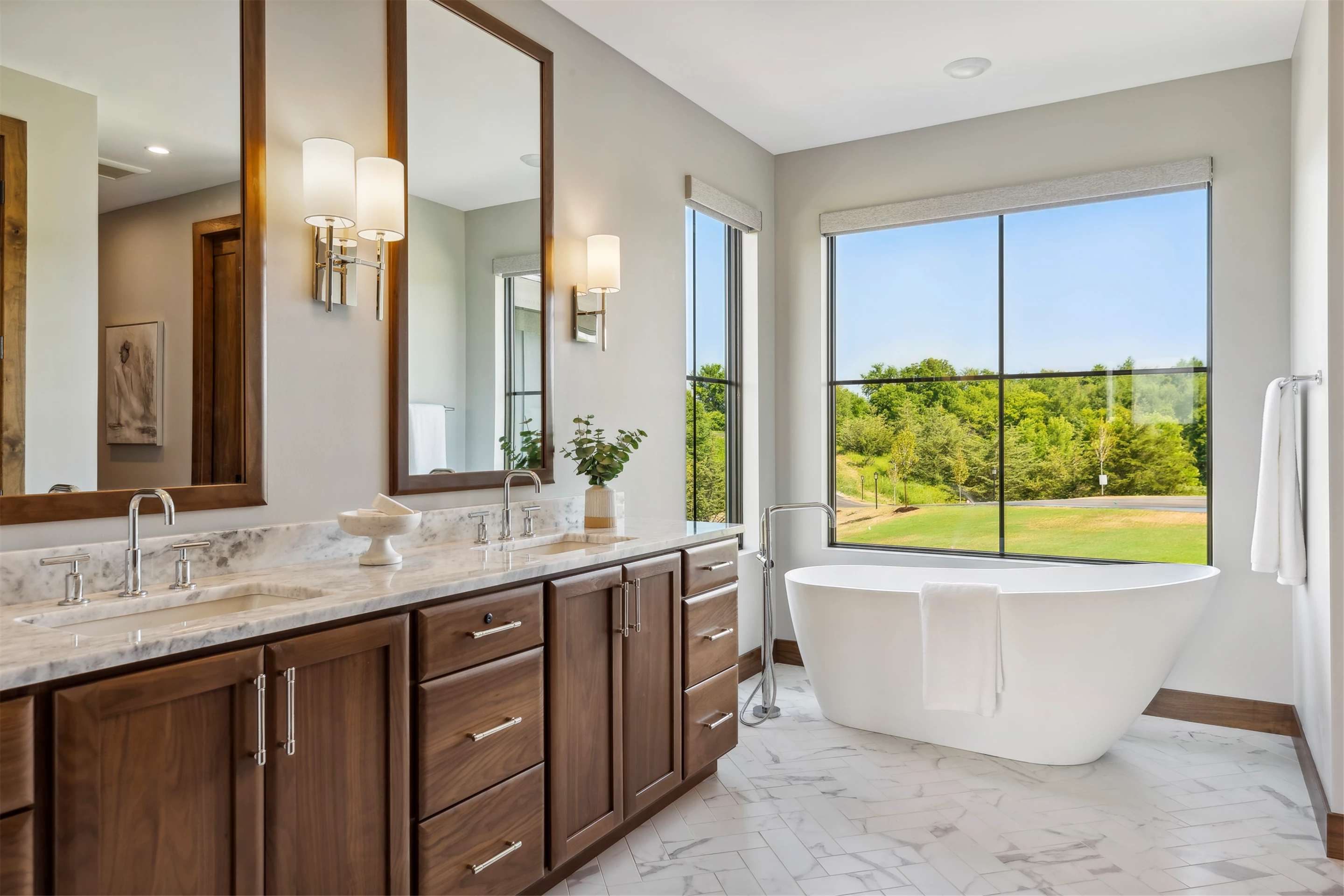 Come see the Enchanted Forest Chalet during the 2023 Artisan Home Tour! Situated on 315 acres of wooded land on the bluffs of the Mississippi River, this six-bedroom, seven-bathroom, 8,119-square-foot new build in Prescott, Wisconsin, is a private escape with quick access to the Twin Cities. The Enchanted Forest Chalet comes to life with exterior materials that include James Hardie Black Ash and Aged Pewter siding; a cedar vaulted entry with decorative brackets and truss work; and a stone-blend board and batten. Inside, this aesthetic translates to arched windows, walnut flooring and doors, and vaulted ceilings in the great room and kitchen, finished with walnut cabinetry and natural quartzite countertops. The primary suite on the main level features a beamed box-vaulted ceiling, a stone-clad gas fireplace, and a private deck. The bath is a private oasis, with a freestanding tub and walk-in shower. The custom walnut closet system connects the laundry achieving a walk-through layout. There are ample opportunities to appreciate the property’s streams and hillsides, from a four-season porch with a gas fireplace and stone surround to the paver patio with space for al fresco dining and quiet conversations around a wood-burning fireplace.