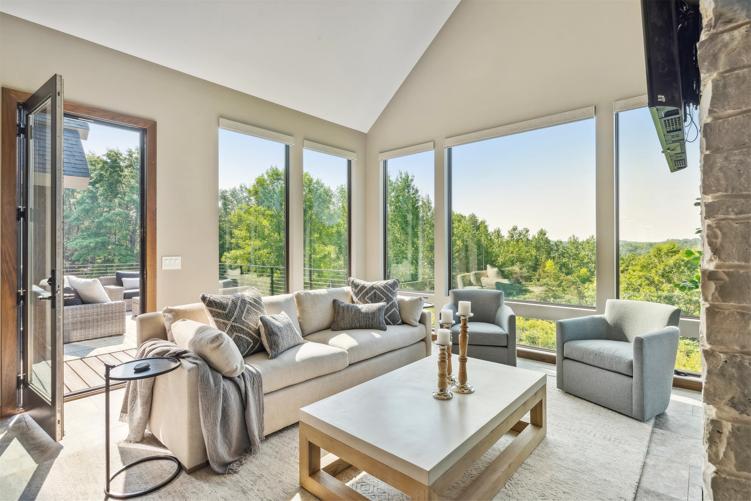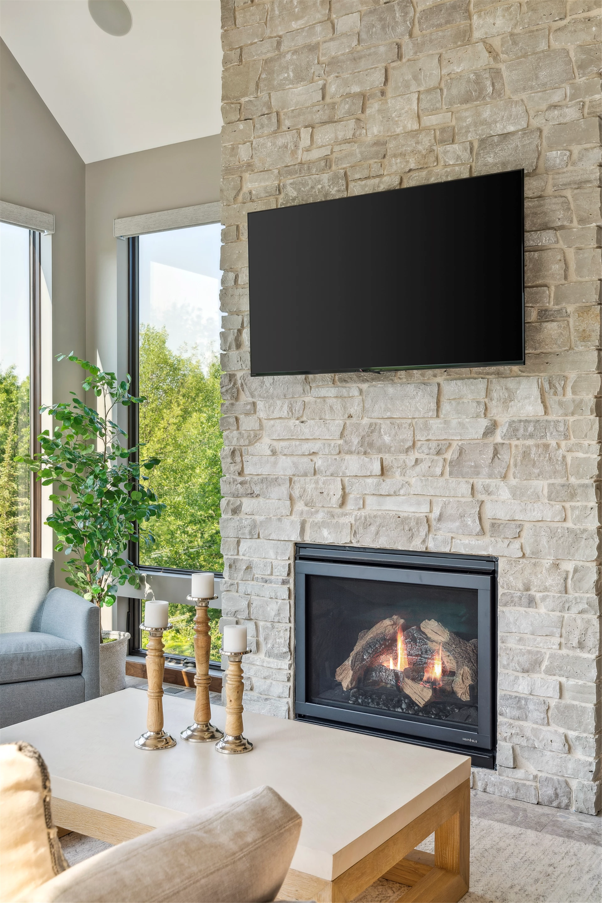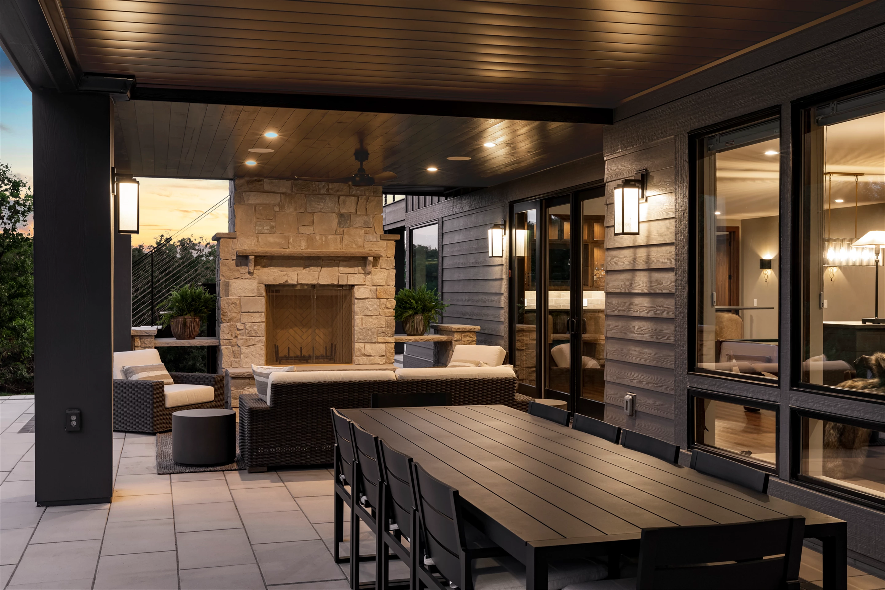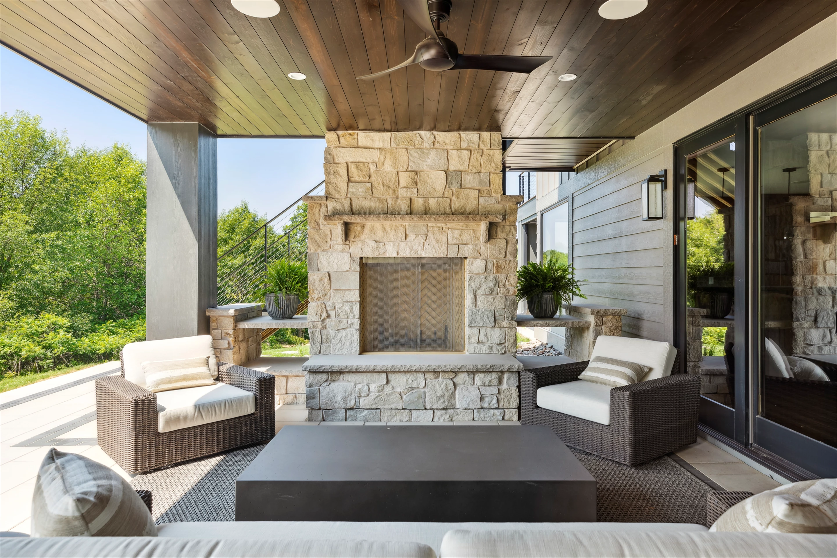The Enchanted Forest Chalet is a stunning home that features beautiful outdoor living spaces. This breathtaking space includes a cozy dining and seating area centered around a magnificent stone fireplace, providing the perfect ambiance for a relaxing evening. With various designated fireplace areas throughout the home, guests can take in the peaceful atmosphere of the enchanted forest while relaxing and enjoying each other's company. End your day with a tranquil evening nestled around the fire, enjoying the breathtaking environment.
