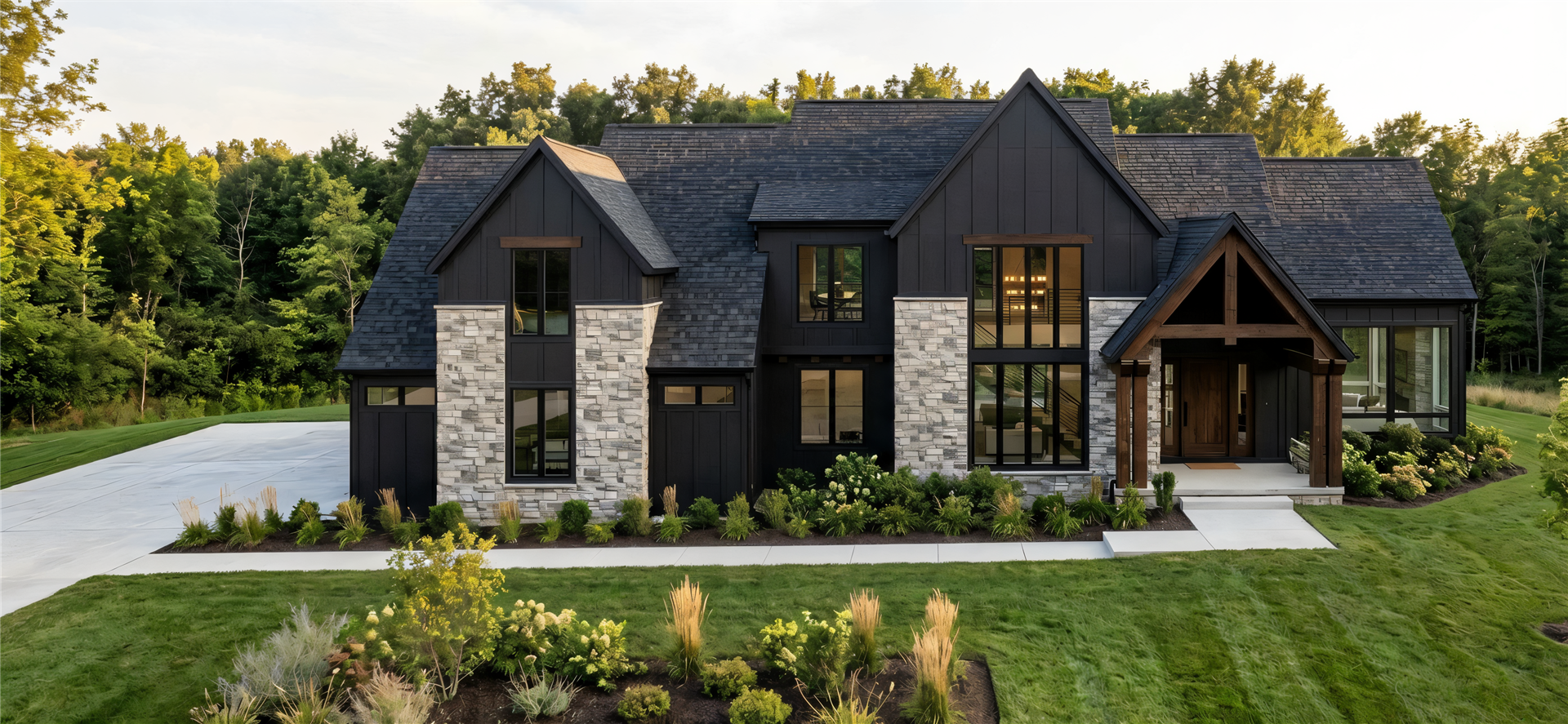 The exterior makes a dramatic first impression with deep black siding accented by natural stone and richly stained white pine details above the windows. Timber truss work and columns frame the front entrance, setting the tone for the home’s blend of rustic character and modern design. Slatted wood detailing on the front porch wall and gable carries seamlessly through the entry and into the interior, reinforcing the home’s cohesive architectural language.