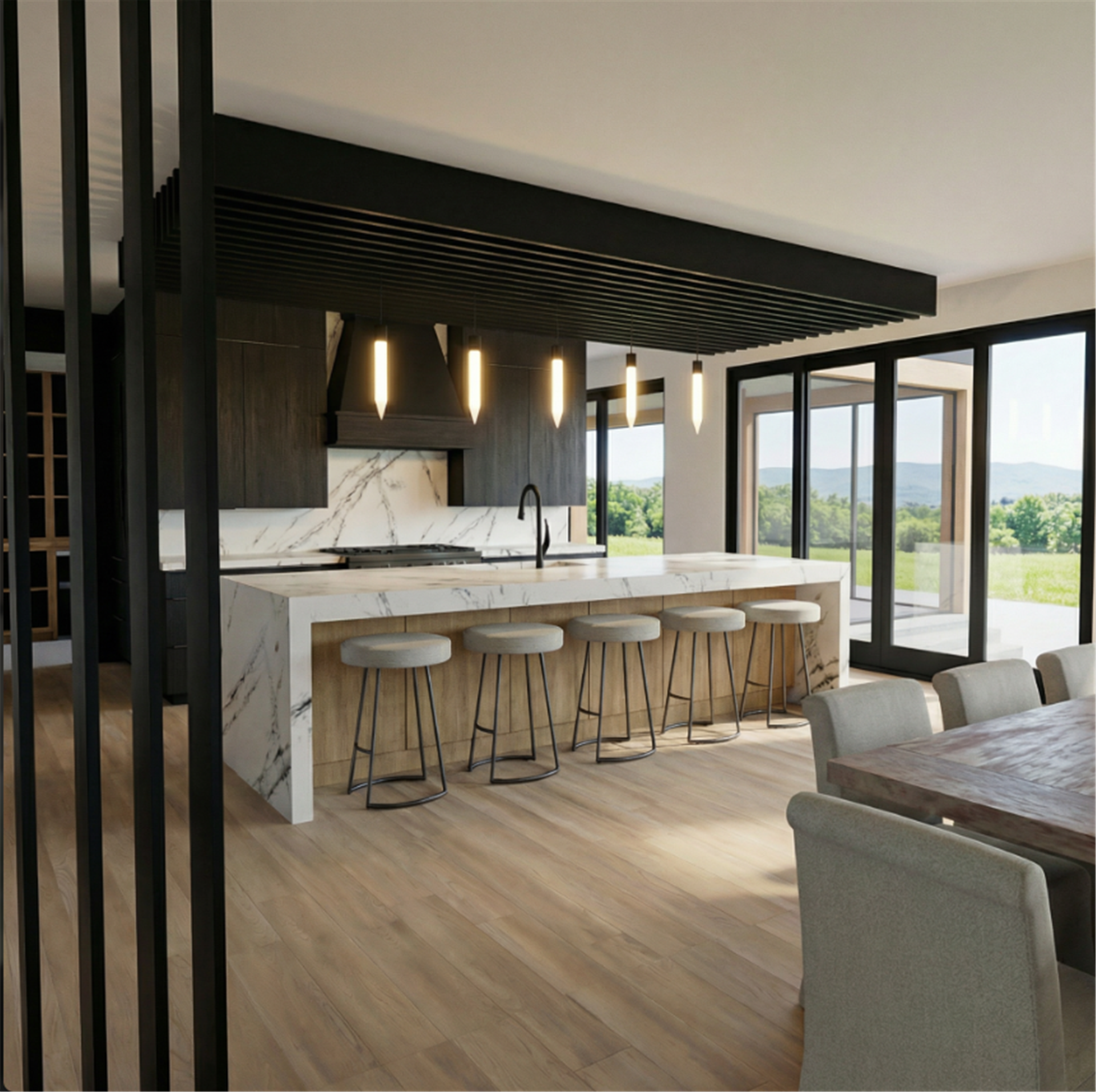 Striking black windows, millwork, and doors frame views and provide bold contrast throughout the home. The kitchen continues the modern aesthetic with black-stained clear alder and white oak Euro-style cabinetry paired with Cambria countertops. Just beyond, a small bar and wine cabinet sits conveniently at the entrance to the rear covered patio, making entertaining effortless.