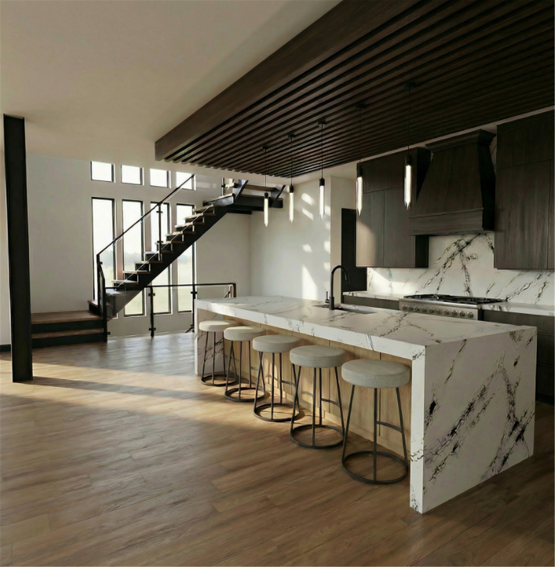 A dramatic floating steel staircase with wood treads becomes a sculptural centerpiece, visually connecting all three levels. Open from the second floor to the lower level, the custom steel stair system enhances the home’s sense of openness and architectural drama.