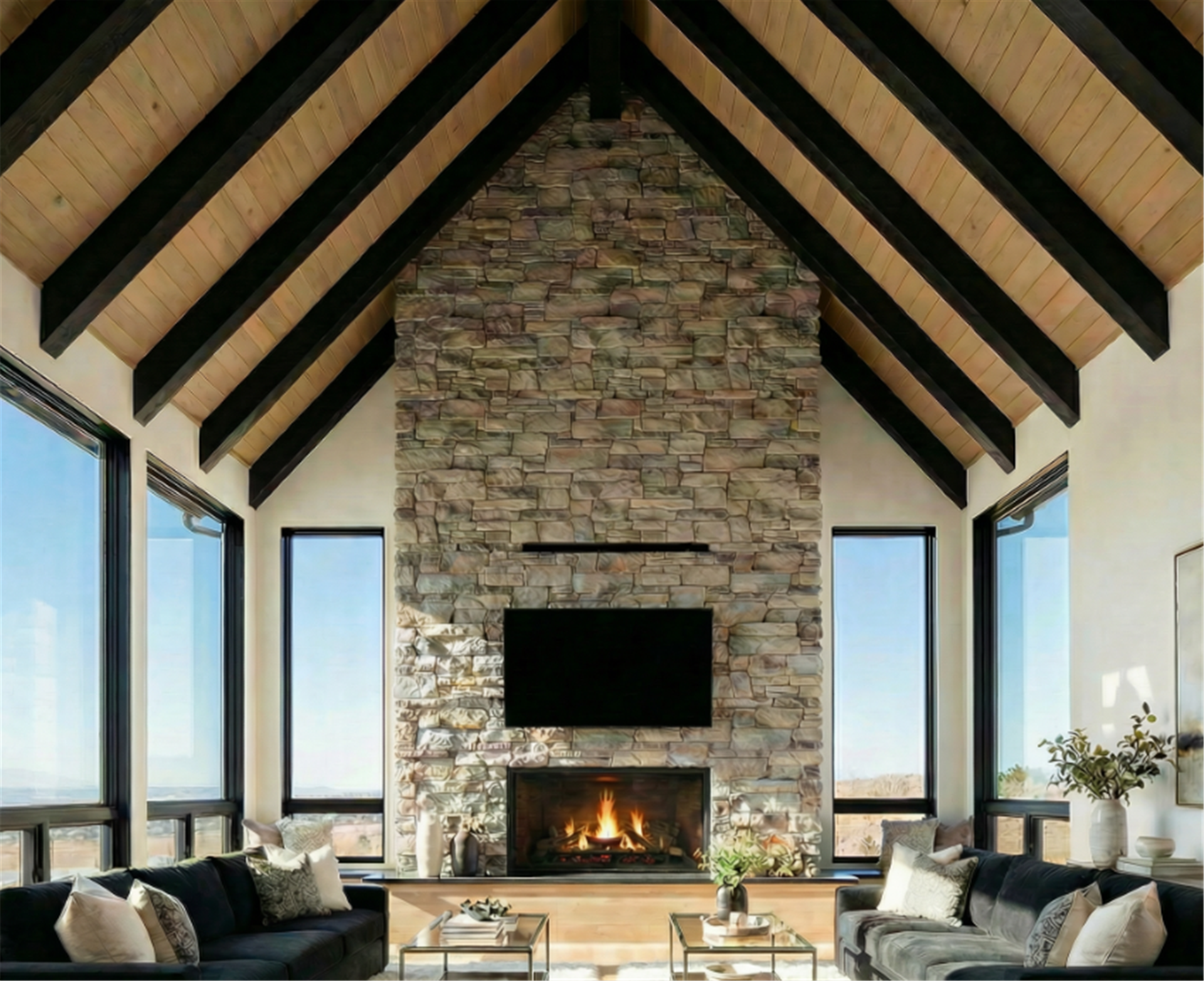Inside, white oak flooring finished with Nordic Seal creates a raw, natural appearance that complements the home’s organic palette. The great room is designed to impress, featuring soaring vaulted ceilings with black beams set against an ash-planked backdrop. A full stone fireplace anchors the space, while a sunken conversation area adds a unique architectural element that encourages gathering and relaxation.