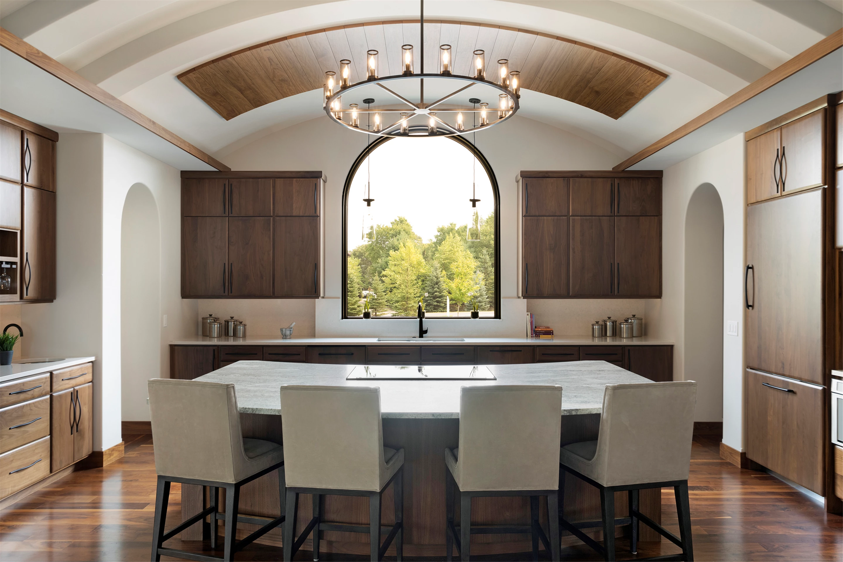 The Modern Mediterranean offers a beautiful, luxury experience with its curved architecture, stunning walnut finishes, exquisite stone work, and unparalleled views of the St. Croix Valley. With its calming atmosphere, this backyard is the perfect spot to relax and enjoy the beauty of nature.