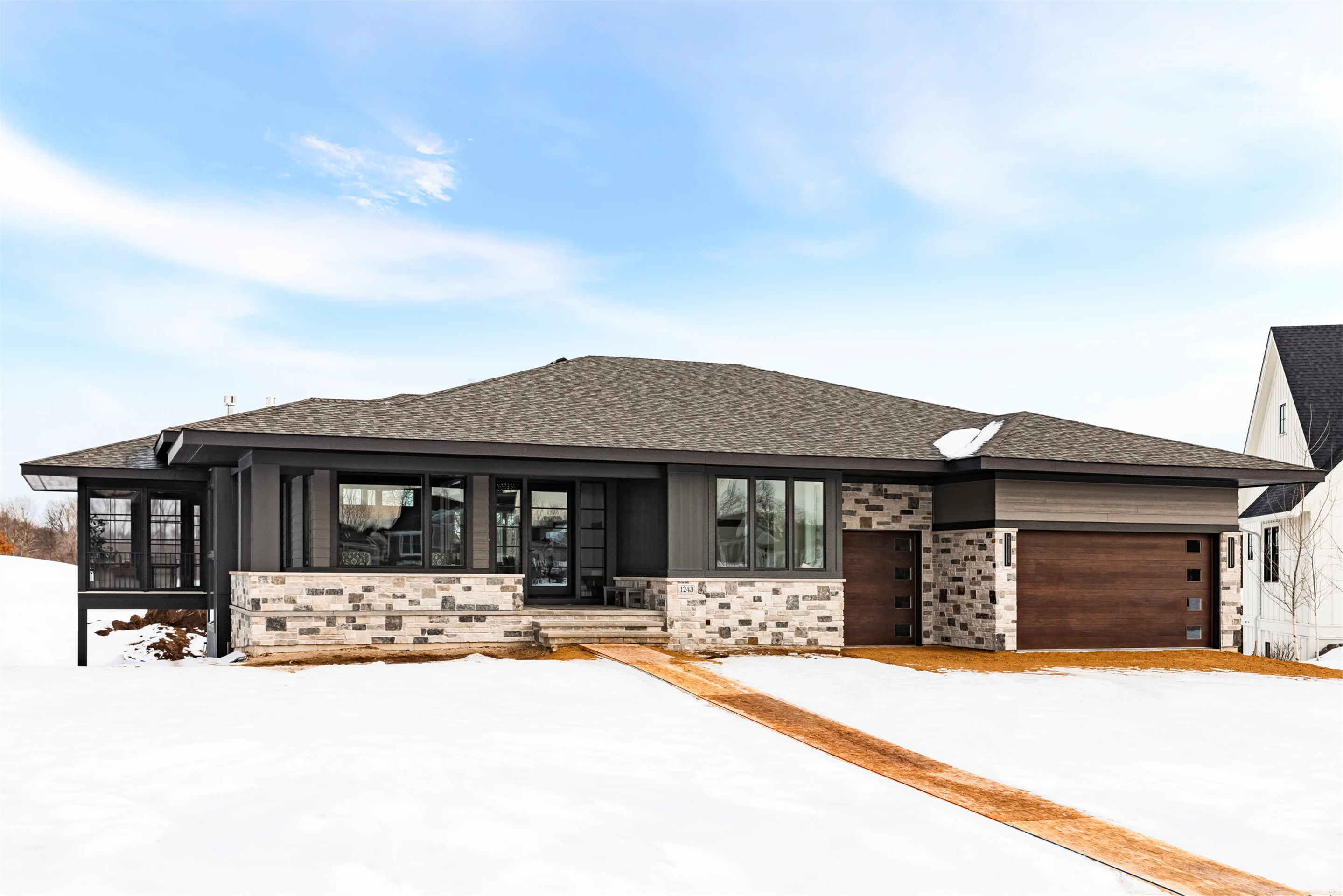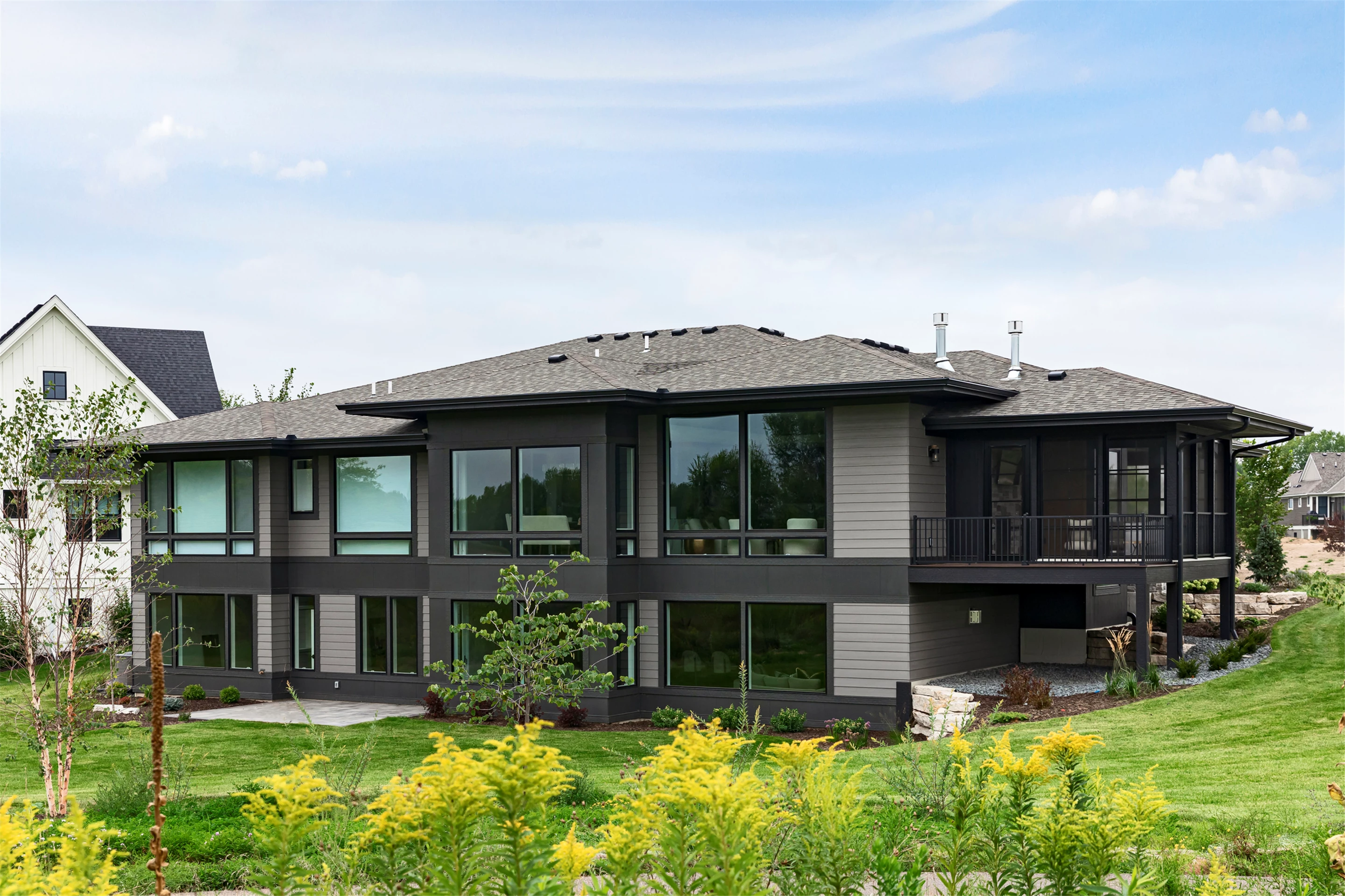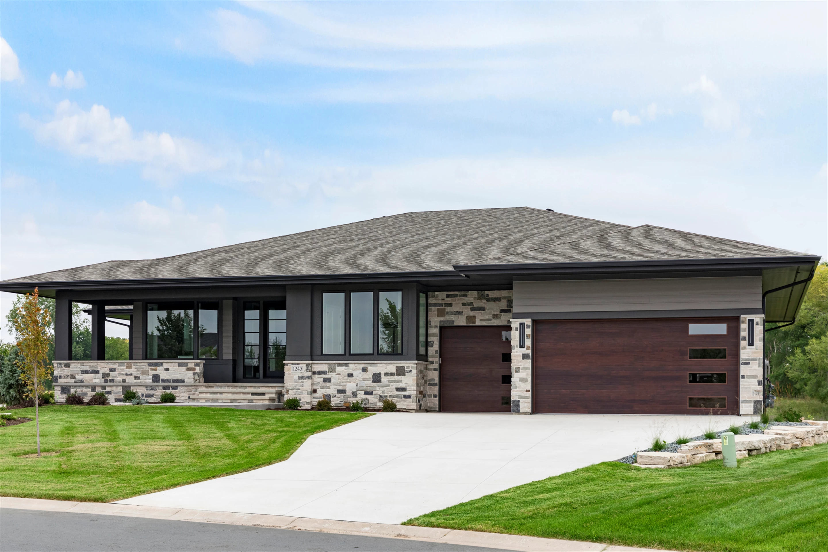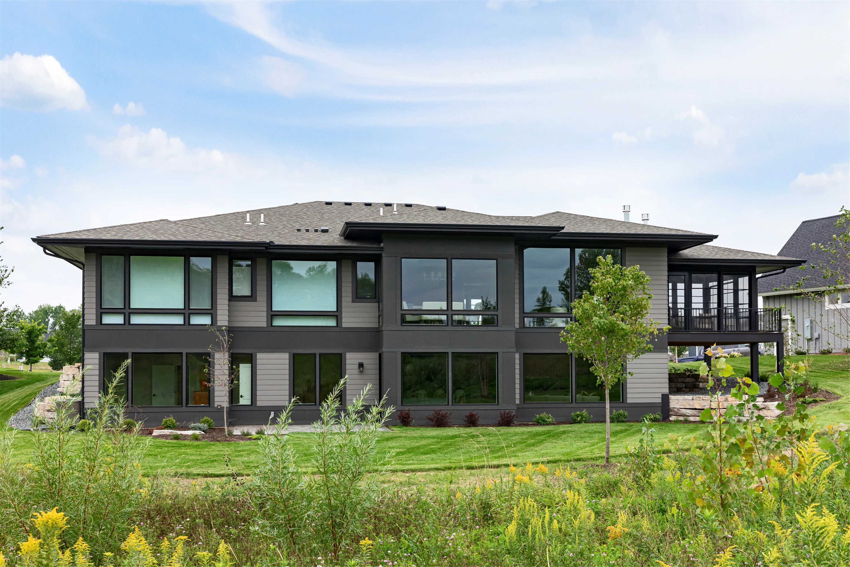This modern prairie home, located within the Royal Golf Club Neighborhood, showcases natural stone and Hardie siding on the exterior. Walnut cabinetry and Cambria countertops are used throughout. Main level highlights include walnut flooring, Monogram appliances, a dropped ceiling detail over the island and dinette, and a walk-in pantry with built-in shelving and a second refrigerator. Expansive windows in the great room offer gorgeous golf course views. Other great room features include a box vaulted ceiling, a stone fireplace with a walnut mantle and hearth, and built-in cabinetry. Just off the great room is the three-season porch with a stone fireplace and an attached grill deck. A fully equipped wet bar, a media room with a stone fireplace, and a game room with a card table are located in the lower level, along with three additional bedrooms and an exercise room.
