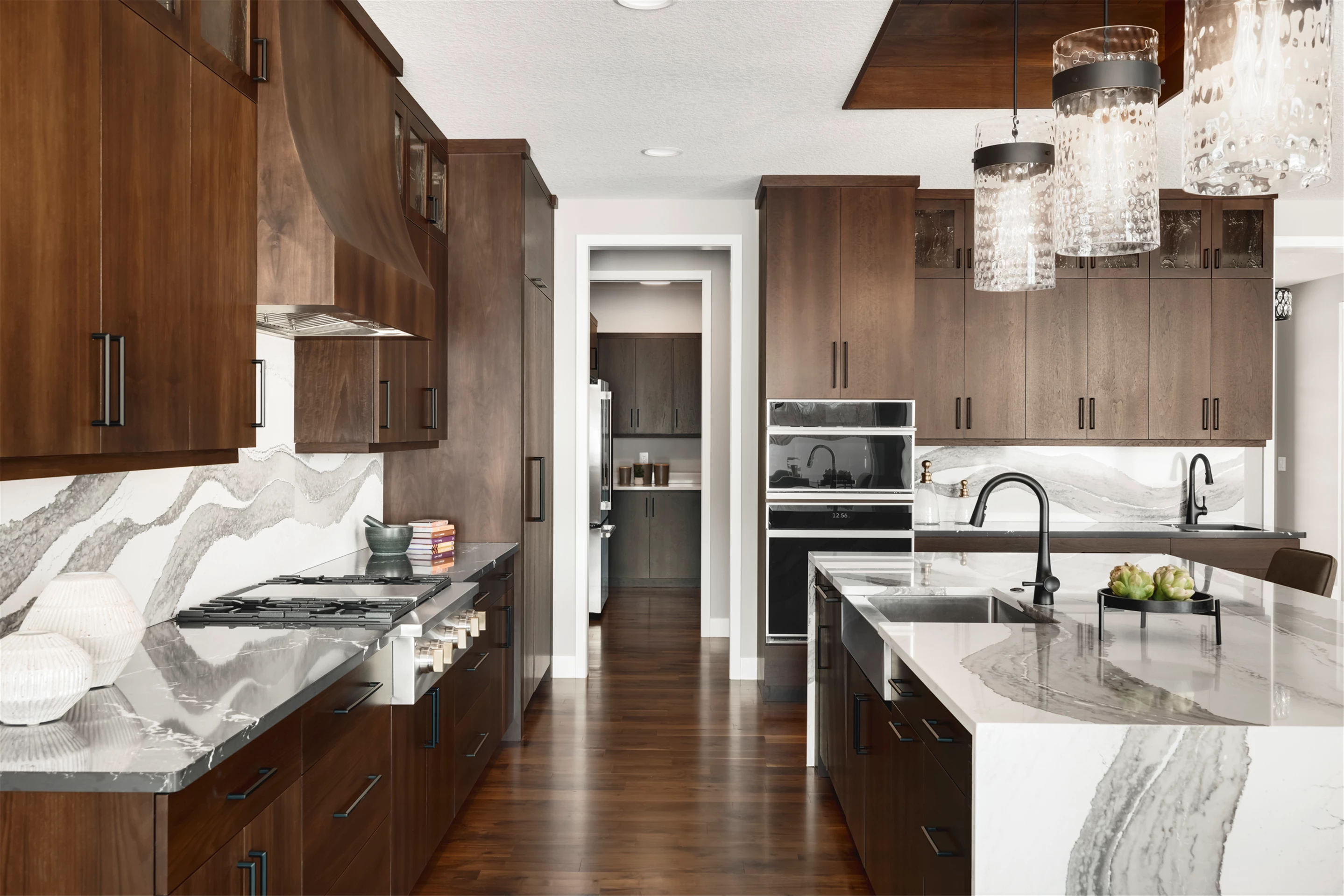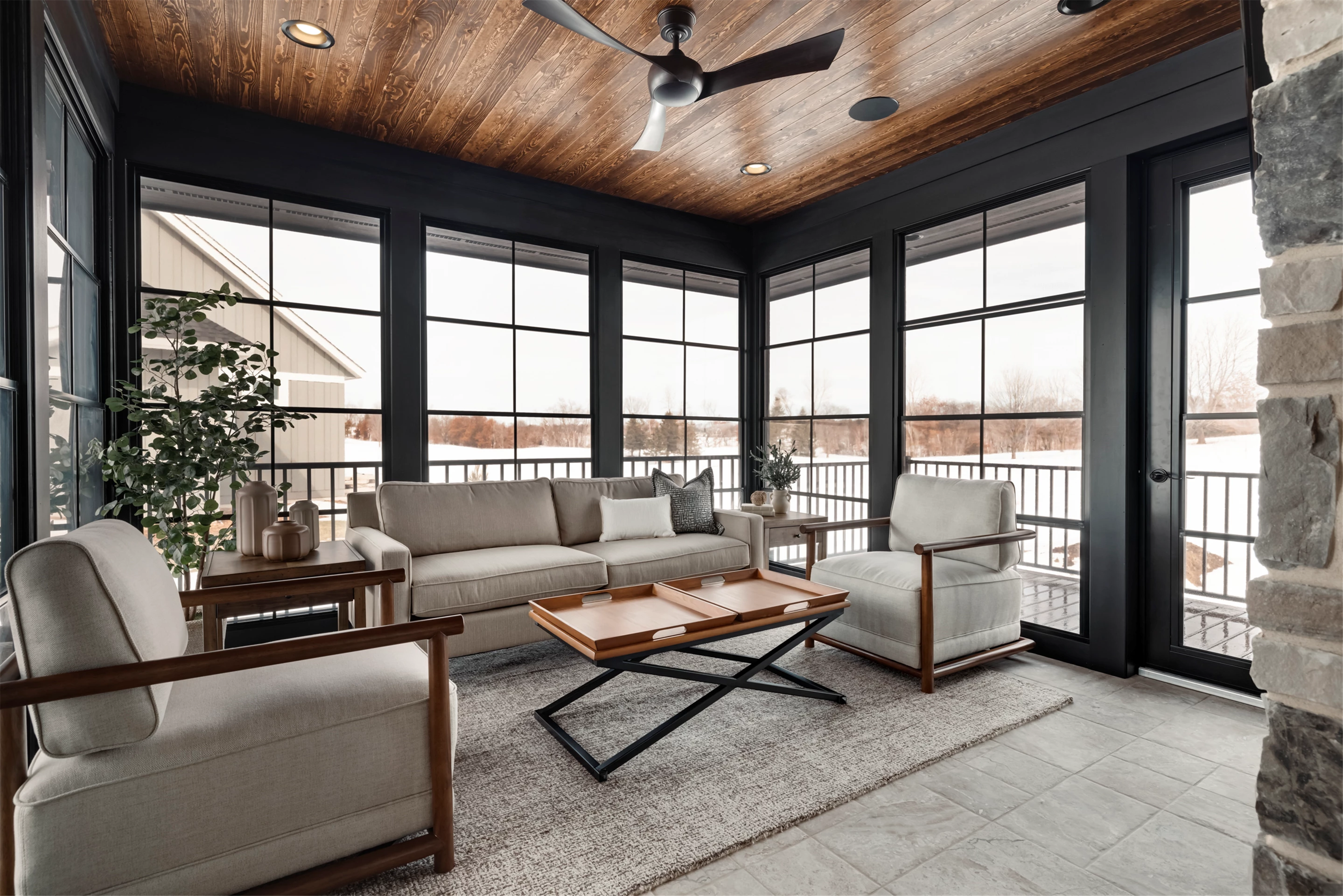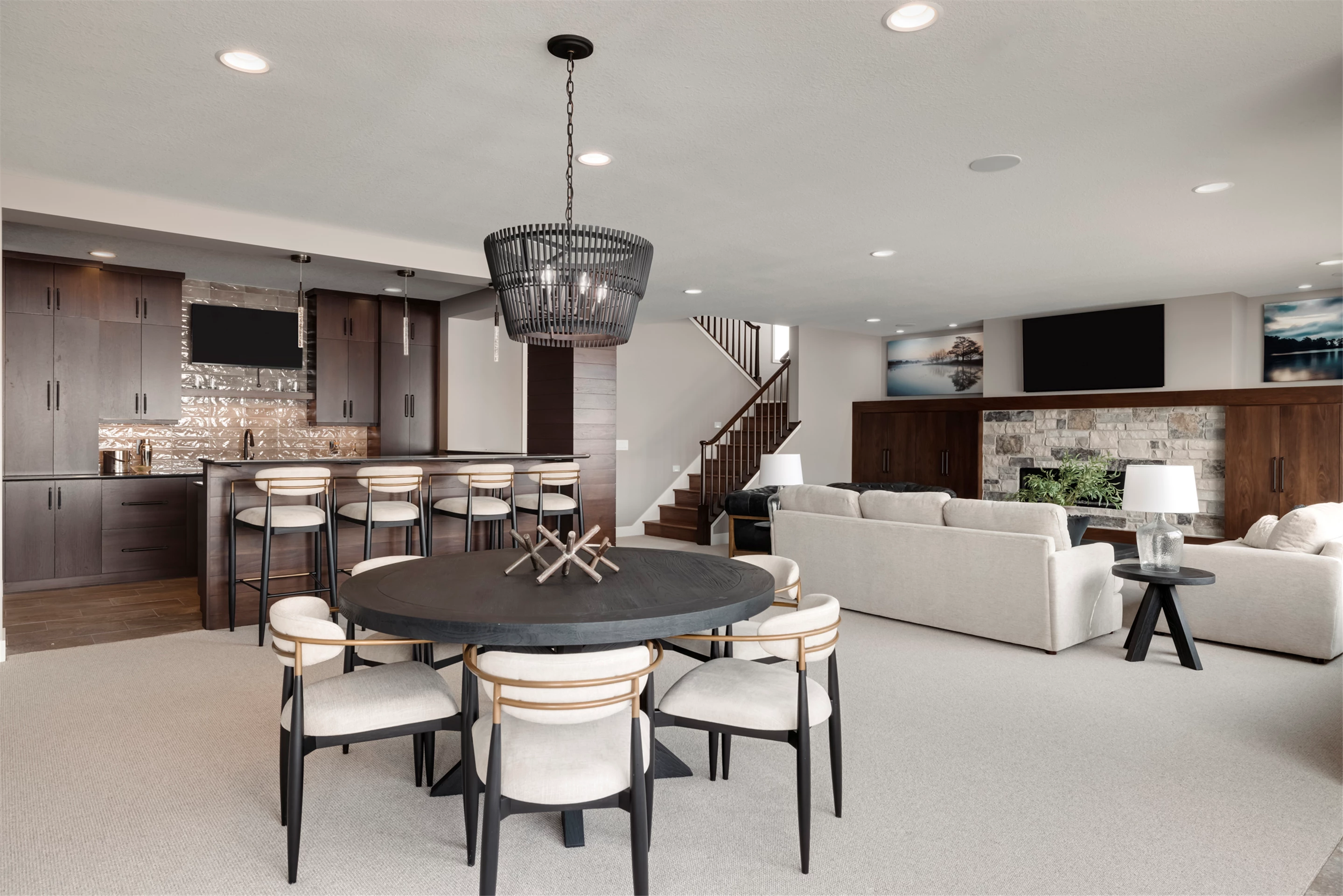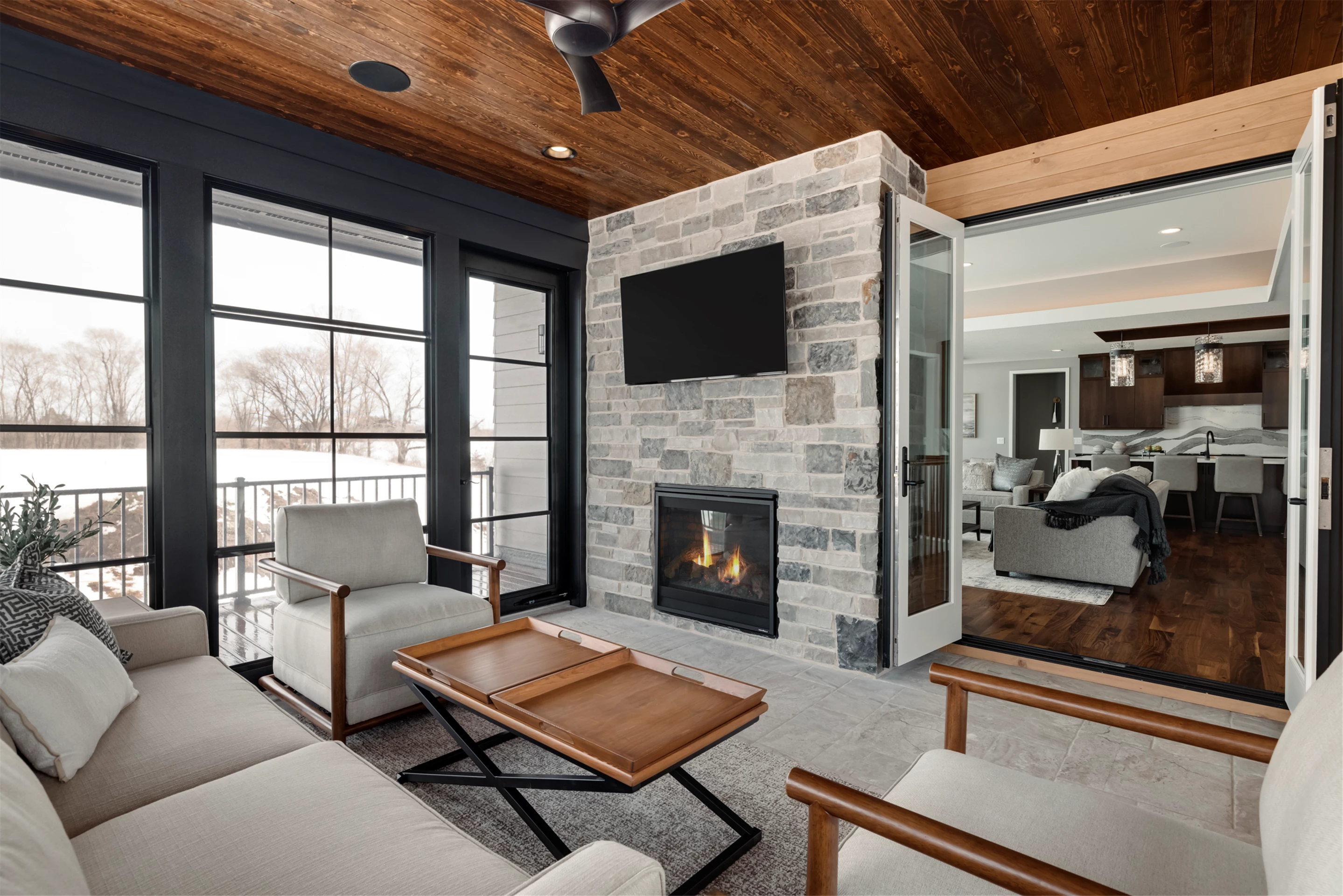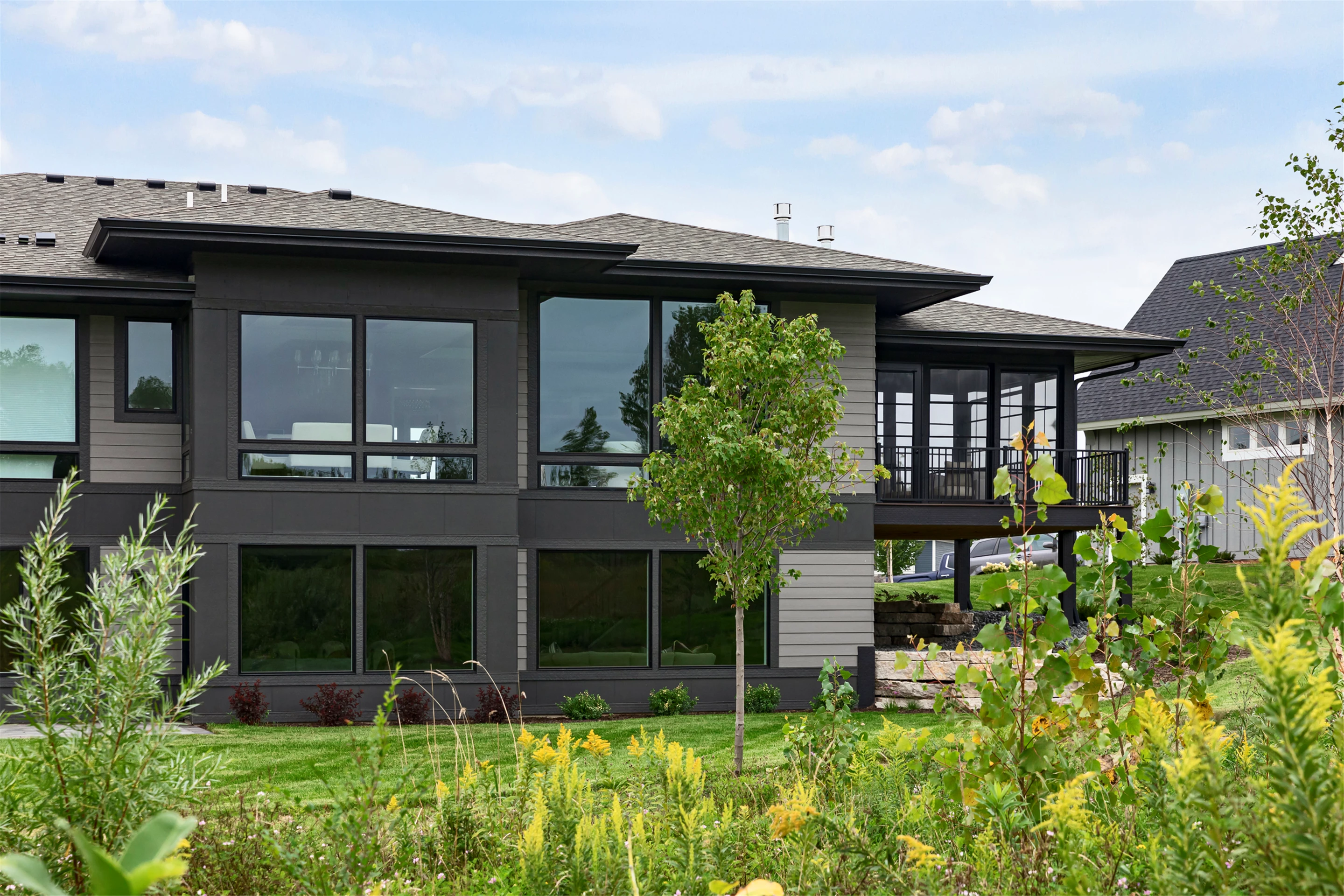 This modern prairie home, located within the Royal Golf Club Neighborhood, showcases natural stone and Hardie siding on the exterior. Walnut cabinetry and Cambria countertops are used throughout. Main level highlights include walnut flooring, Monogram appliances, a dropped ceiling detail over the island and dinette, and a walk-in pantry with built-in shelving and a second refrigerator. Expansive windows in the great room offer gorgeous golf course views. Other great room features include a box vaulted ceiling, a stone fireplace with a walnut mantle and hearth, and built-in cabinetry. Just off the great room is the three-season porch with a stone fireplace and an attached grill deck. A fully equipped wet bar, a media room with a stone fireplace, and a game room with a card table are located in the lower level, along with three additional bedrooms and an exercise room.