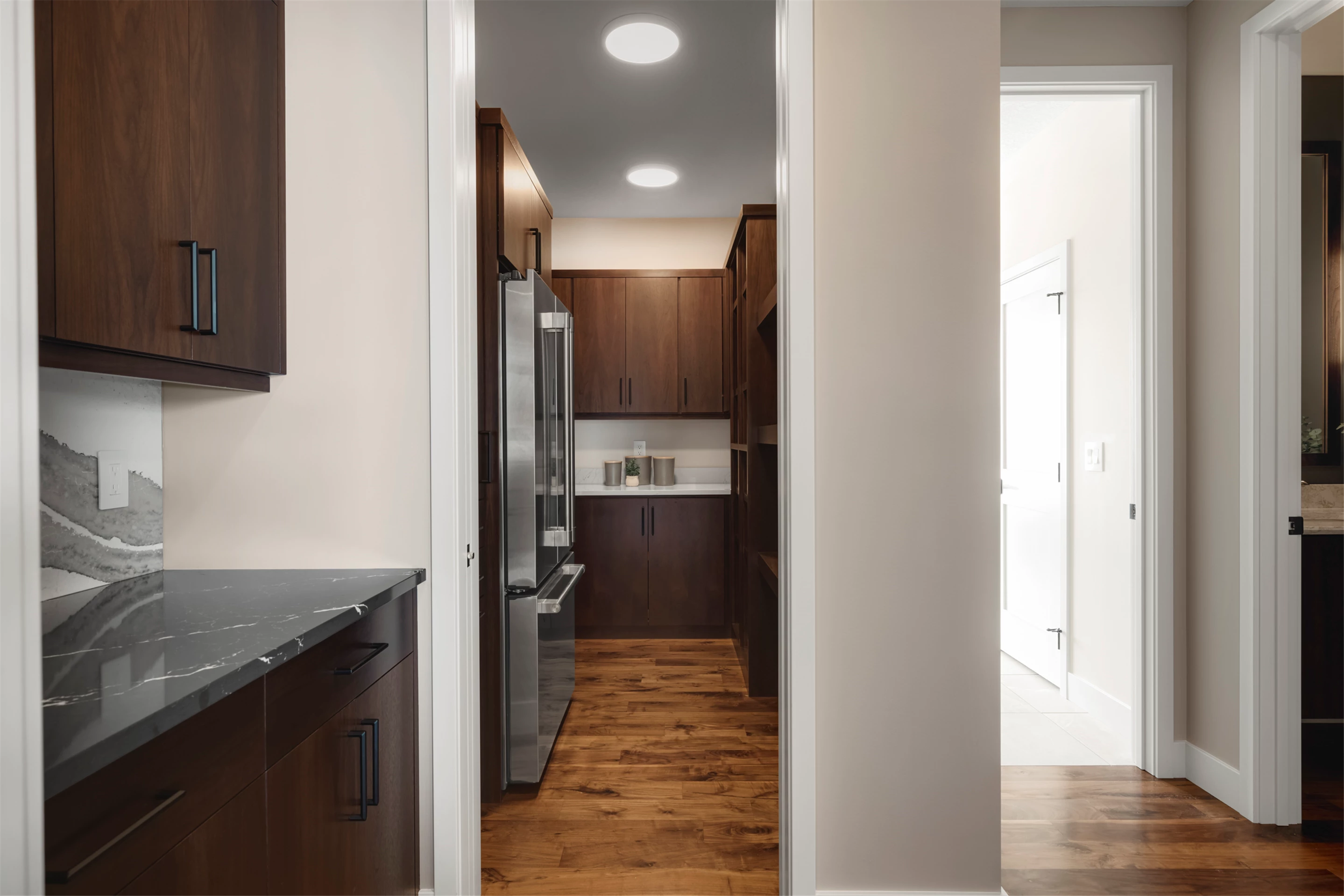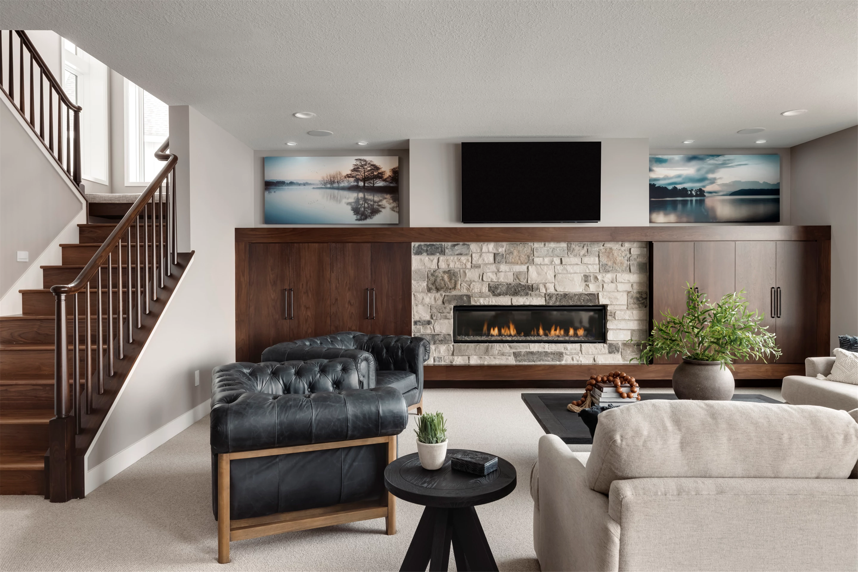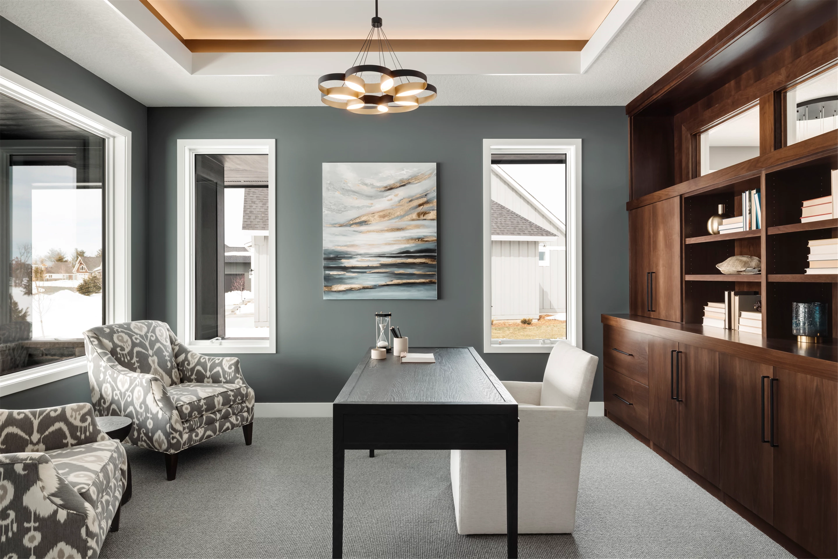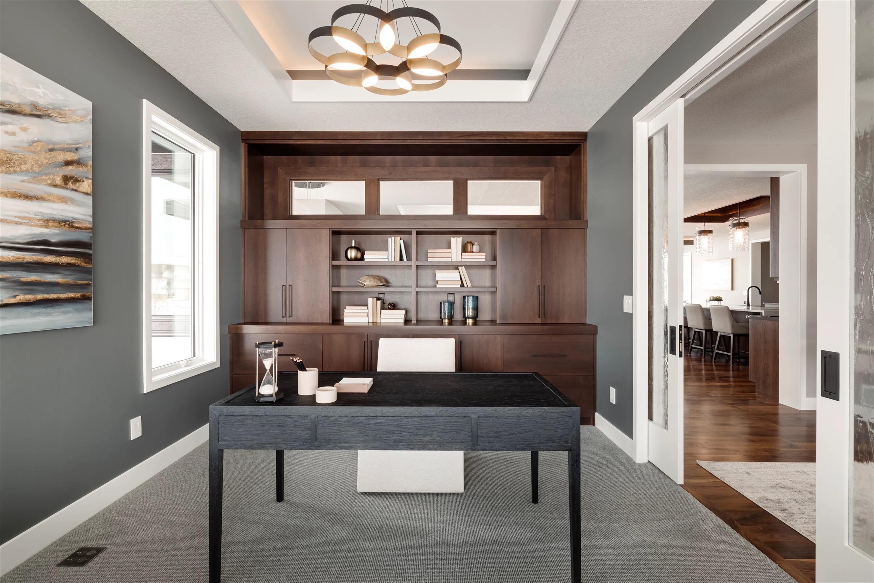 Palmer Prairie with a Modern Flare's home office features dark wood built-in shelving to provide a contemporary feel in any professional setting. Combining existing traditional elements with modern touches, this space has been designed with both comfort and function in mind. Crafted with natural tones, the dark shelving adds a unique depth to the room, providing plenty of storage space as well as a sophisticated atmosphere. Enjoy the warm atmosphere of this one-of-a-kind office setting and let the style inspire you.