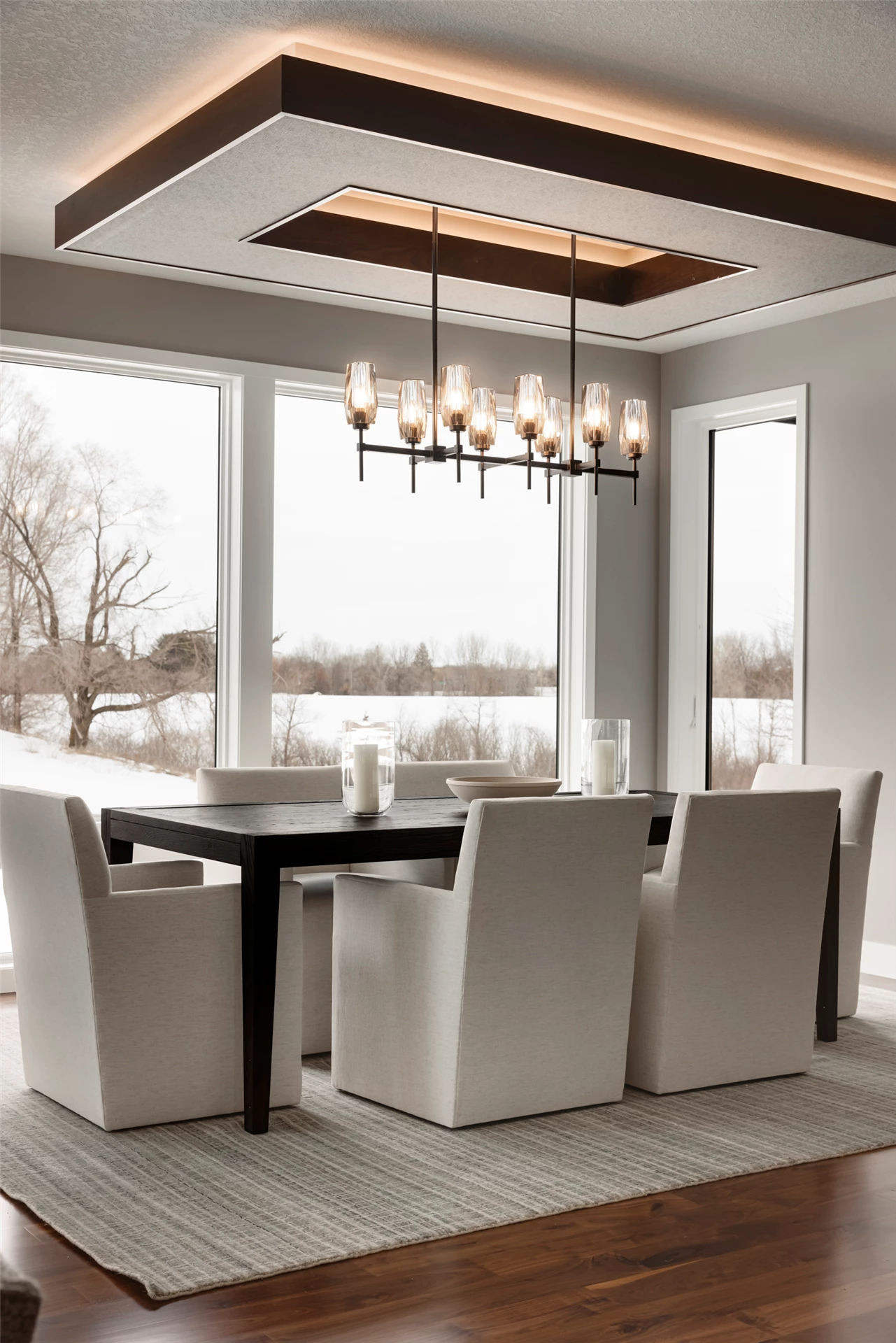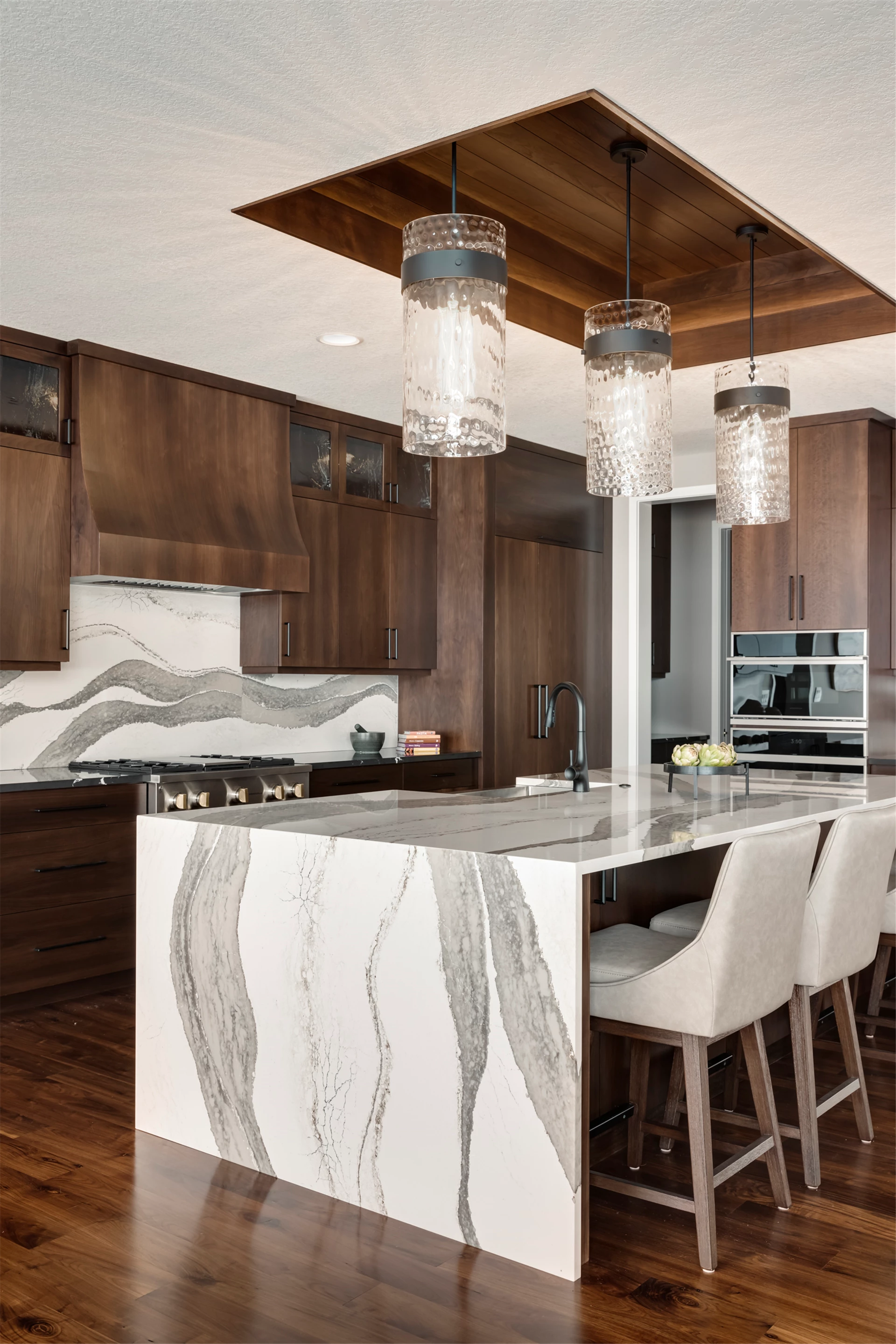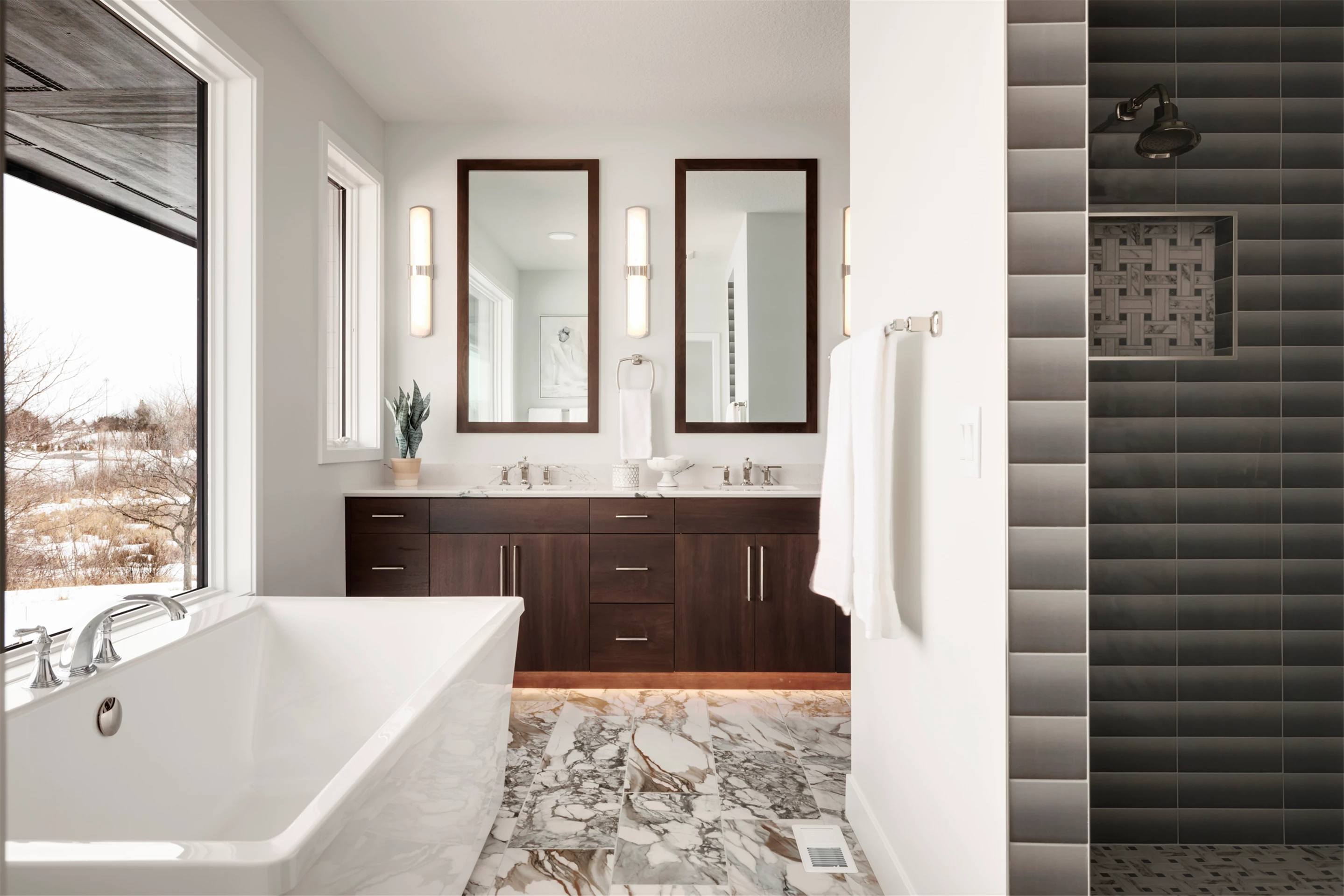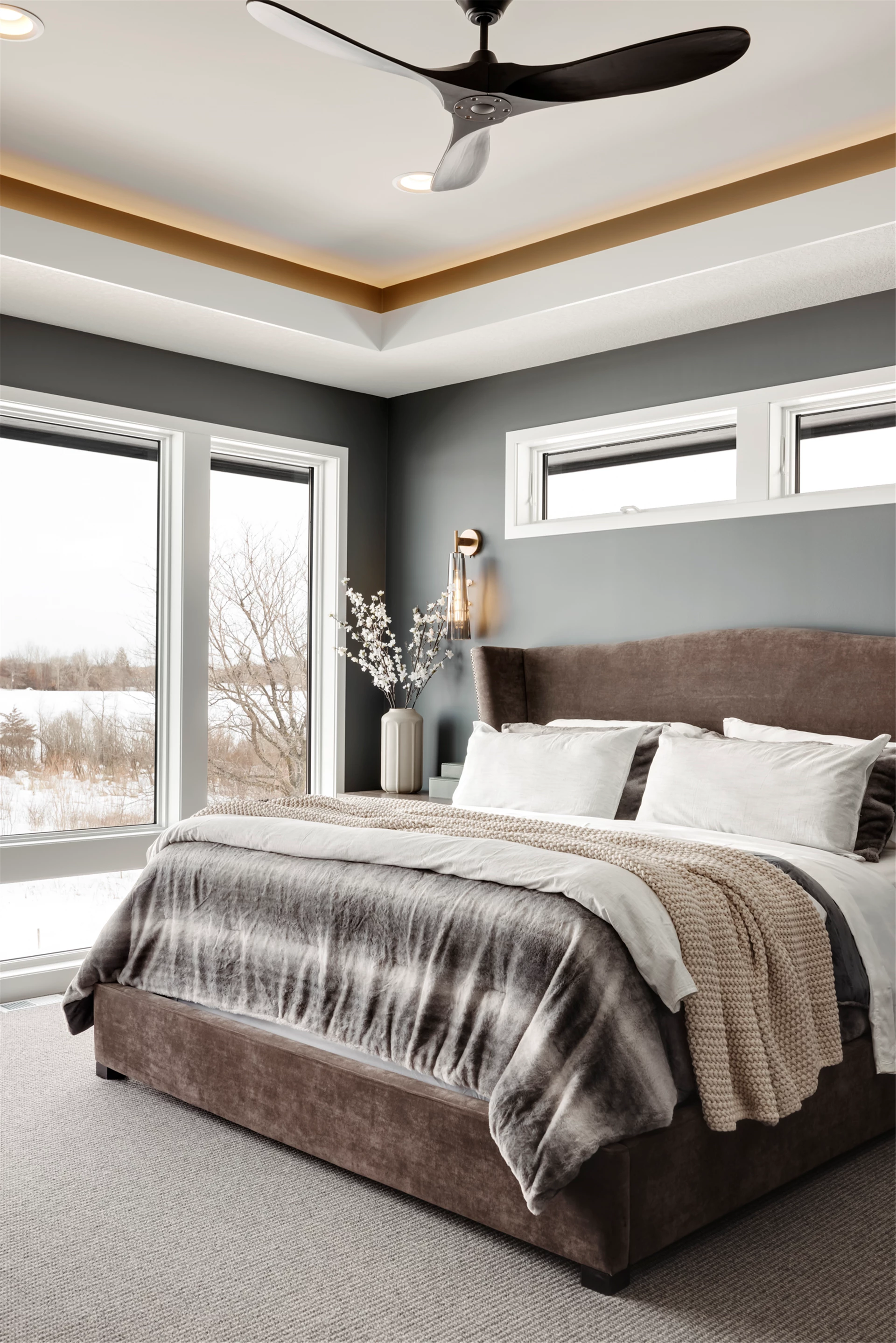 Palmer Prairie with a Modern Flare's home office features dark wood built-in shelving to provide a contemporary feel in any professional setting. Combining existing traditional elements with modern touches, this space has been designed with both comfort and function in mind. Crafted with natural tones, the dark shelving adds a unique depth to the room, providing plenty of storage space as well as a sophisticated atmosphere. Enjoy the warm atmosphere of this one-of-a-kind office setting and let the style inspire you.