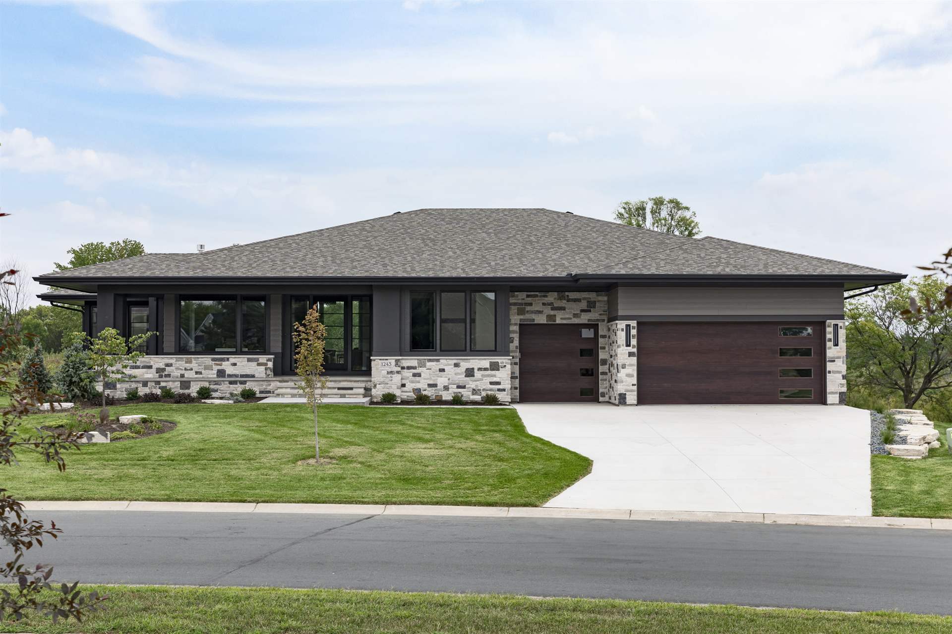 This modern prairie home, located within the Royal Golf Club Neighborhood, showcases natural stone and Hardie siding on the exterior. Walnut cabinetry and Cambria countertops are used throughout. Main level highlights include walnut flooring, Monogram appliances, a dropped ceiling detail over the island and dinette, and a walk-in pantry with built-in shelving and a second refrigerator. Expansive windows in the great room offer gorgeous golf course views. Other great room features include a box vaulted ceiling, a stone fireplace with a walnut mantle and hearth, and built-in cabinetry. Just off the great room is the three-season porch with a stone fireplace and an attached grill deck. A fully equipped wet bar, a media room with a stone fireplace, and a game room with a card table are located in the lower level, along with three additional bedrooms and an exercise room.