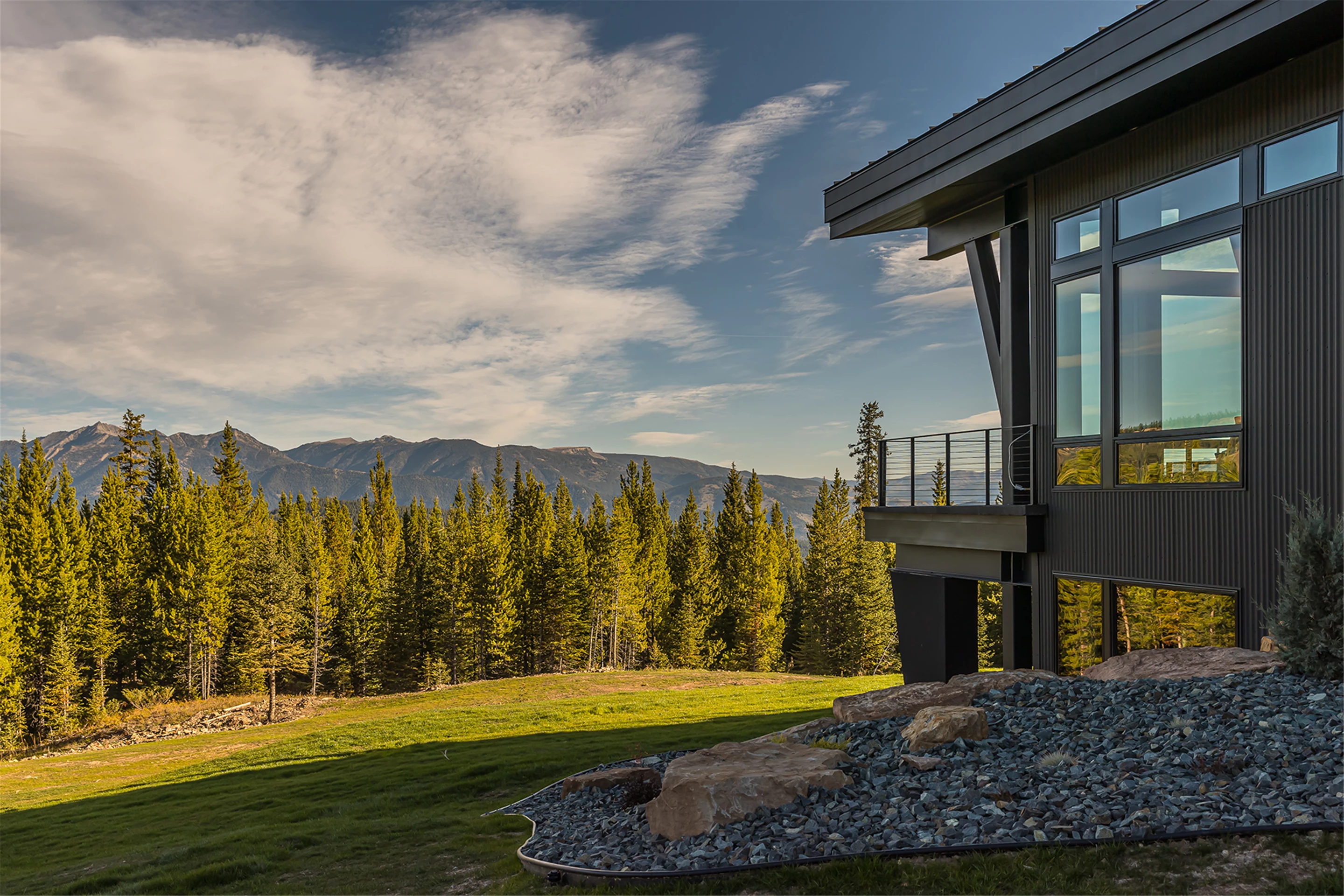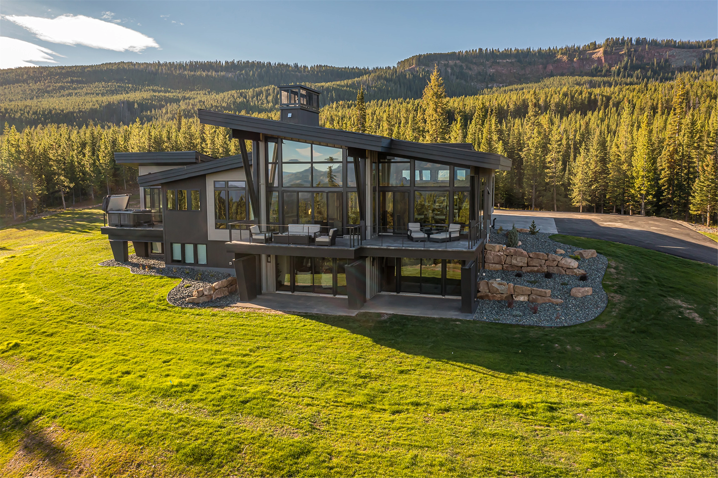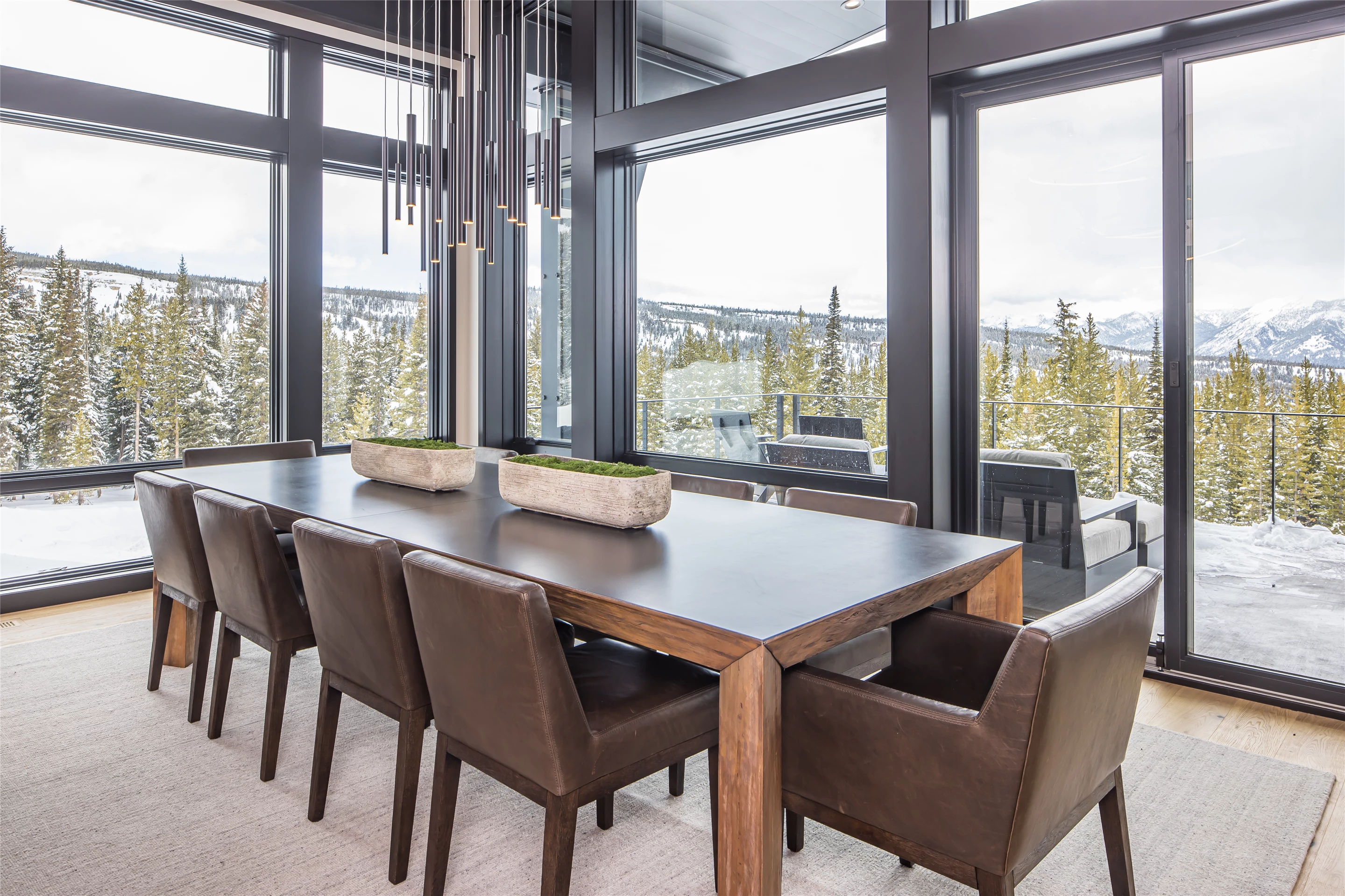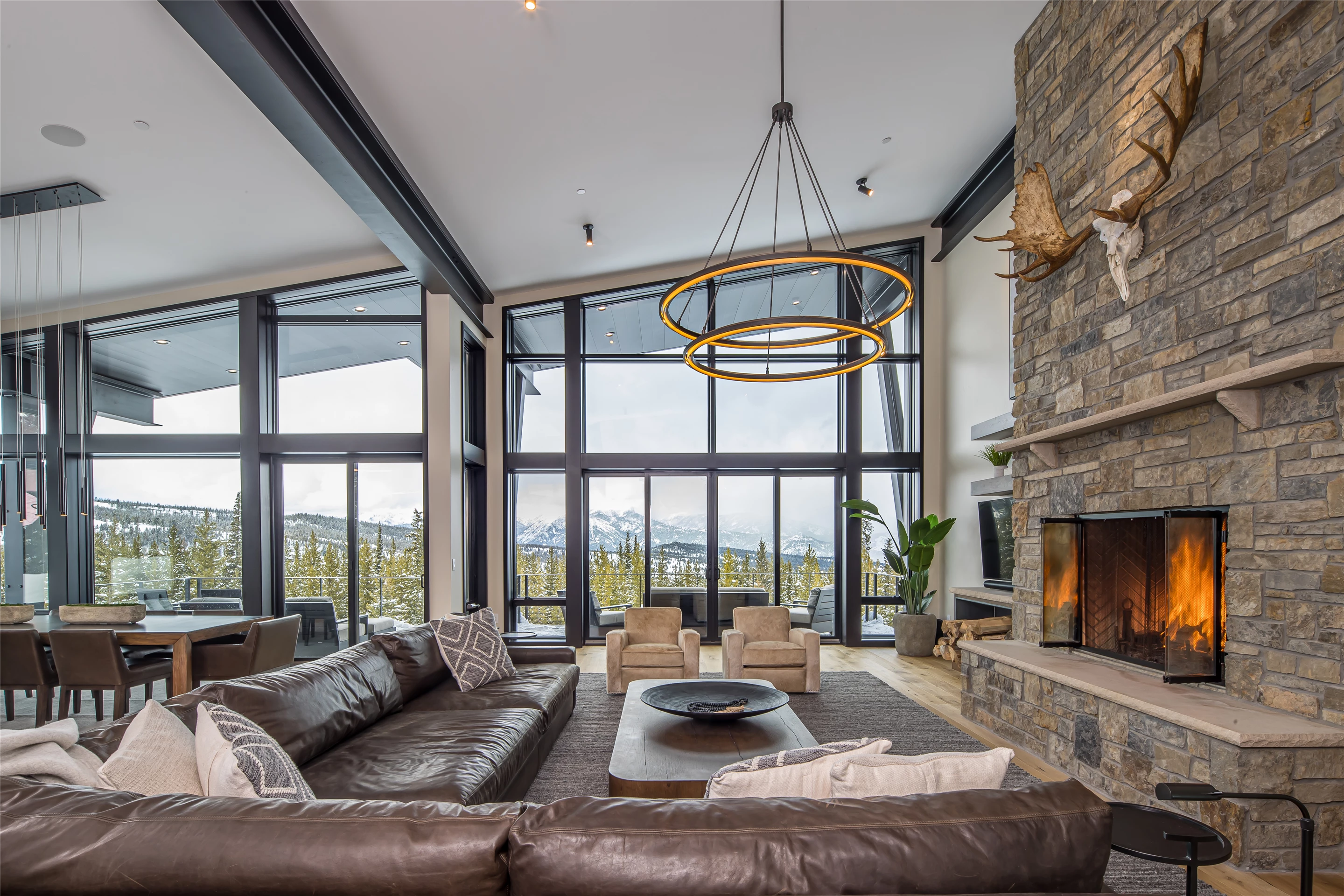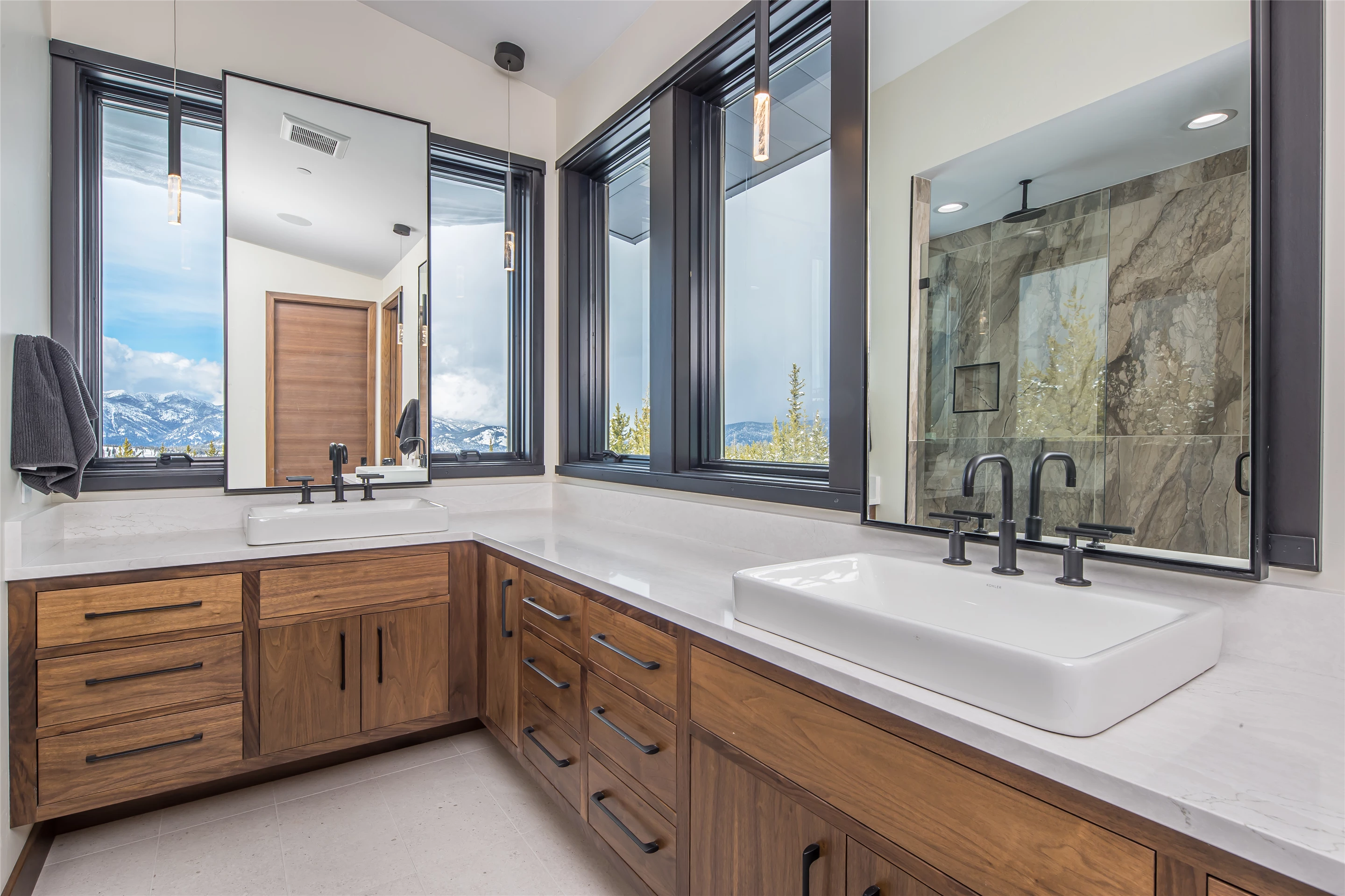 Tucked into the mountainside of Buckridge Ranch, Hartman Homes welcomes you to this modern mountain marvel. The home was architecturally designed to maximize natural light and 360-degree views of the Big Sky Montana Spanish Peaks skyline, incorporating Andersen Windows and Doors. A mix of varied steel textures and beams on the exterior gives the home a contemporary feel. As you enter the sizable see-through foyer, you’re welcomed by large format porcelain floors and luxe light fixtures. The main floor boasts wire-brushed white oak hardwood floors, walnut interior doors and millwork, and an 18ft stone wood-burning fireplace flanked by built-in cabinetry and floating shelves. The modern kitchen offers an abundance of custom walnut cabinetry, a large island with a Cambria top, and corner windows with views to the main entrance. As family and guests enjoy time at the large dining room table, they will take in the seasonal views through the expansive floor-to-ceiling windows and patio doors. The great room finishes off this open space with plenty of seating. The balcony overlooking the property’s acreage, with steel and cable rail and concrete decking, spans the north side of the home and can be accessed from the dining room or great room glass doors. Down the hall from the great room area, you will find the primary suite with views of the outdoors from all sides of the home. A private deck with a hot tub can be reached through the patio doors. The primary bathroom offers plenty of space, and the sliding mirrors over the exterior windows allow natural light to the room. Views of the mountains can be enjoyed through a window in the large walk-in shower. A