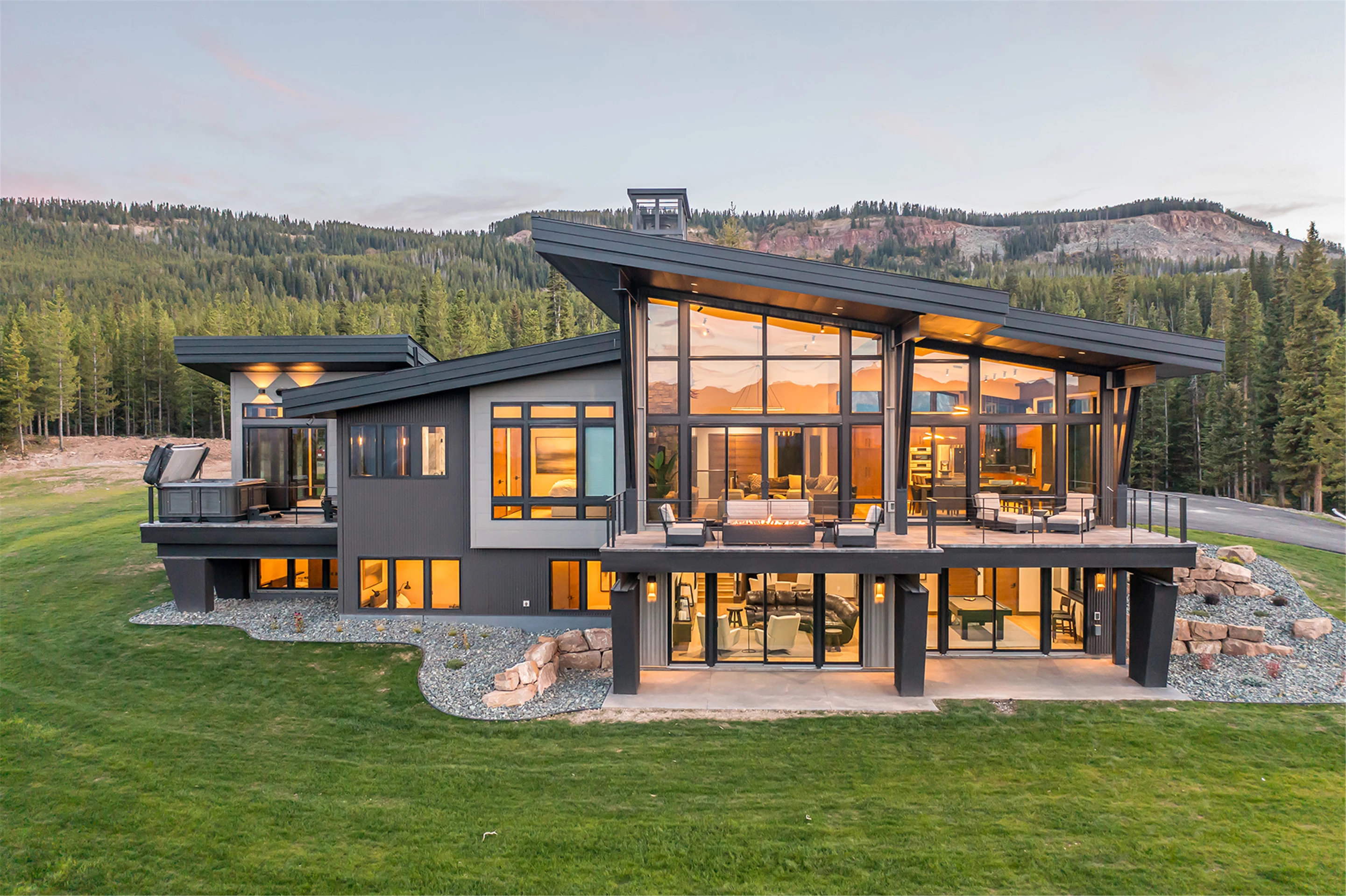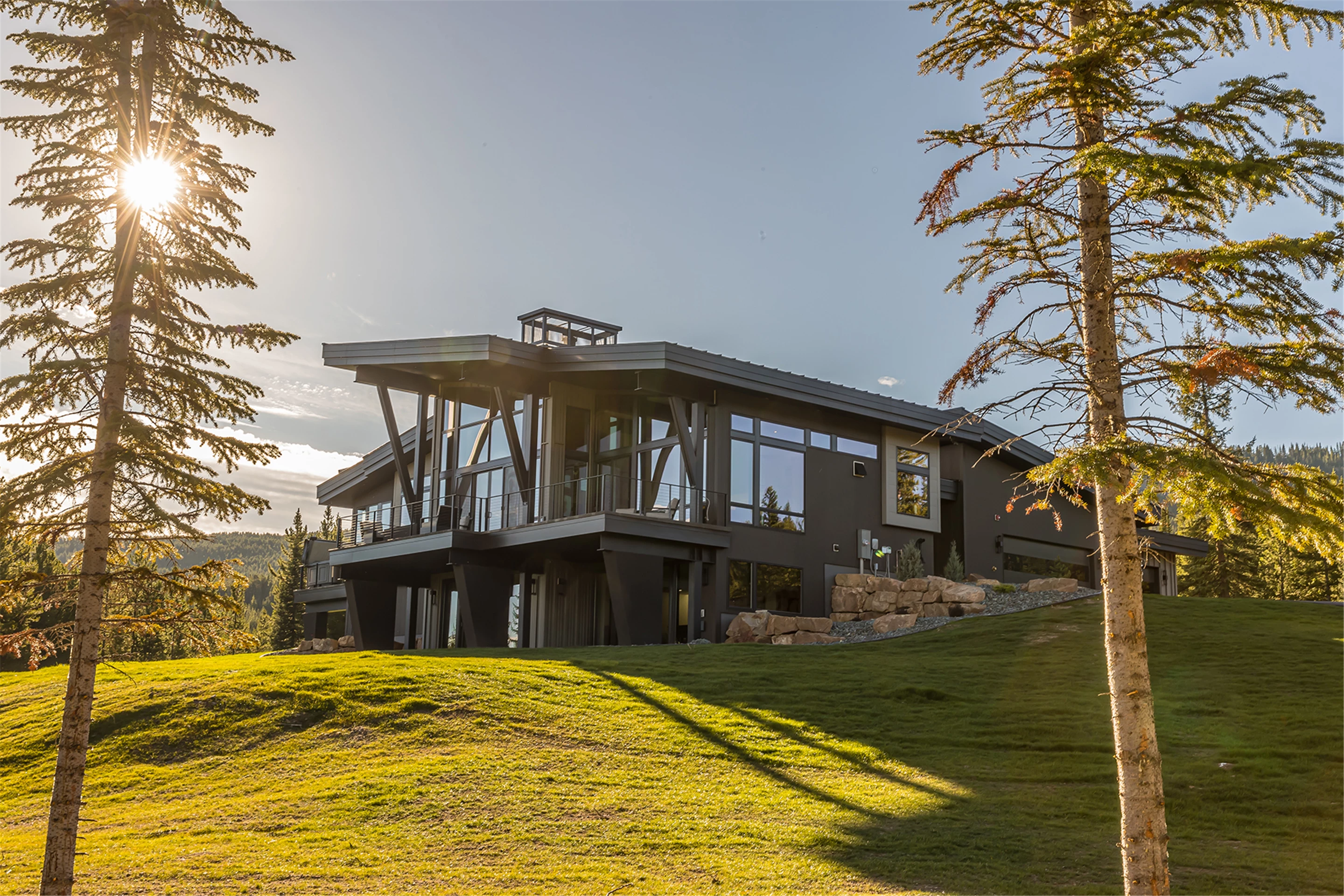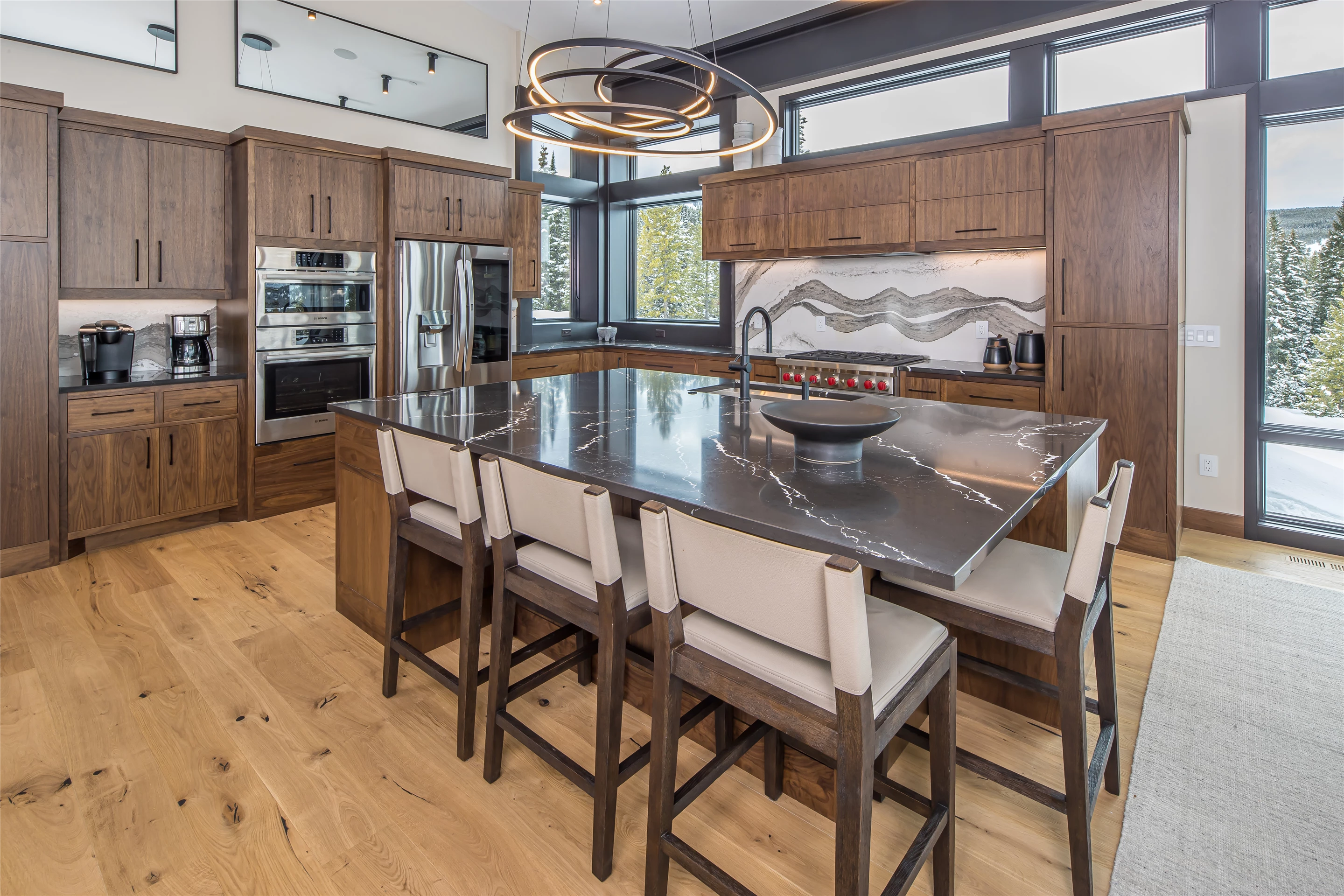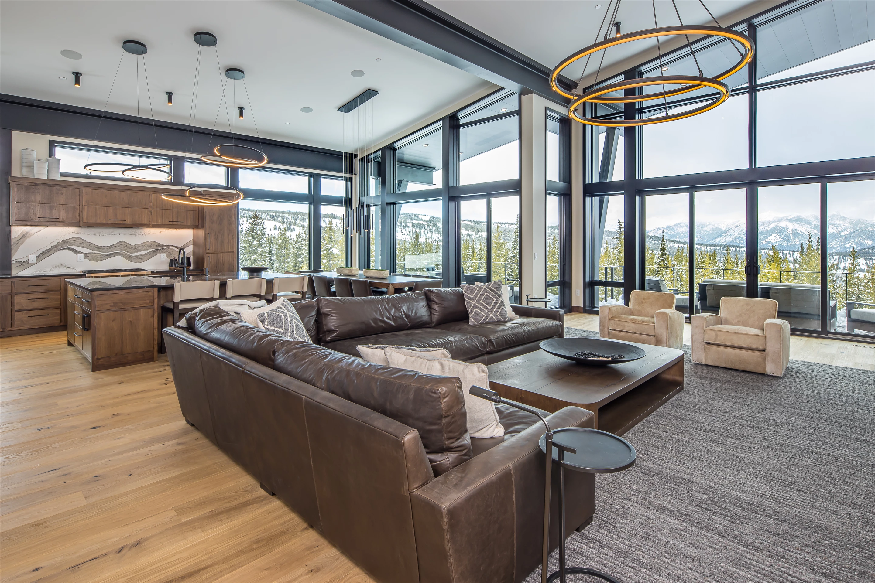 Tucked into the mountainside of Buckridge Ranch, Hartman Homes welcomes you to this modern mountain marvel. The home was architecturally designed to maximize natural light and 360-degree views of the Big Sky Montana Spanish Peaks skyline, incorporating Andersen Windows and Doors. A mix of varied steel textures and beams on the exterior gives the home a contemporary feel. As you enter the sizable see-through foyer, you’re welcomed by large format porcelain floors and luxe light fixtures. The main floor boasts wire-brushed white oak hardwood floors, walnut interior doors and millwork, and an 18ft stone wood-burning fireplace flanked by built-in cabinetry and floating shelves. The modern kitchen offers an abundance of custom walnut cabinetry, a large island with a Cambria top, and corner windows with views to the main entrance. As family and guests enjoy time at the large dining room table, they will take in the seasonal views through the expansive floor-to-ceiling windows and patio doors. The great room finishes off this open space with plenty of seating. The balcony overlooking the property’s acreage, with steel and cable rail and concrete decking, spans the north side of the home and can be accessed from the dining room or great room glass doors. Down the hall from the great room area, you will find the primary suite with views of the outdoors from all sides of the home. A private deck with a hot tub can be reached through the patio doors. The primary bathroom offers plenty of space, and the sliding mirrors over the exterior windows allow natural light to the room. Views of the mountains can be enjoyed through a window in the large walk-in shower. A