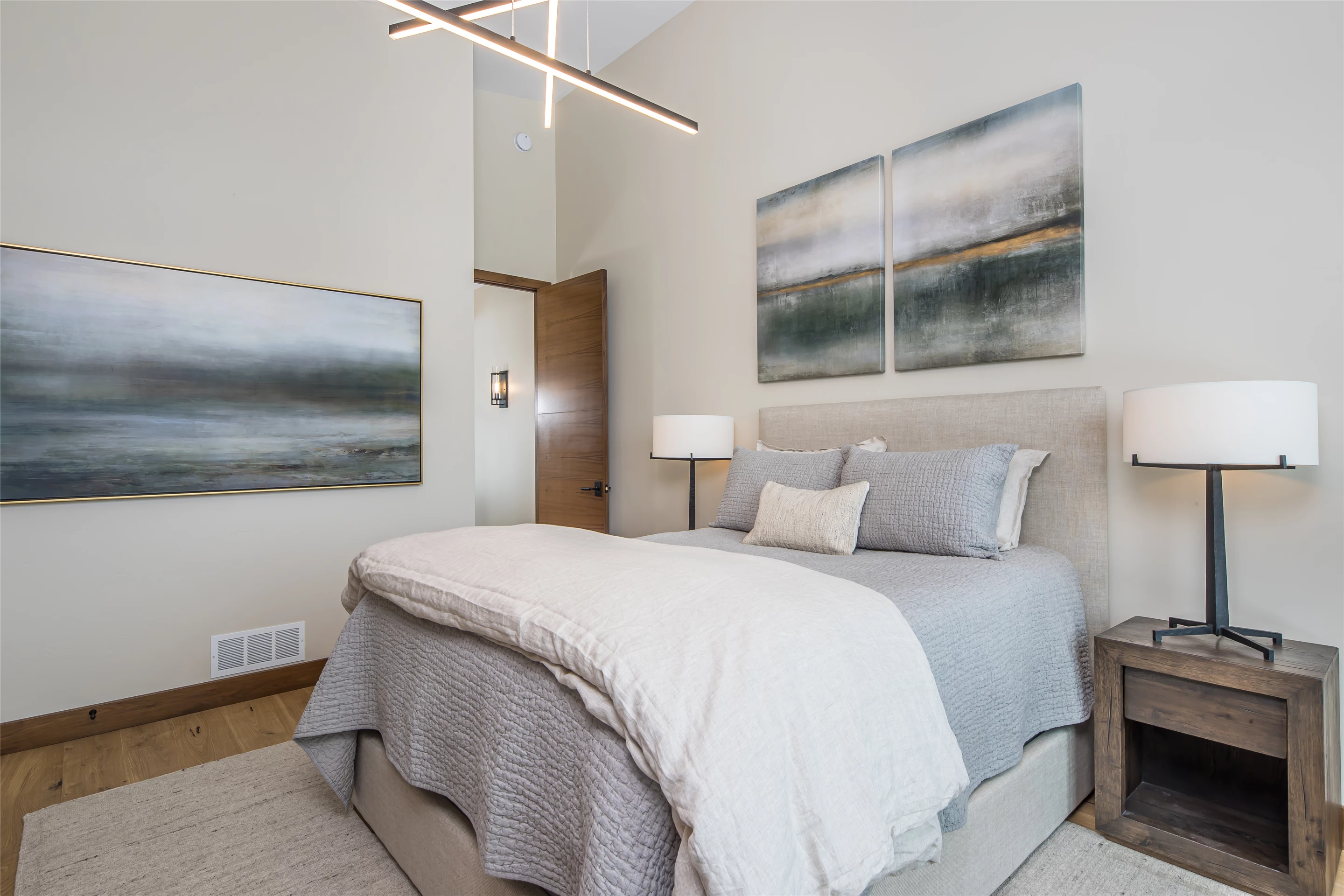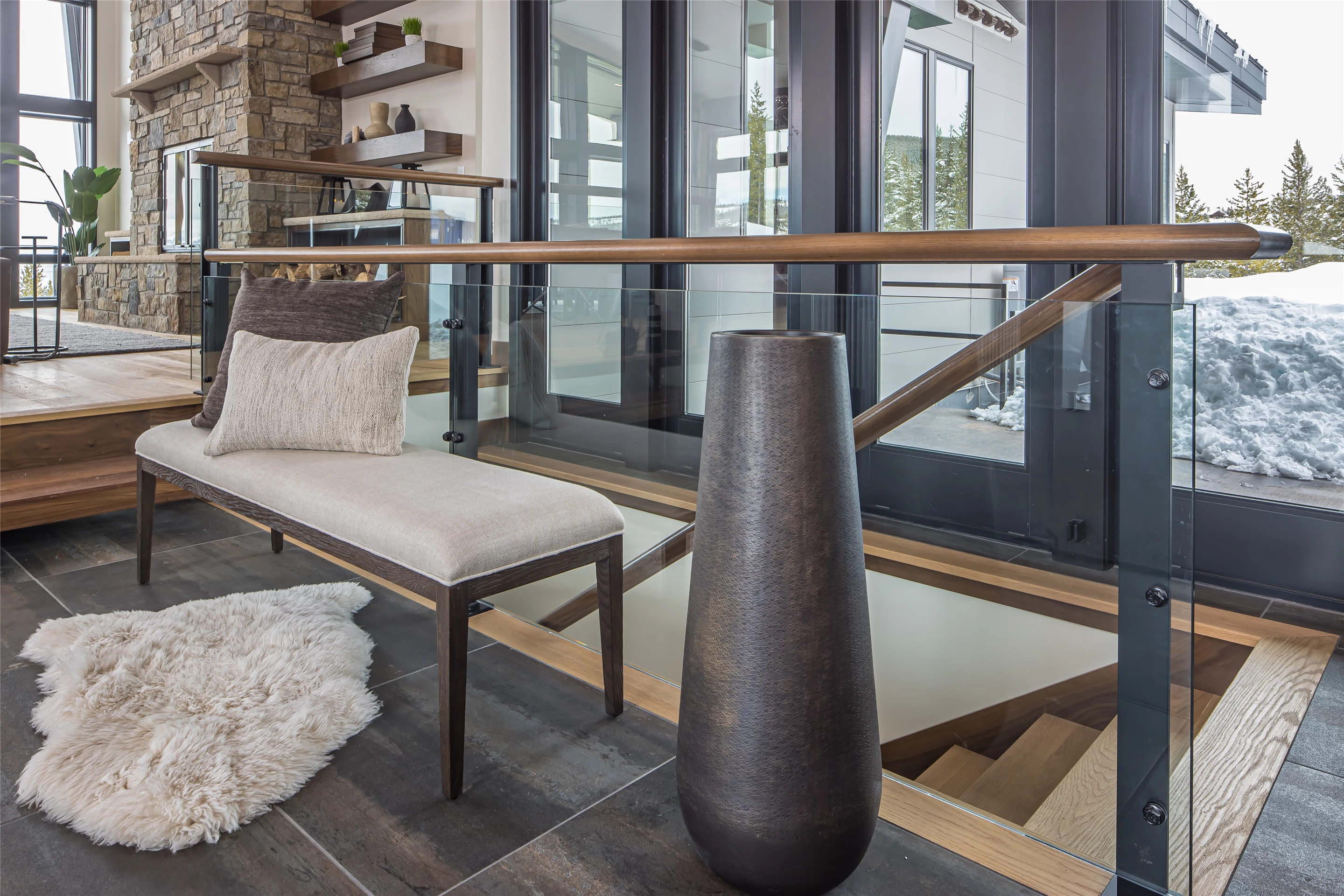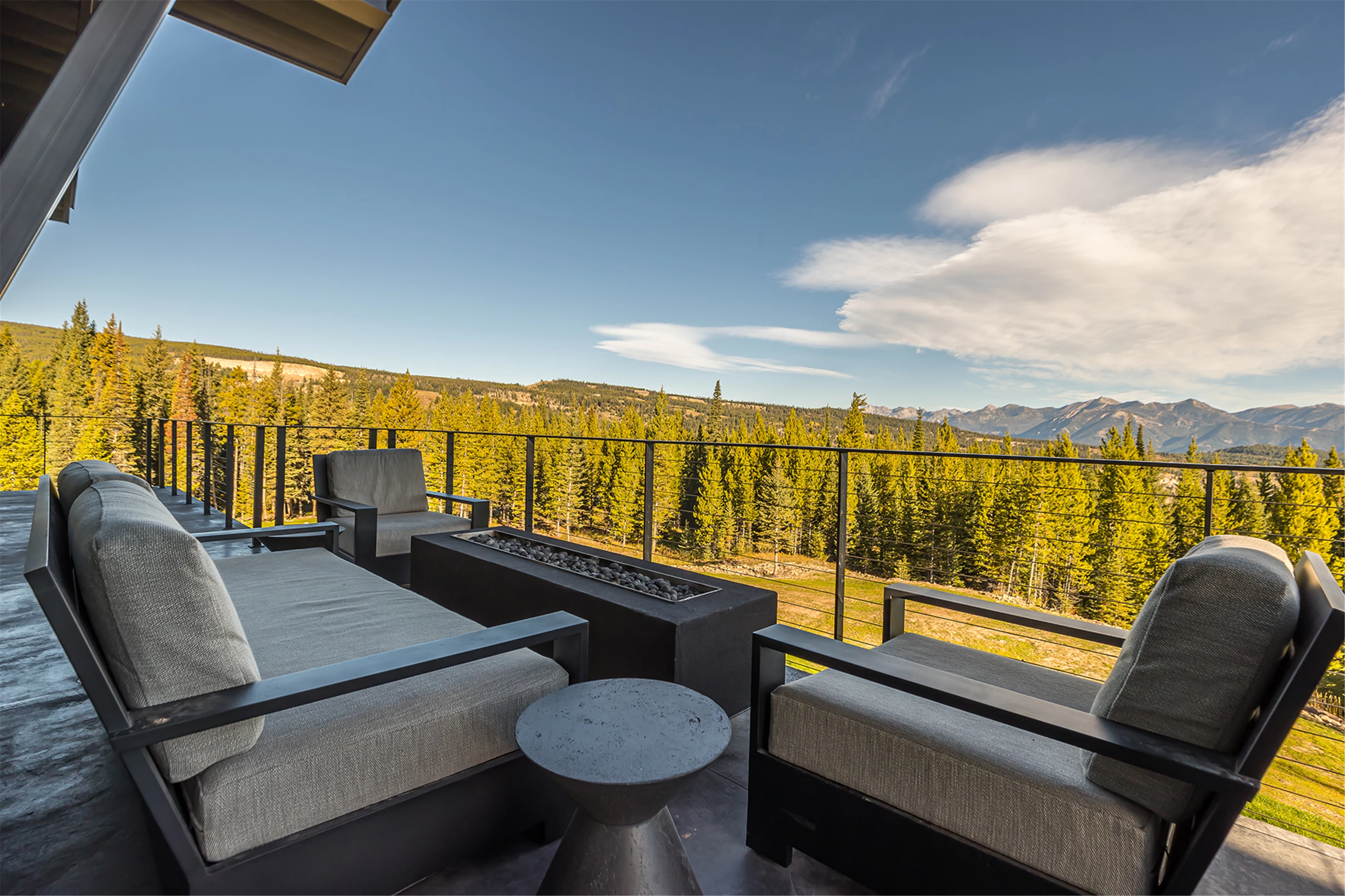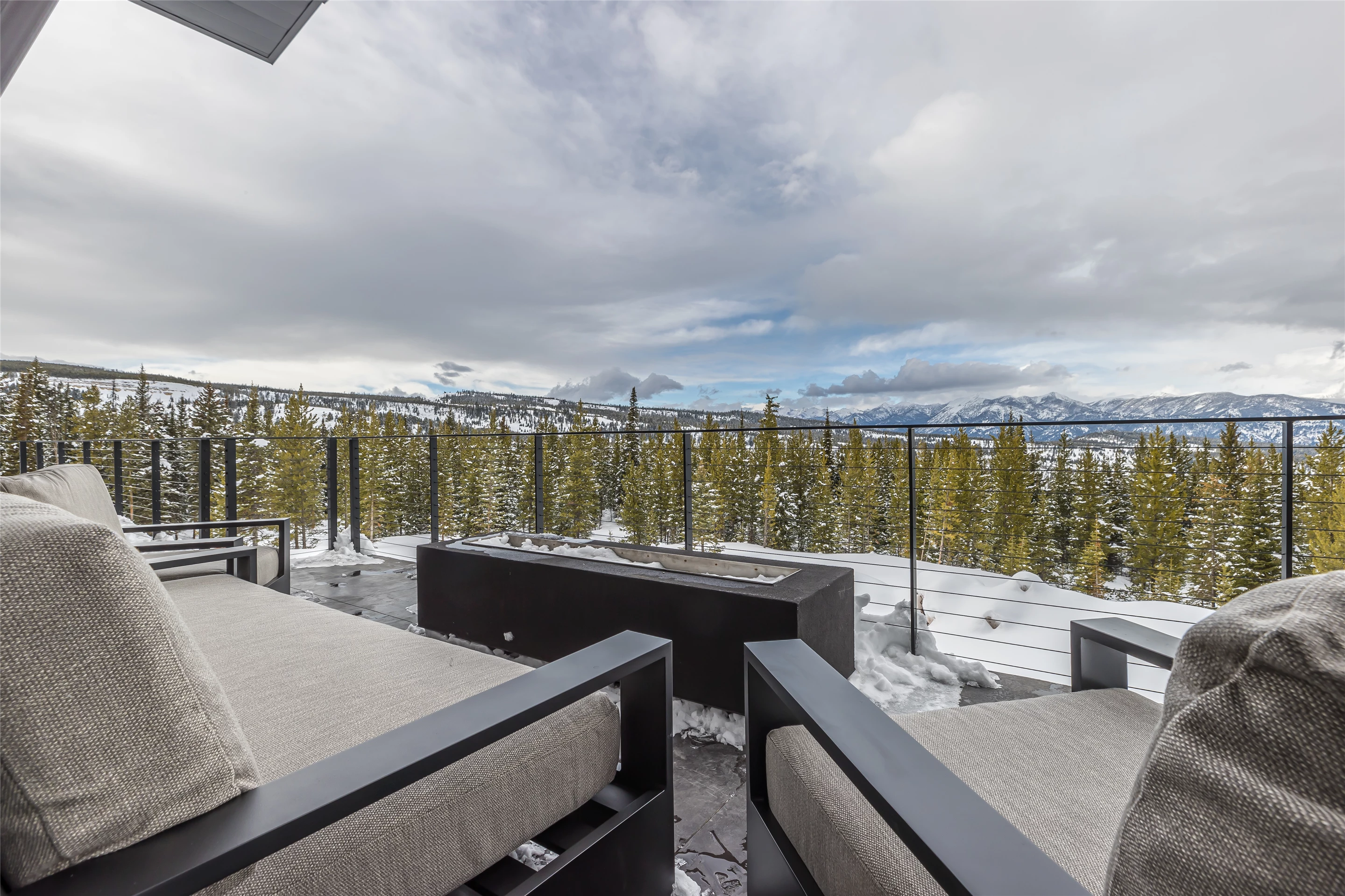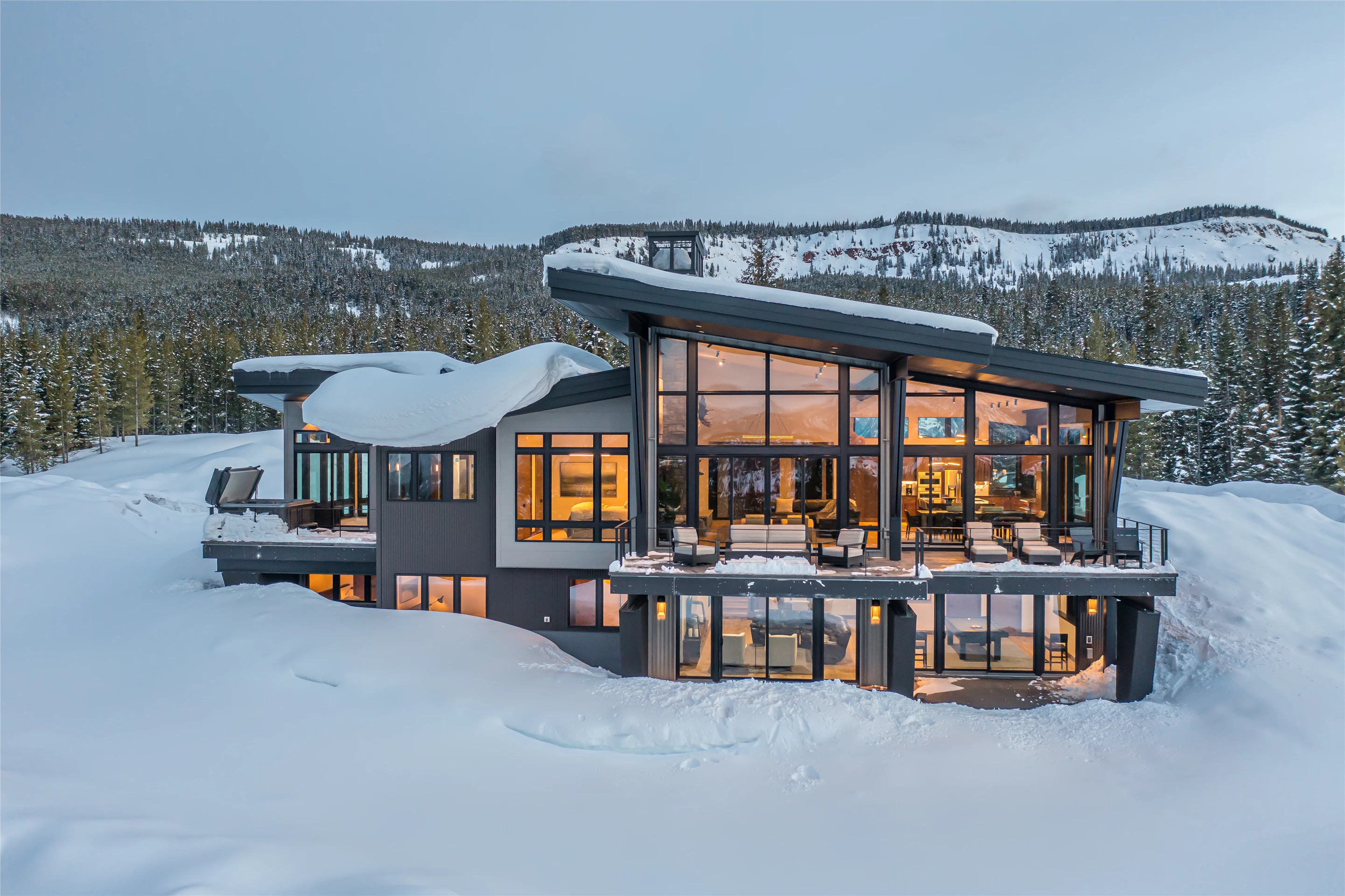 Tucked into the mountainside of Buckridge Ranch, Hartman Homes welcomes you to this modern mountain marvel. The home was architecturally designed to maximize natural light and 360-degree views of the Big Sky Montana Spanish Peaks skyline, incorporating Andersen Windows and Doors. A mix of varied steel textures and beams on the exterior gives the home a contemporary feel. As you enter the sizable see-through foyer, you’re welcomed by large format porcelain floors and luxe light fixtures. The main floor boasts wire-brushed white oak hardwood floors, walnut interior doors and millwork, and an 18ft stone wood-burning fireplace flanked by built-in cabinetry and floating shelves. The modern kitchen offers an abundance of custom walnut cabinetry, a large island with a Cambria top, and corner windows with views to the main entrance. As family and guests enjoy time at the large dining room table, they will take in the seasonal views through the expansive floor-to-ceiling windows and patio doors. The great room finishes off this open space with plenty of seating. The balcony overlooking the property’s acreage, with steel and cable rail and concrete decking, spans the north side of the home and can be accessed from the dining room or great room glass doors. Down the hall from the great room area, you will find the primary suite with views of the outdoors from all sides of the home. A private deck with a hot tub can be reached through the patio doors. The primary bathroom offers plenty of space, and the sliding mirrors over the exterior windows allow natural light to the room. Views of the mountains can be enjoyed through a window in the large walk-in shower. A