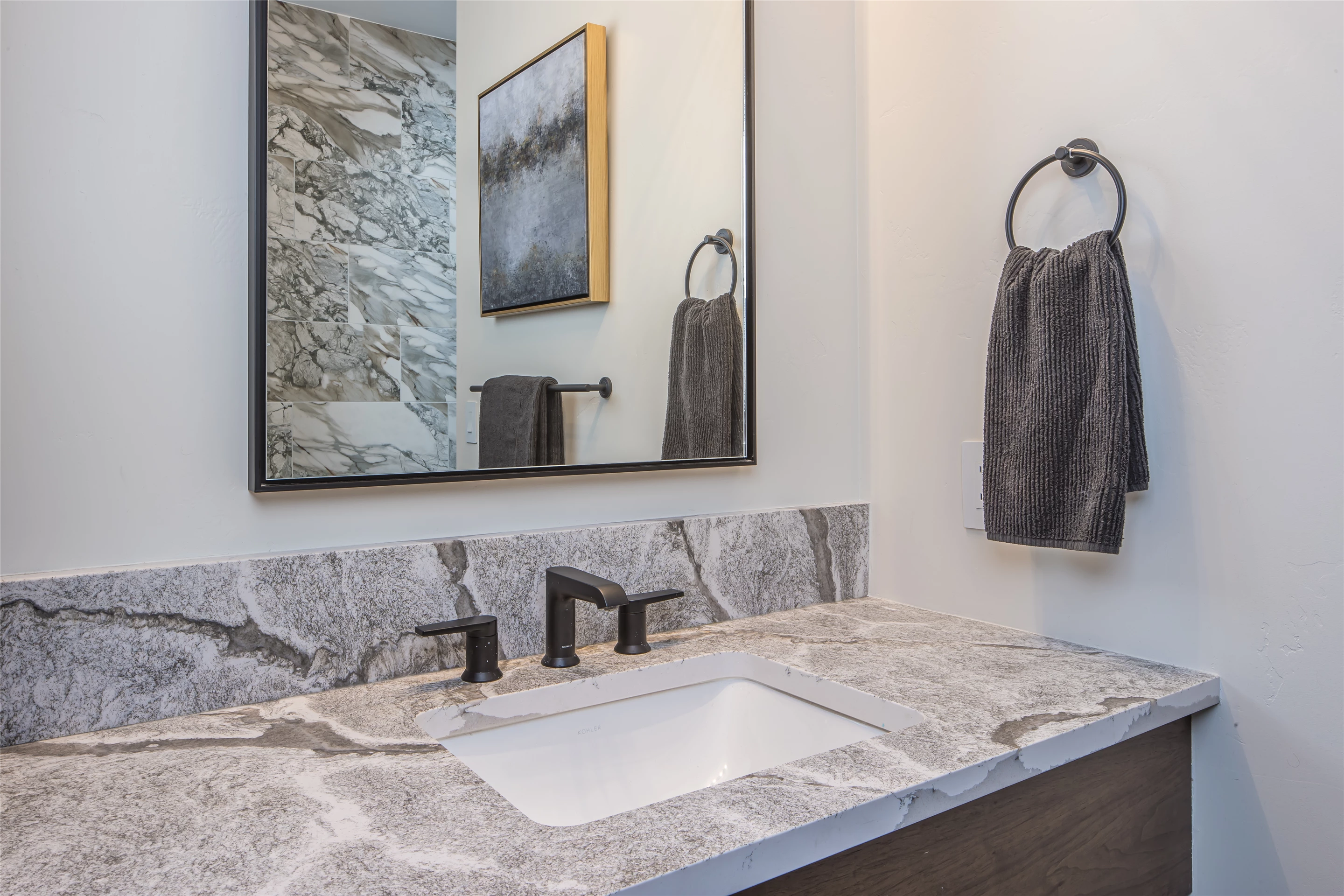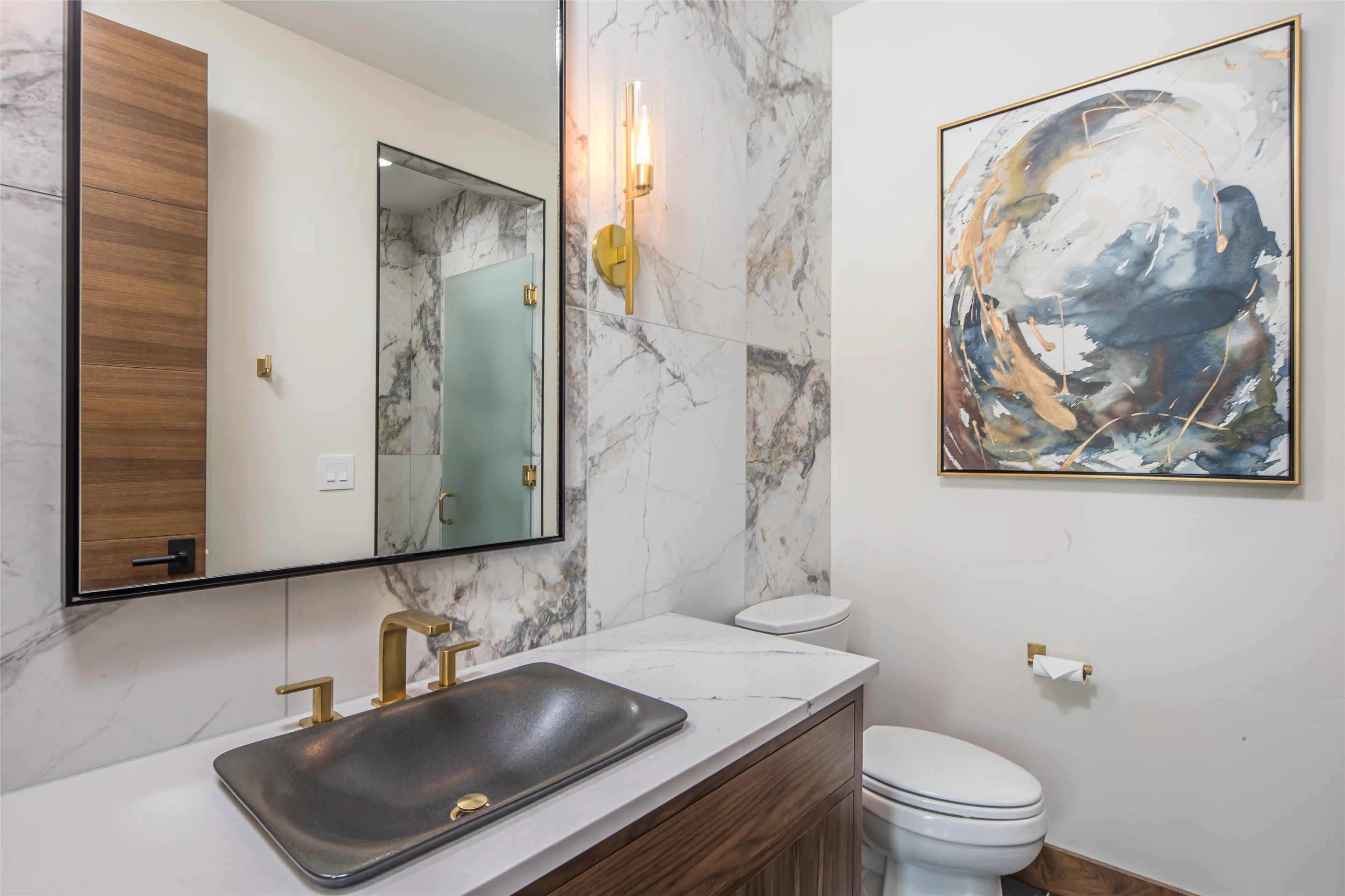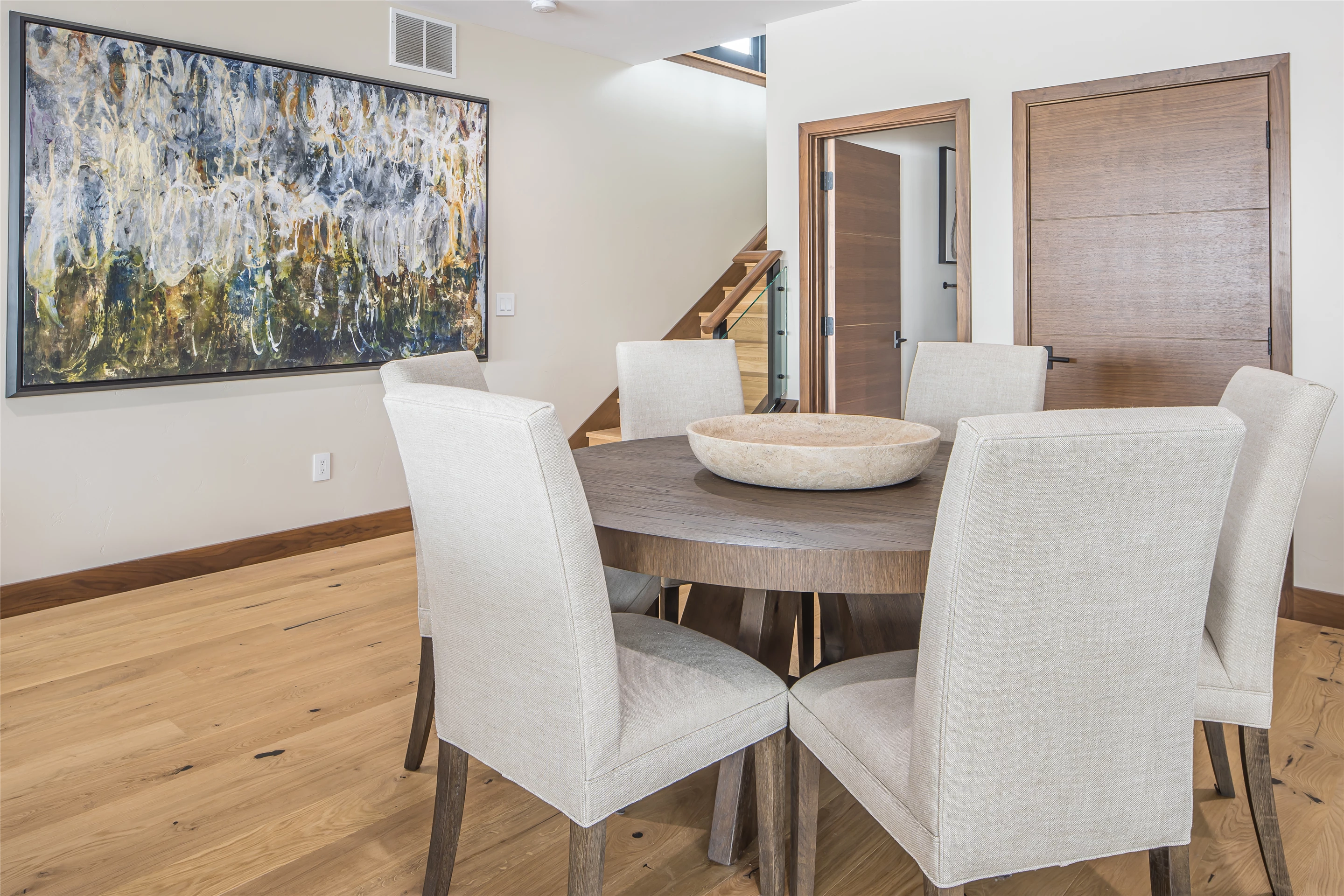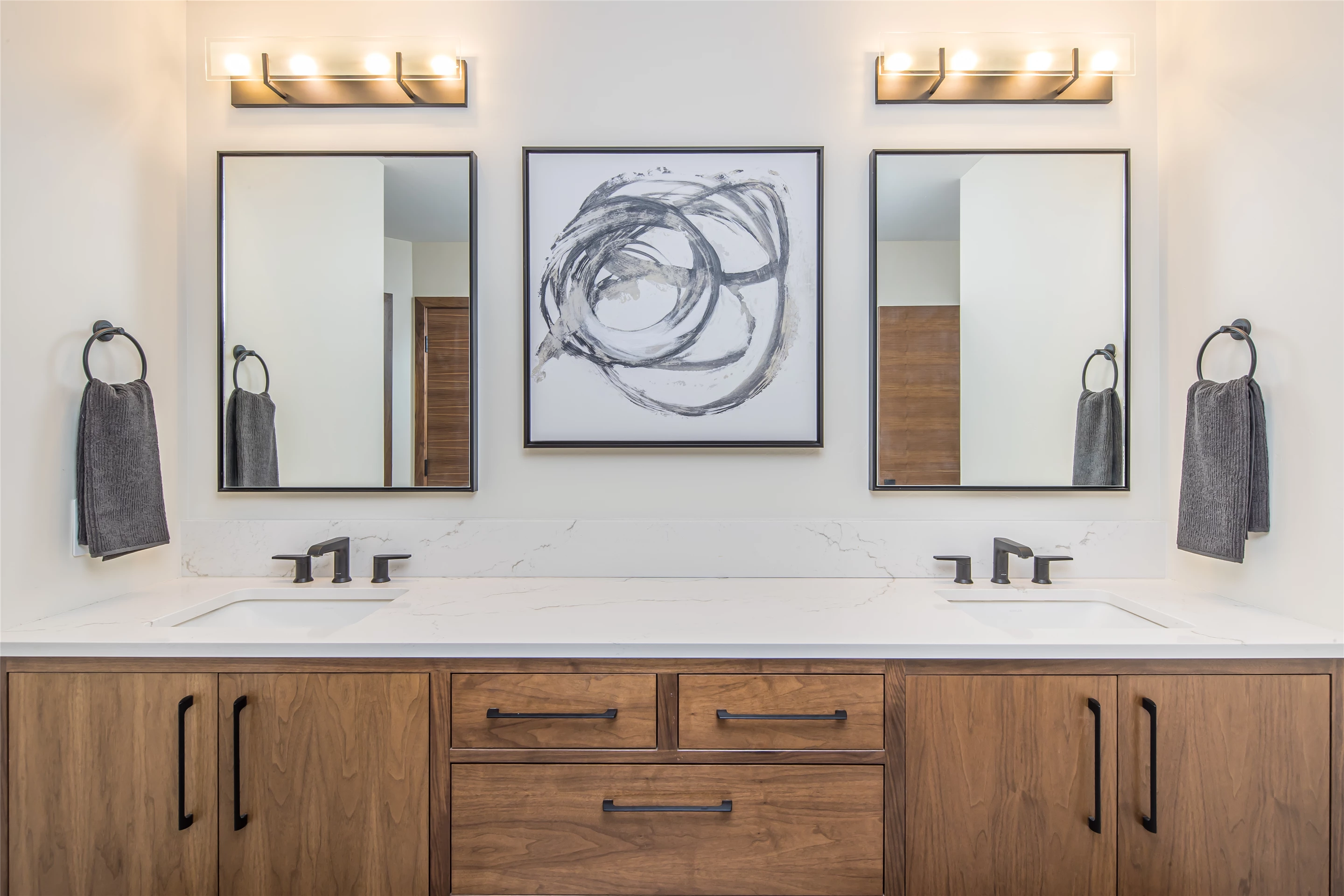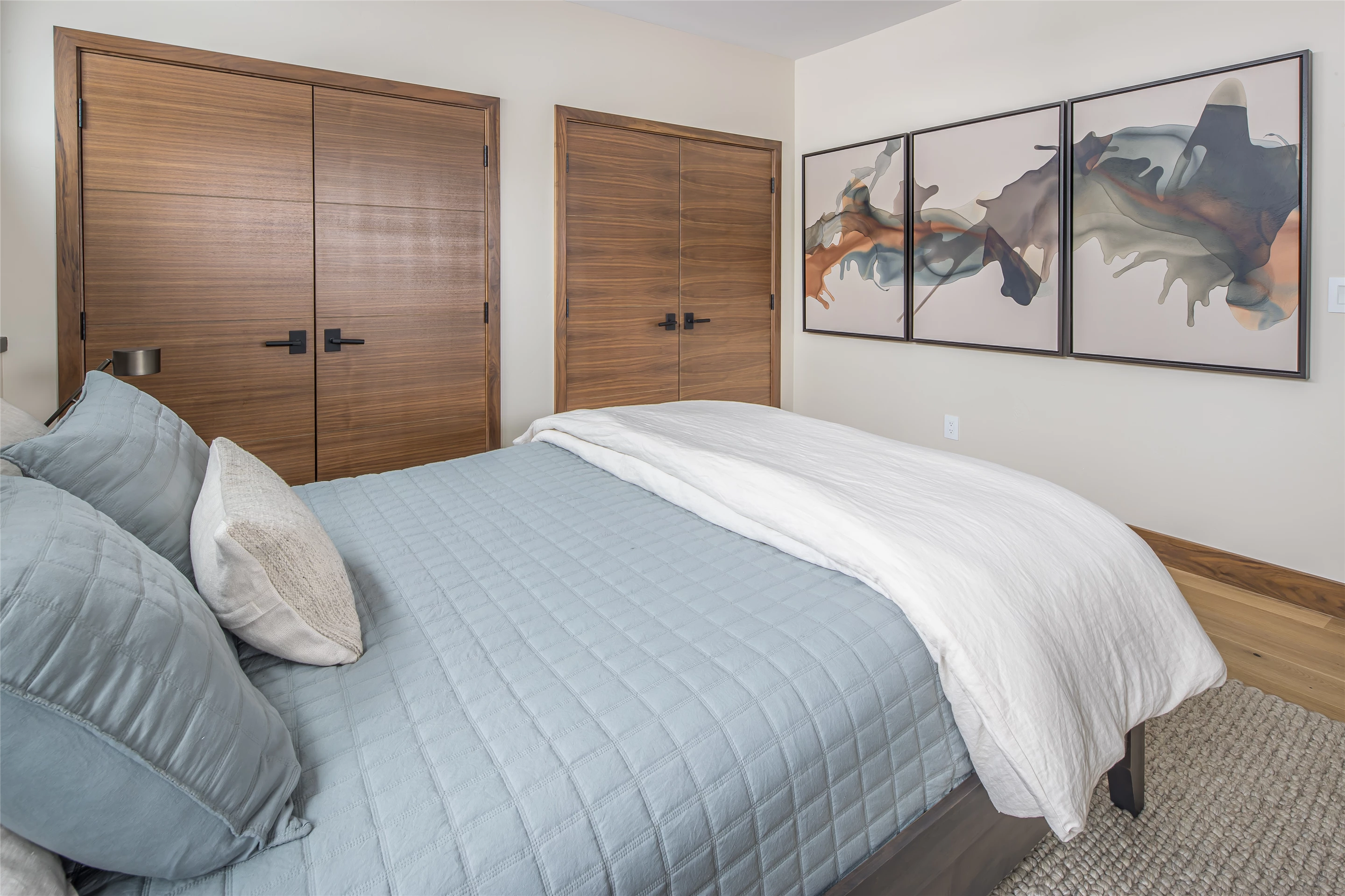 Tucked into the mountainside of Buckridge Ranch, Hartman Homes welcomes you to this modern mountain marvel. The home was architecturally designed to maximize natural light and 360-degree views of the Big Sky Montana Spanish Peaks skyline, incorporating Andersen Windows and Doors. A mix of varied steel textures and beams on the exterior gives the home a contemporary feel. As you enter the sizable see-through foyer, you’re welcomed by large format porcelain floors and luxe light fixtures. The main floor boasts wire-brushed white oak hardwood floors, walnut interior doors and millwork, and an 18ft stone wood-burning fireplace flanked by built-in cabinetry and floating shelves. The modern kitchen offers an abundance of custom walnut cabinetry, a large island with a Cambria top, and corner windows with views to the main entrance. As family and guests enjoy time at the large dining room table, they will take in the seasonal views through the expansive floor-to-ceiling windows and patio doors. The great room finishes off this open space with plenty of seating. The balcony overlooking the property’s acreage, with steel and cable rail and concrete decking, spans the north side of the home and can be accessed from the dining room or great room glass doors. Down the hall from the great room area, you will find the primary suite with views of the outdoors from all sides of the home. A private deck with a hot tub can be reached through the patio doors. The primary bathroom offers plenty of space, and the sliding mirrors over the exterior windows allow natural light to the room. Views of the mountains can be enjoyed through a window in the large walk-in shower. A