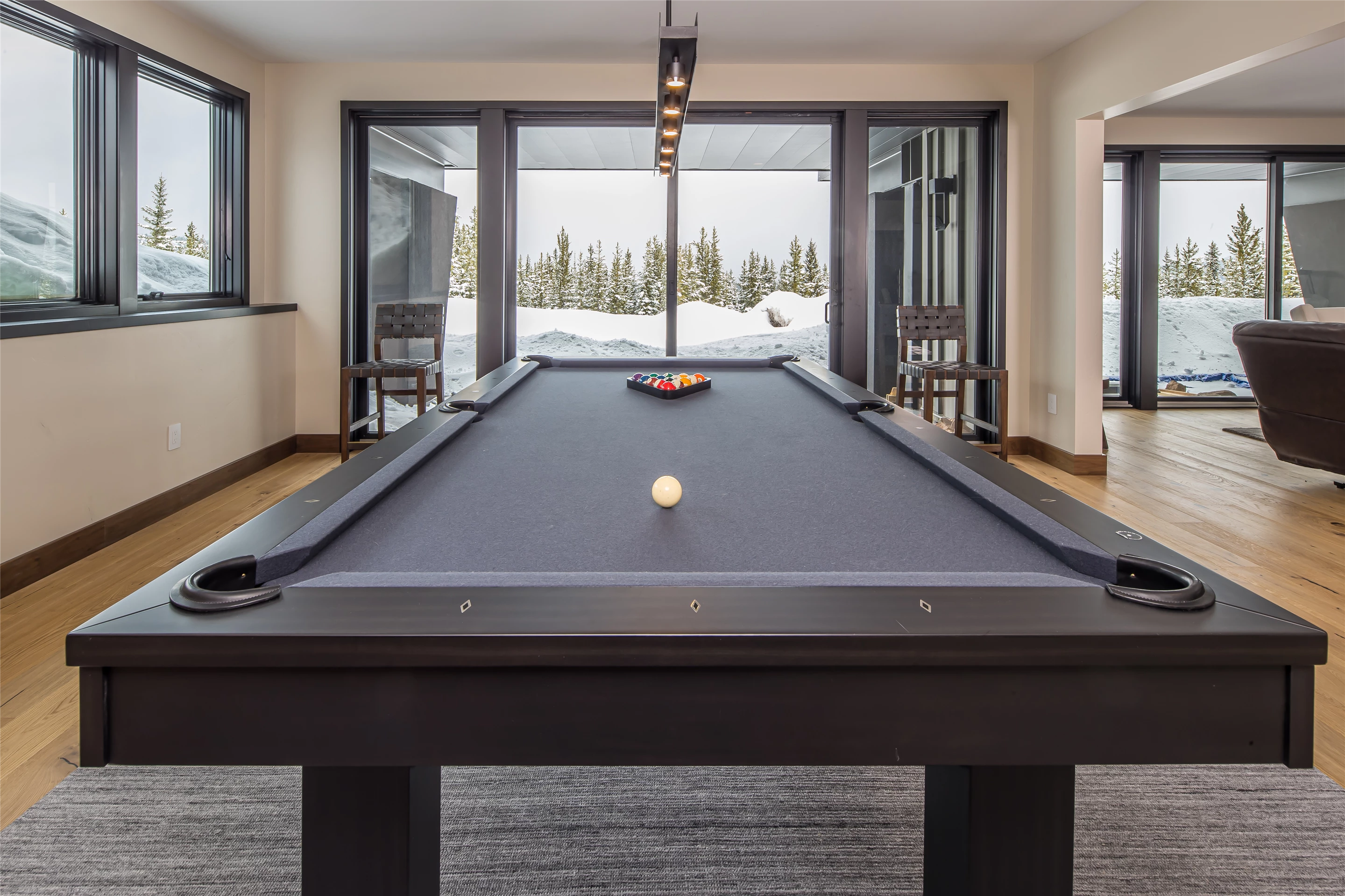 This cozy family room is the perfect place to spend time with the ones you love. Enjoy the beautiful wooded and mountainous view just beyond the floor-to-ceiling windows while you relax by the fire and create memories with your family. Whether you're snuggling up for a movie or just enjoying the view, you can't go wrong in this charming home.
