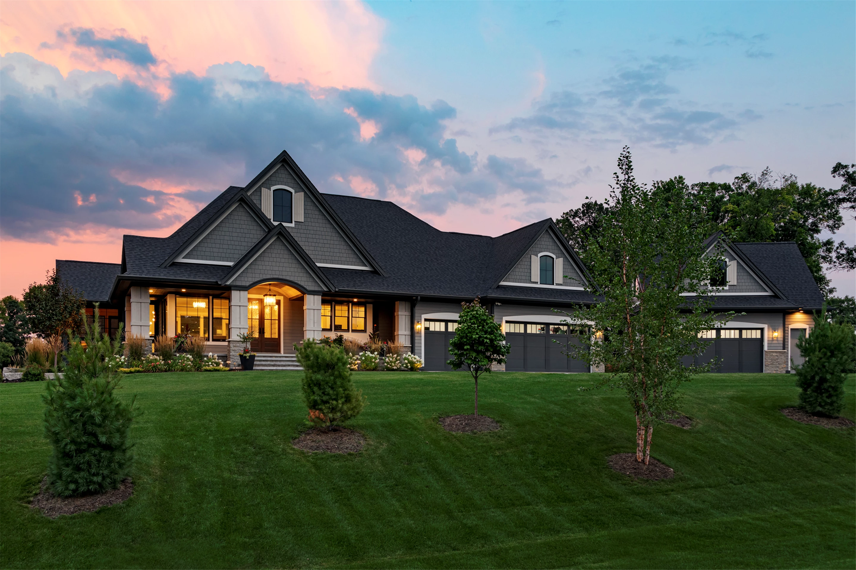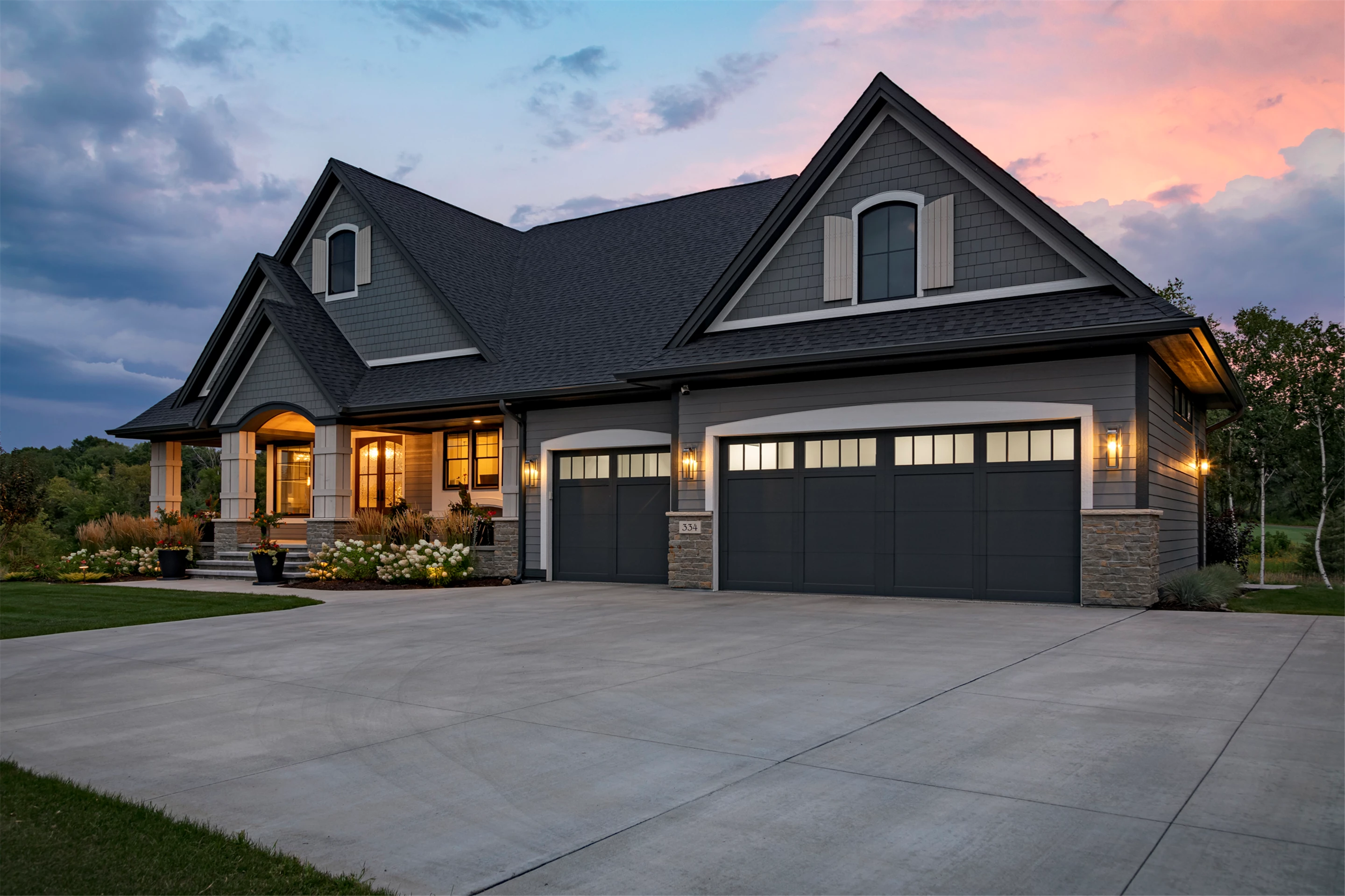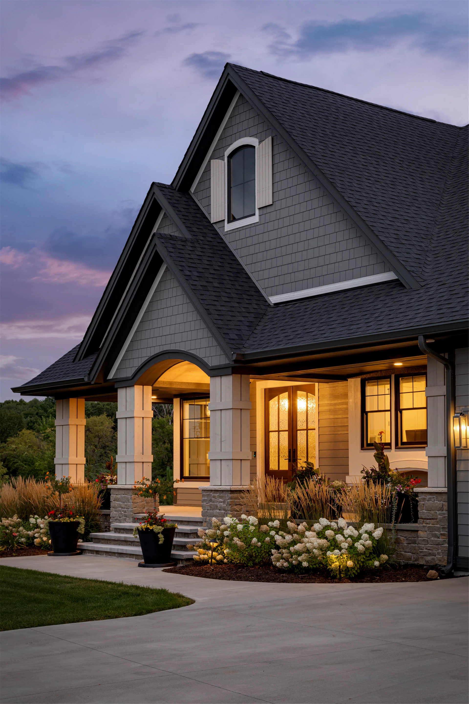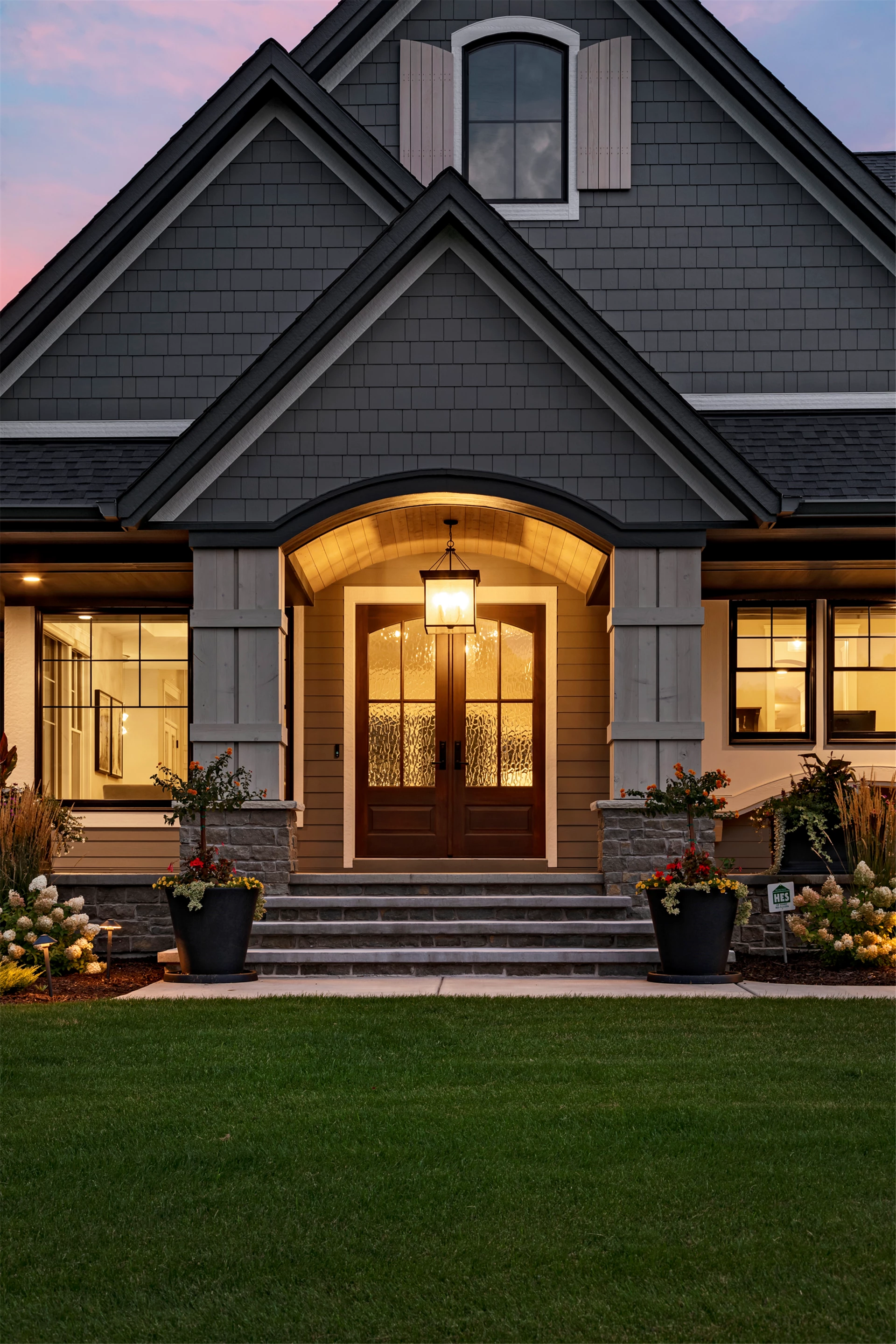 Hardie lap siding, black Andersen Windows and a barrel-vaulted front porch are showcased on the exterior. Wire-brushed maple flooring, painted cabinetry, and Cambria countertops can be found on the main level, along with unique ceiling details, stylish wall coverings, and tasteful accent lighting.