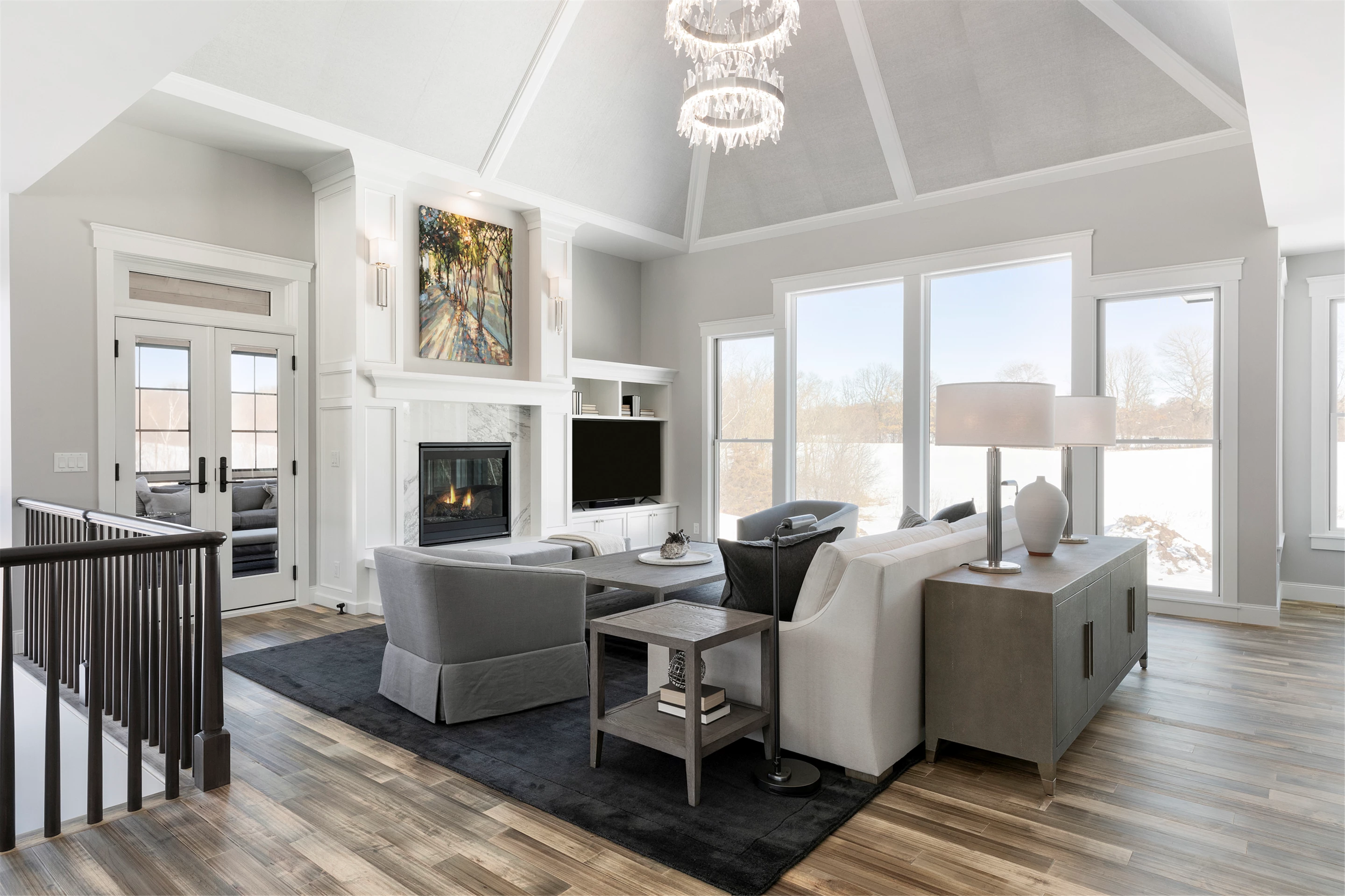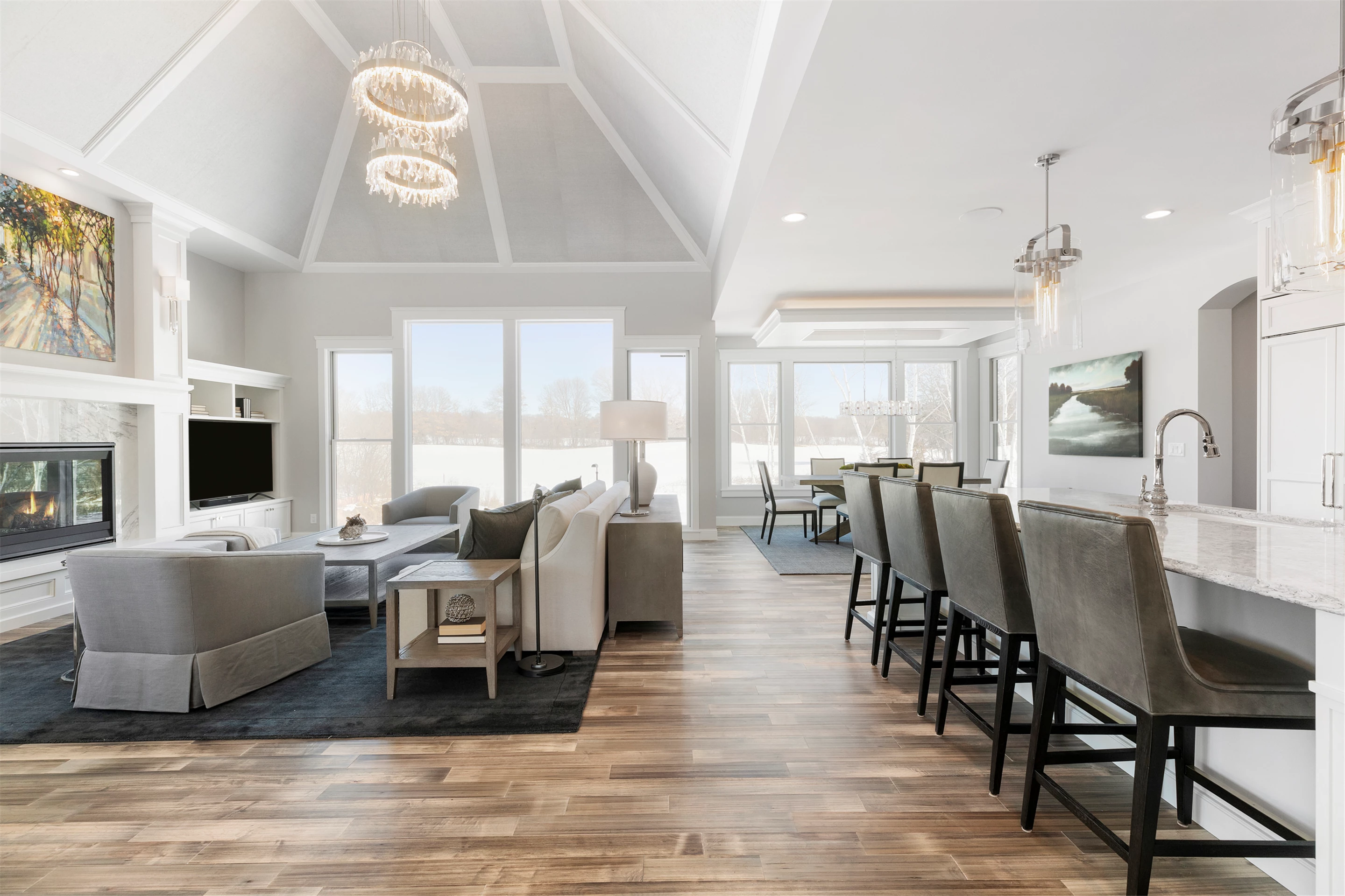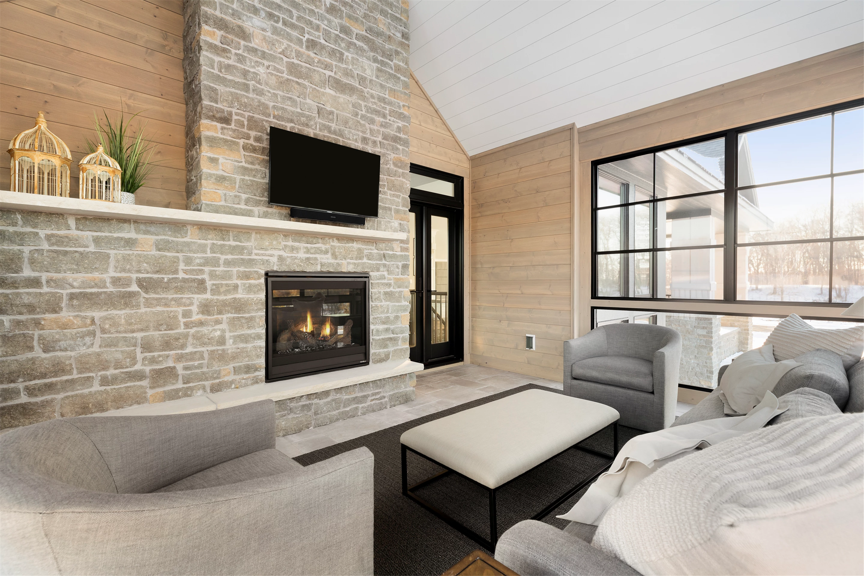 Expansive windows off the great room capture panoramic views of the golf course. The northward-facing 3-season porch boasts a cathedral vaulted ceiling, tile flooring, Sunspace windows, and a beautiful stone surround gas fireplace.