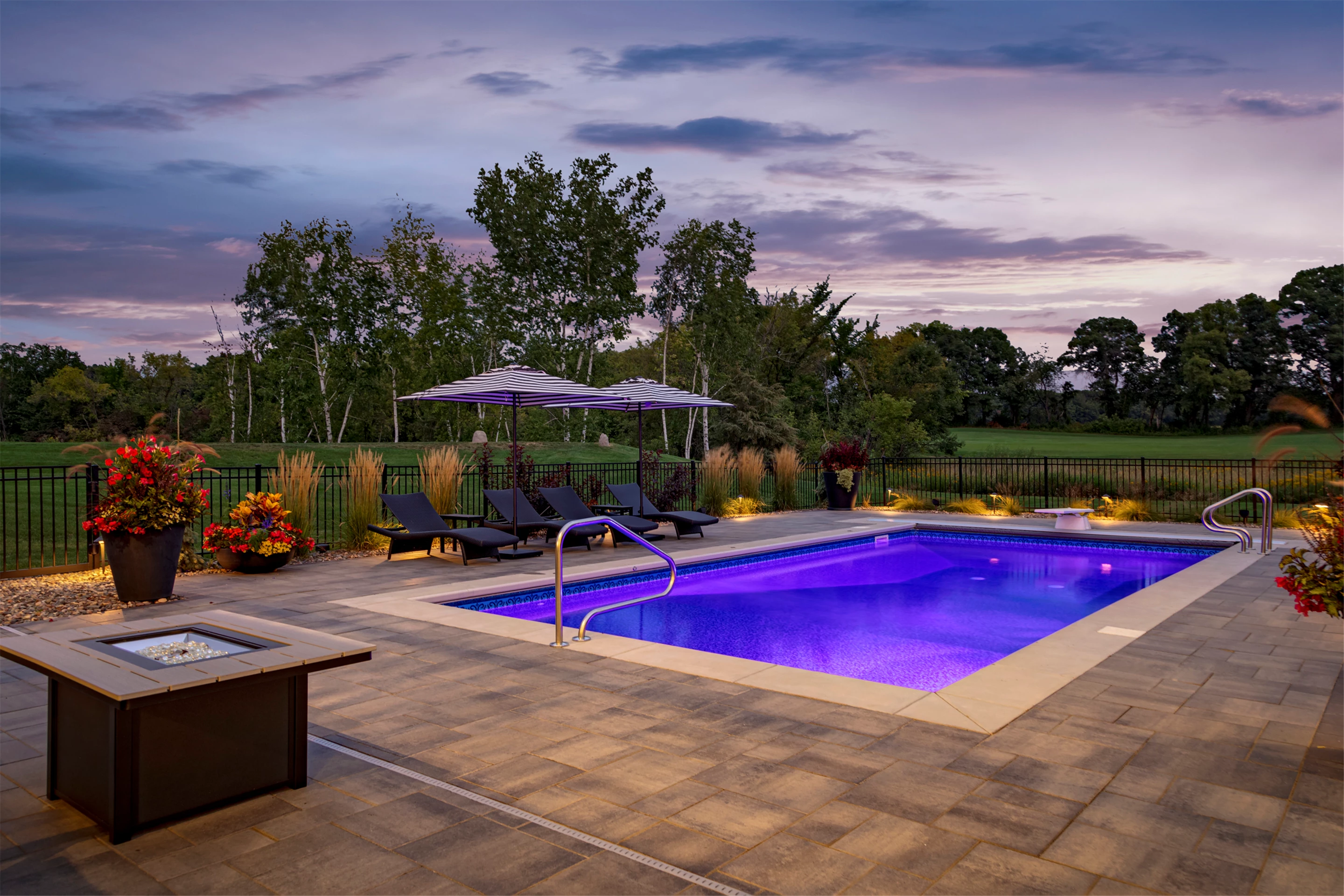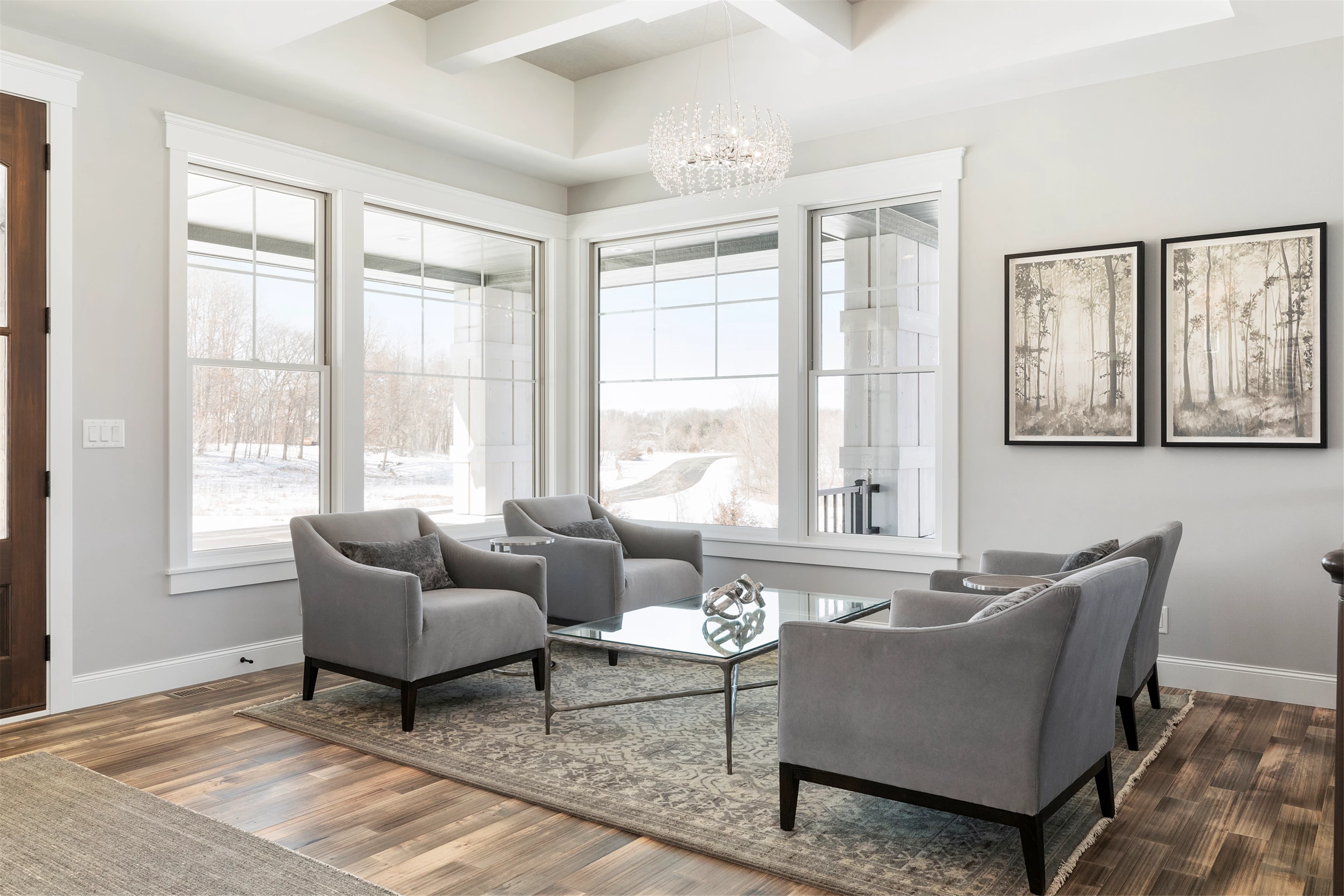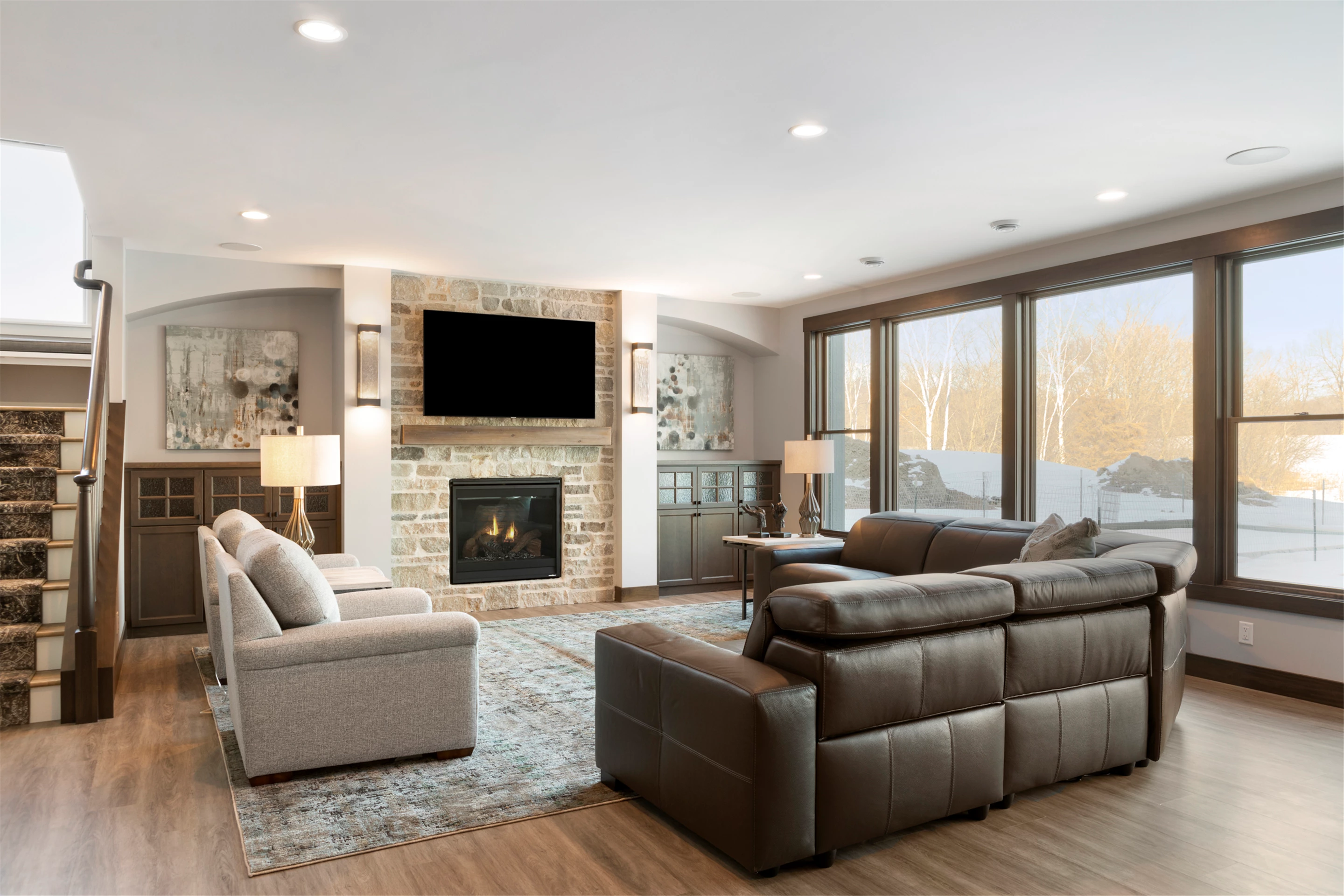 Expansive windows off the great room capture panoramic views of the golf course. The northward-facing 3-season porch boasts a cathedral vaulted ceiling, tile flooring, Sunspace windows, and a beautiful stone surround gas fireplace.