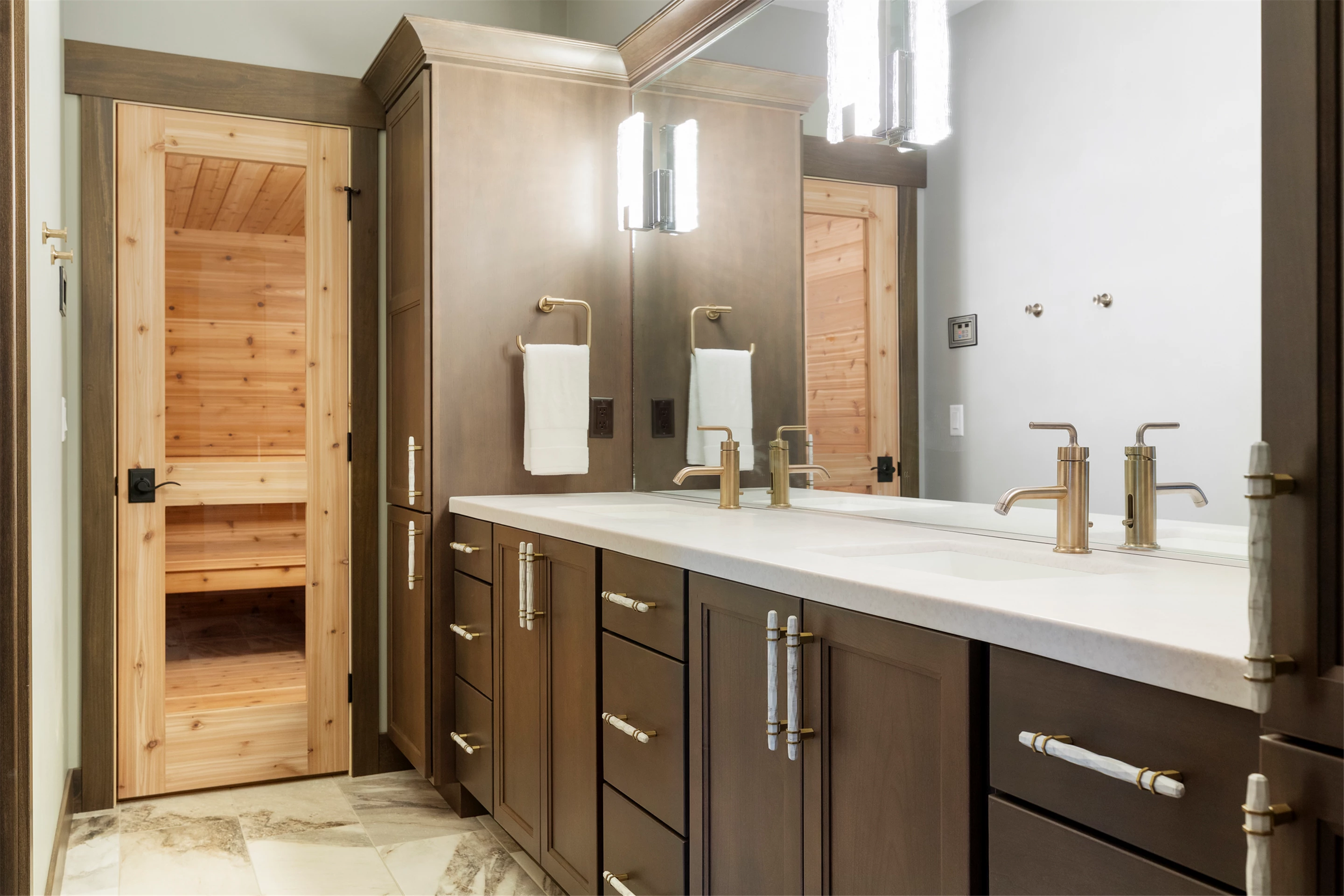 In the walkout lower level, you will find a fully equipped wet bar, large media room, gas fireplace, and sauna. Other features include an upper-level bonus room, a 3-car garage with a dog wash station, a rear garage for golf cart storage, and an oversized 2-car garage with an upper-level bonus room.
