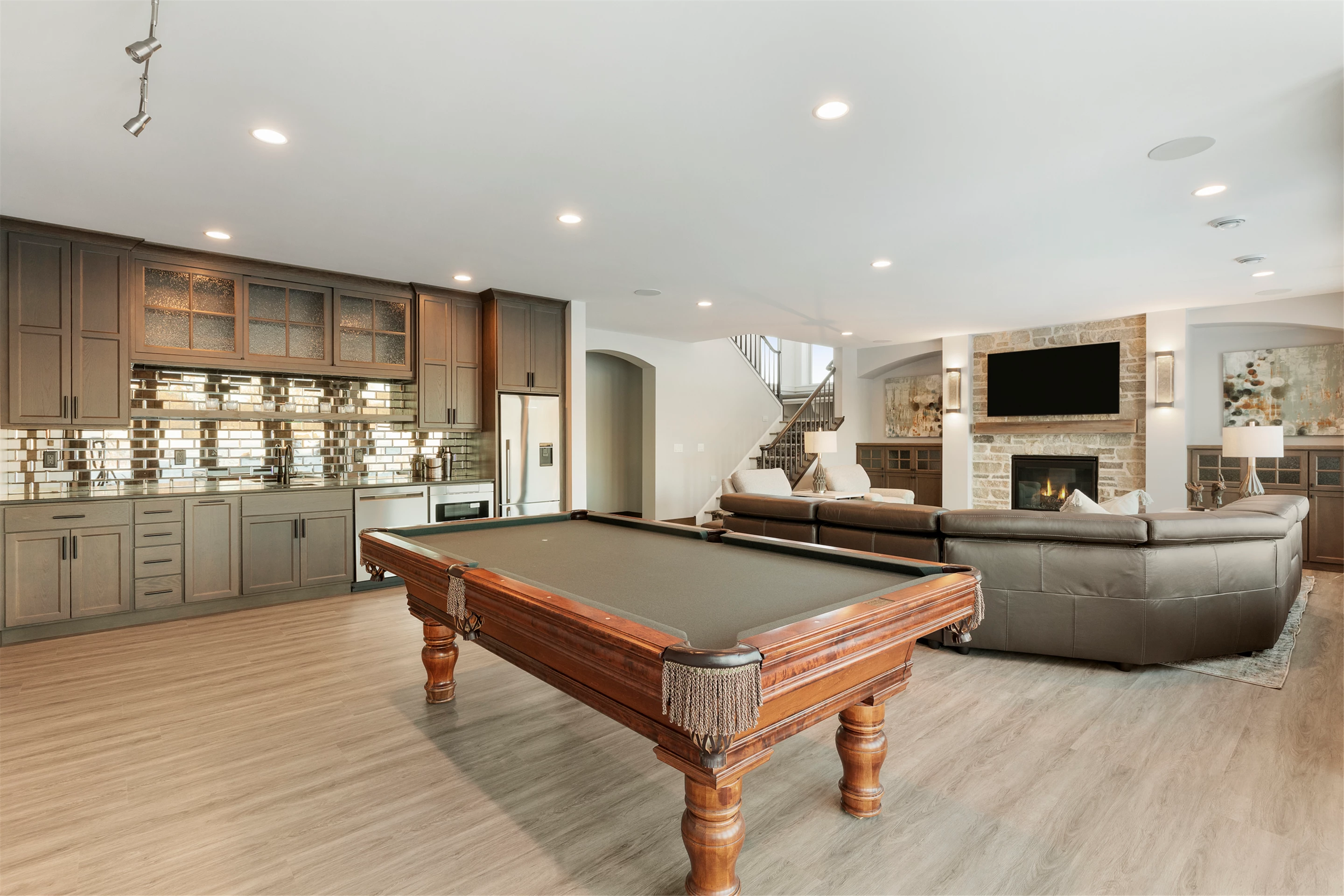 This residence offers an ideal living and entertainment space, with a luxurious pool table creating an elegant focal point for the room. The room boasts a relaxed atmosphere perfect for unwinding after a long day or for having friends over for an enjoyable evening. The home is anchored in a neighborhood with plenty of opportunities for recreation, making it a great place to live and entertain.
