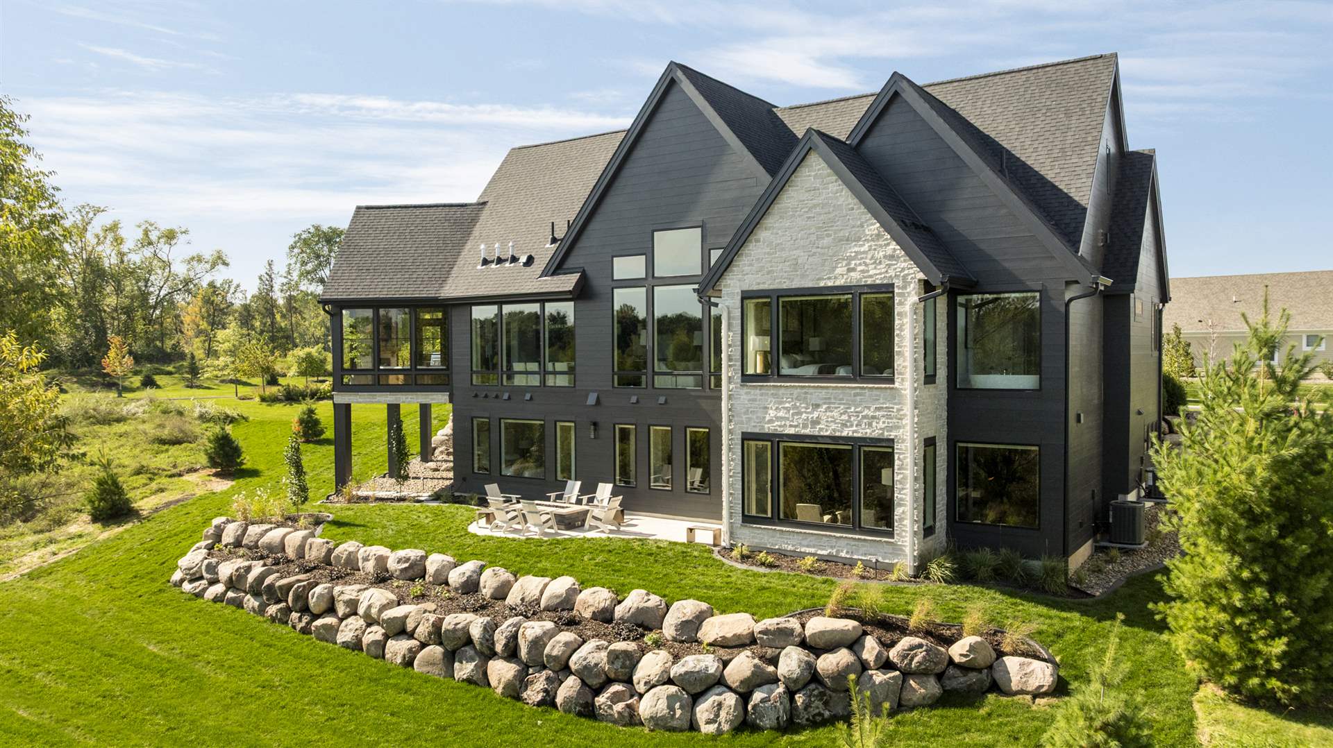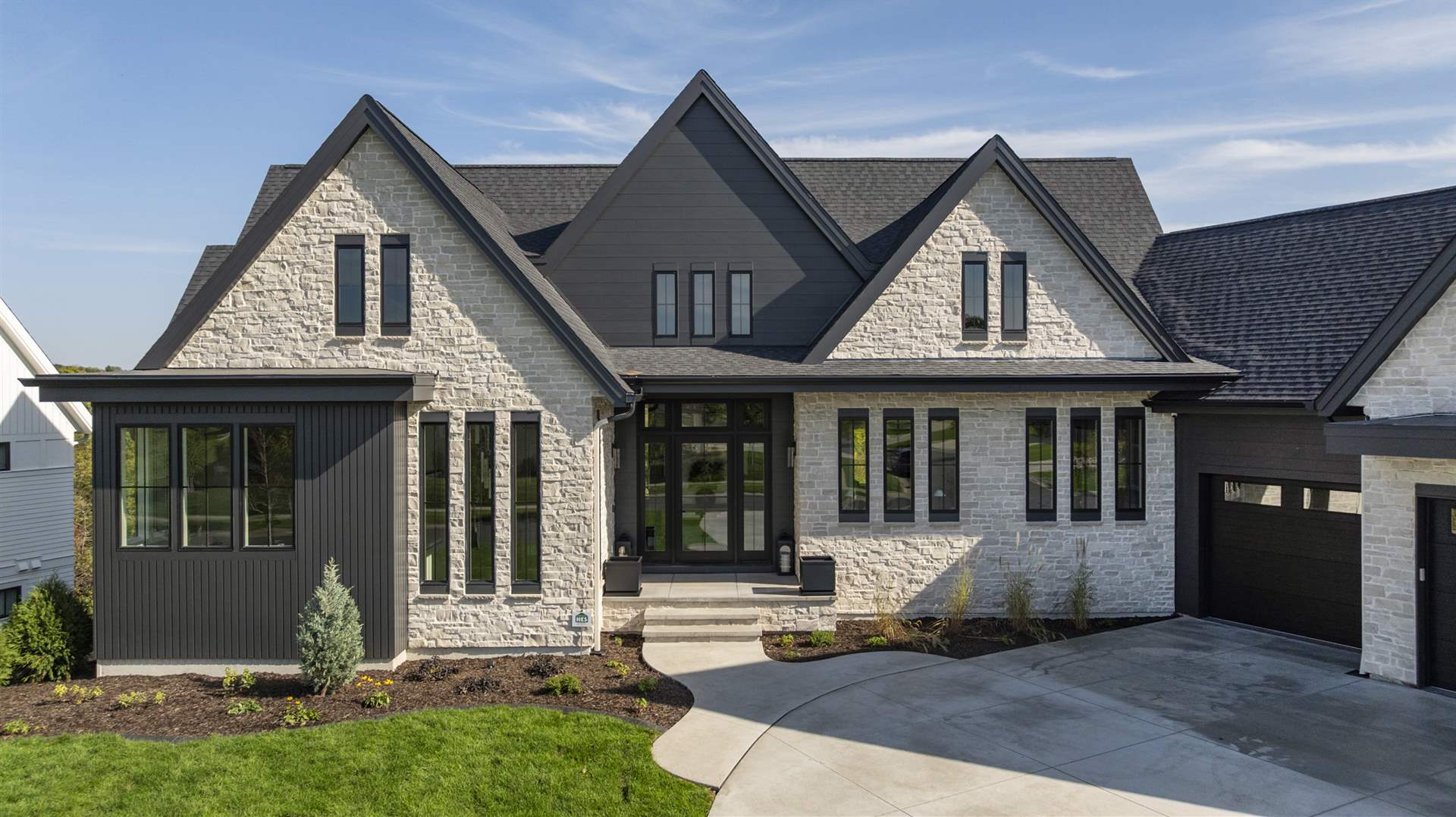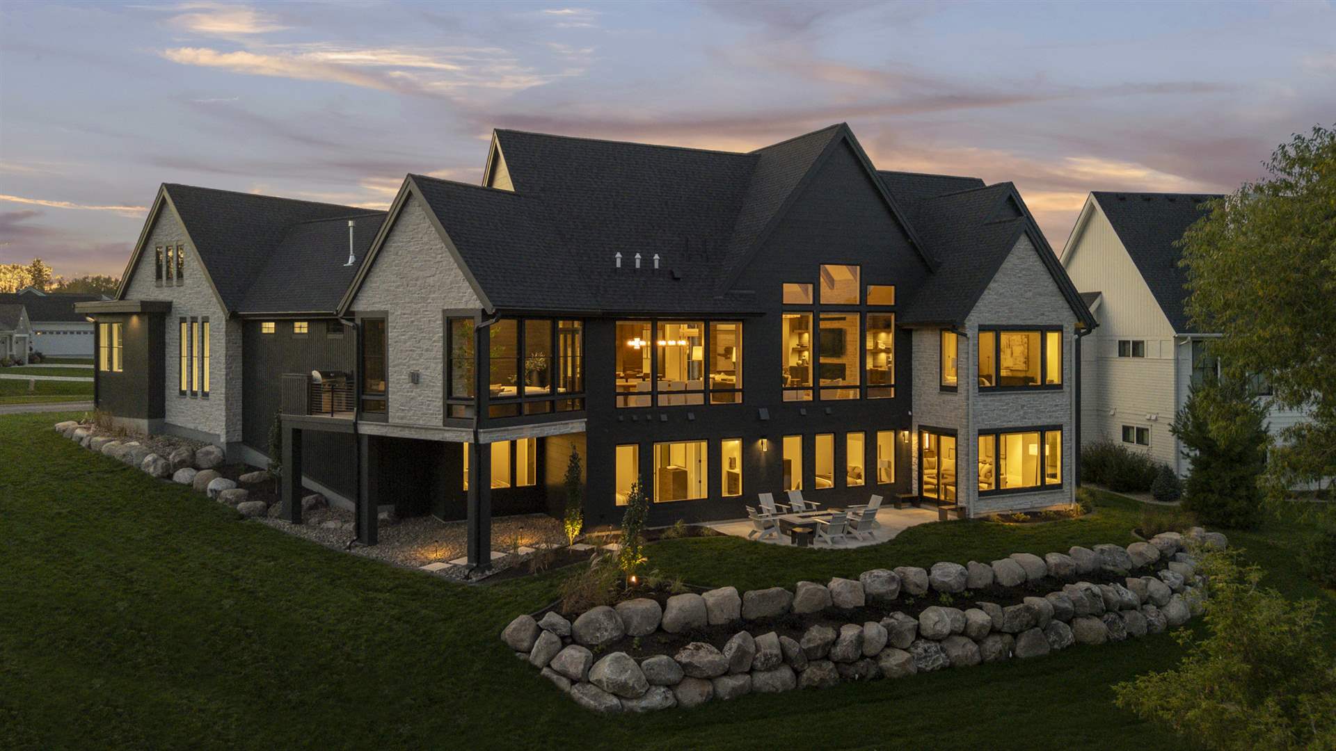 Tucked within the prestigious Royal Golf Club community, this 4-bedroom, 5-bath residence is a masterclass in modern luxury and refined craftsmanship. With access to a private golf course and upscale clubhouse, it offers more than just a place to live—it’s a complete lifestyle. The exterior makes a bold impression with its striking use of White Country Squire stone and moody dark siding. Flat roof accents and narrow window configurations give the home a sleek, architectural edge that stands out with subtle confidence. Inside, white oak flooring runs throughout, setting the tone fan elevated material palette that displays a rich mix of walnut, painted, and rift-cut white oak cabinetry. The vaulted great room features beams and a dramatic floor-to-ceiling stone fireplace, creating a warm, open gathering space. The kitchen pairs Cambria Montaaj and Macbeth countertops with full slab backsplashes and a standout reverse box ceiling detail. Waterfall-style cabinetry and a tucked-away wine bar finished in Cambria Charlestown add thoughtful touches of style and function. A working pantry and large mudroom with built-ins and a walk-in closet keep daily life organized. The home office, clad in rift-cut white oak, is both quiet and polished. The primary wing includes its own laundry, giving added convenience and privacy. Downstairs, three guest bedrooms, a second fireplace, and a full bar finished in Cambria Remington Brass make entertaining easy. There’s also a music room and dedicated exercise room with a sauna, rounding out the lower level. Outdoor living is seamlessly integrated with a vaulted screen porch, featuring a floor-to-ceiling stone fireplace and an adjacent grill deck perfect for entertaining in any season. Whether hosting a sunset dinner party or enjoying a quiet morning coffee, the spaces invite connection to the outdoors without sacrificing comfort. This home strikes the ideal balance between bold design and livable comfort, offering timeless style in one of the Twin Cities’ most desirable golf communities.