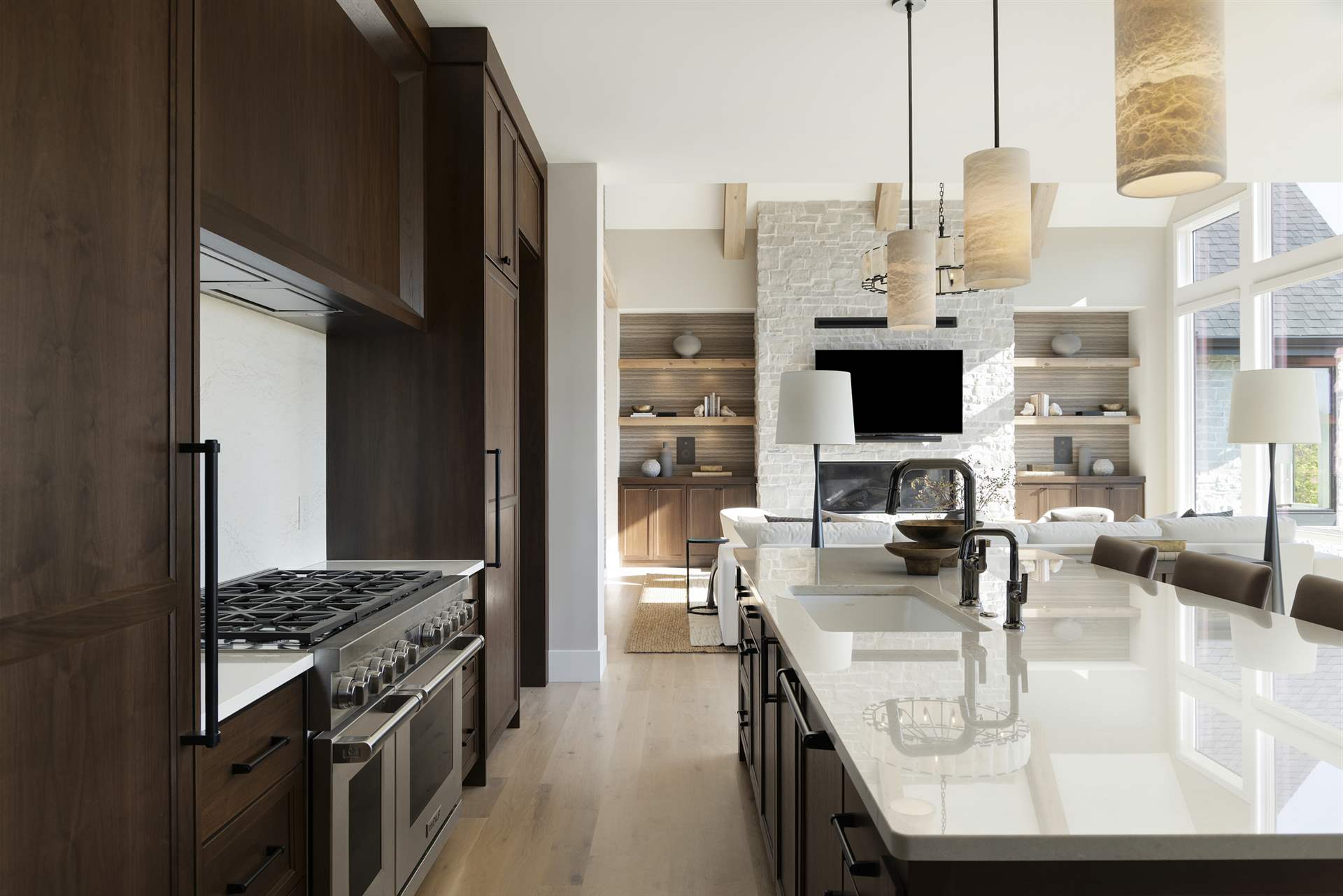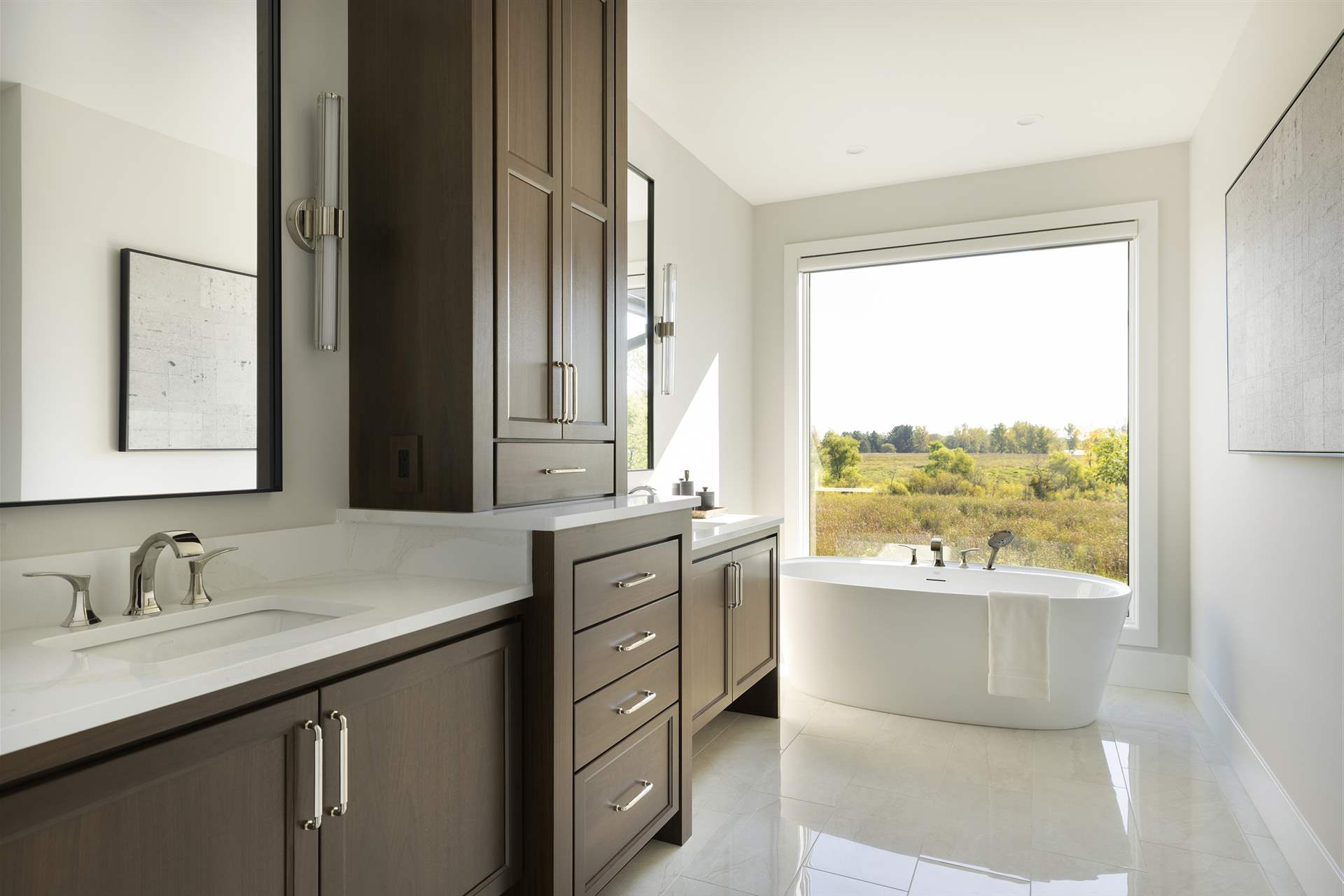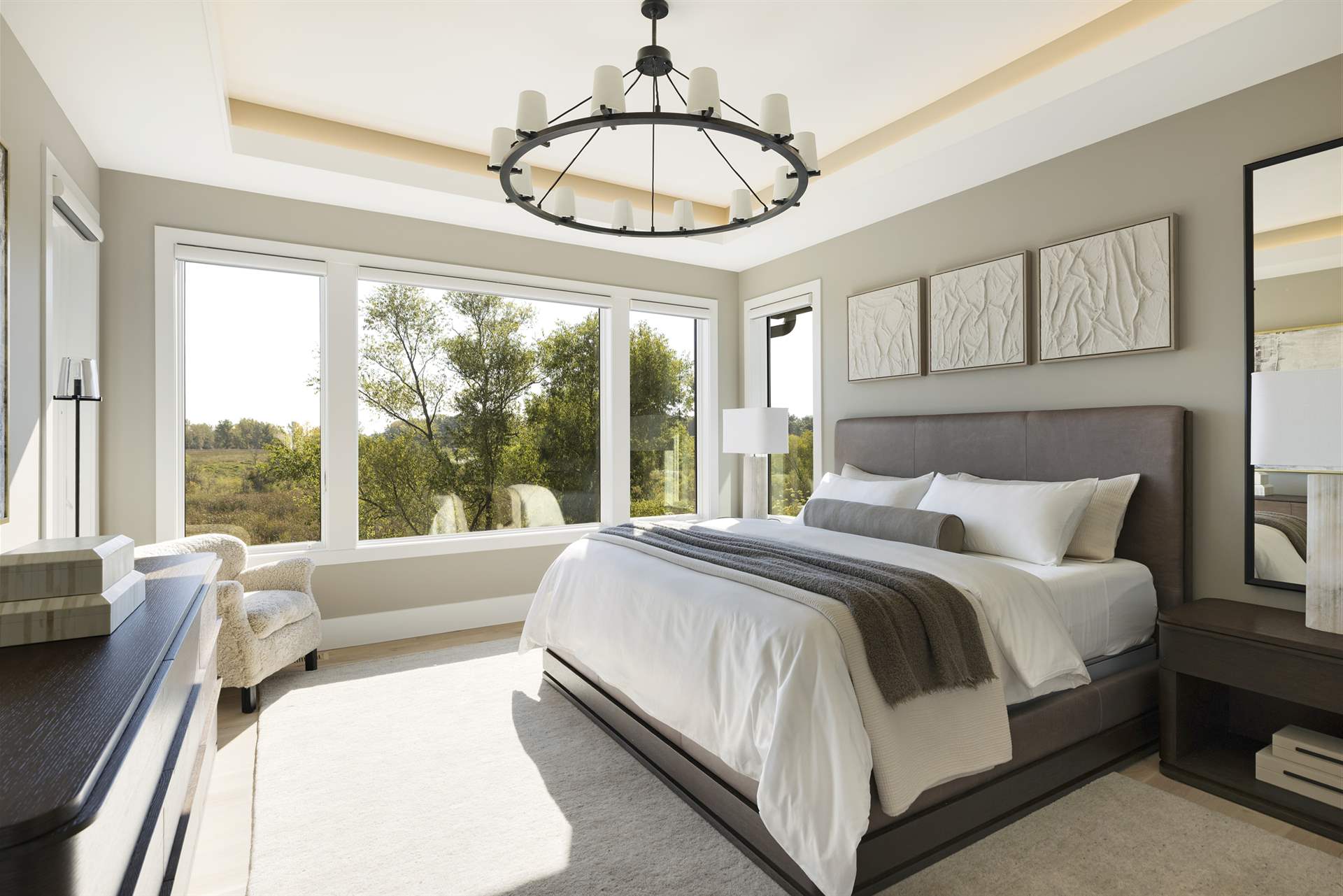 Tucked within the prestigious Royal Golf Club community, this 4-bedroom, 5-bath residence is a masterclass in modern luxury and refined craftsmanship. With access to a private golf course and upscale clubhouse, it offers more than just a place to live—it’s a complete lifestyle. The exterior makes a bold impression with its striking use of White Country Squire stone and moody dark siding. Flat roof accents and narrow window configurations give the home a sleek, architectural edge that stands out with subtle confidence. Inside, white oak flooring runs throughout, setting the tone fan elevated material palette that displays a rich mix of walnut, painted, and rift-cut white oak cabinetry. The vaulted great room features beams and a dramatic floor-to-ceiling stone fireplace, creating a warm, open gathering space. The kitchen pairs Cambria Montaaj and Macbeth countertops with full slab backsplashes and a standout reverse box ceiling detail. Waterfall-style cabinetry and a tucked-away wine bar finished in Cambria Charlestown add thoughtful touches of style and function. A working pantry and large mudroom with built-ins and a walk-in closet keep daily life organized. The home office, clad in rift-cut white oak, is both quiet and polished. The primary wing includes its own laundry, giving added convenience and privacy. Downstairs, three guest bedrooms, a second fireplace, and a full bar finished in Cambria Remington Brass make entertaining easy. There’s also a music room and dedicated exercise room with a sauna, rounding out the lower level. Outdoor living is seamlessly integrated with a vaulted screen porch, featuring a floor-to-ceiling stone fireplace and an adjacent grill deck perfect for entertaining in any season. Whether hosting a sunset dinner party or enjoying a quiet morning coffee, the spaces invite connection to the outdoors without sacrificing comfort. This home strikes the ideal balance between bold design and livable comfort, offering timeless style in one of the Twin Cities’ most desirable golf communities.