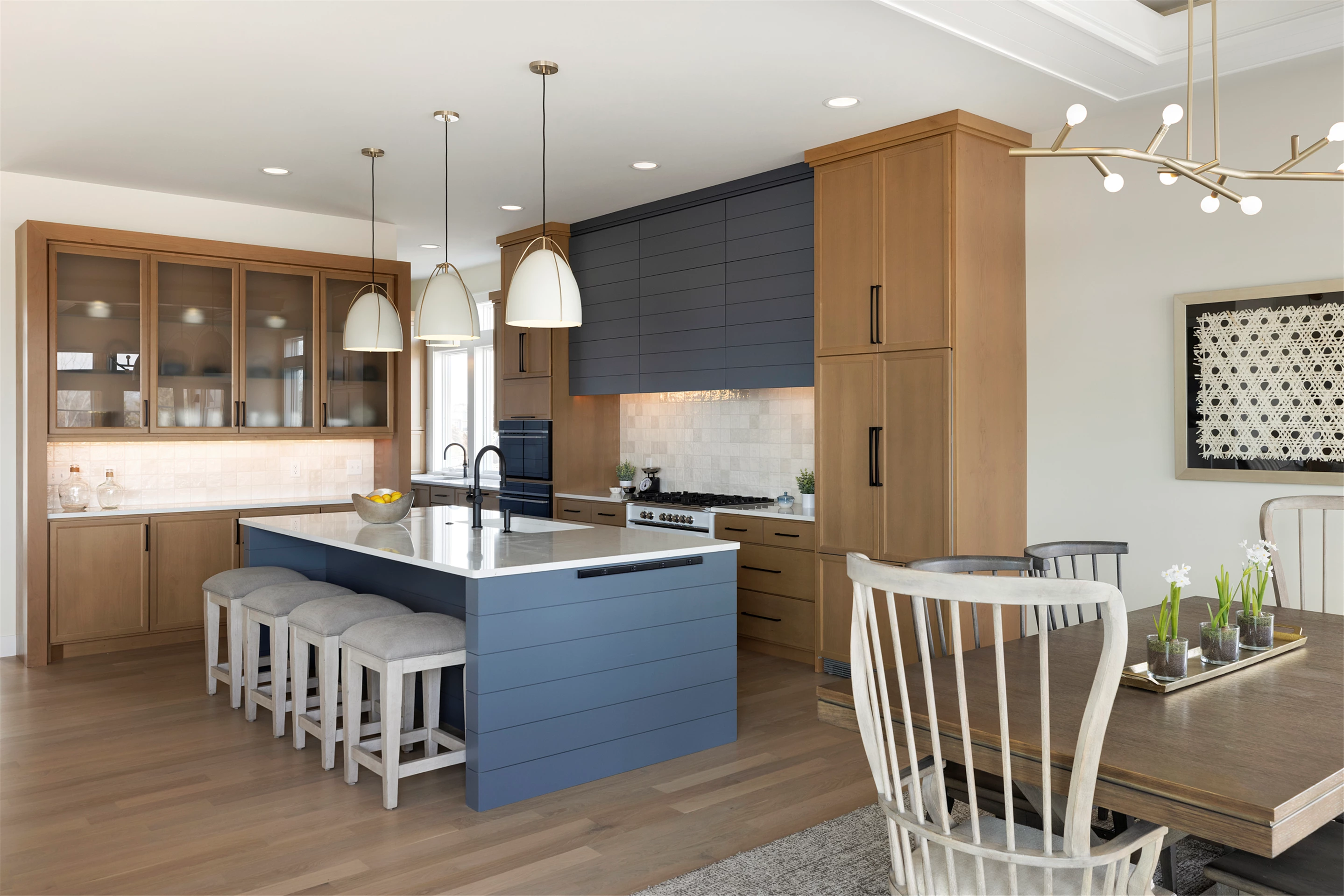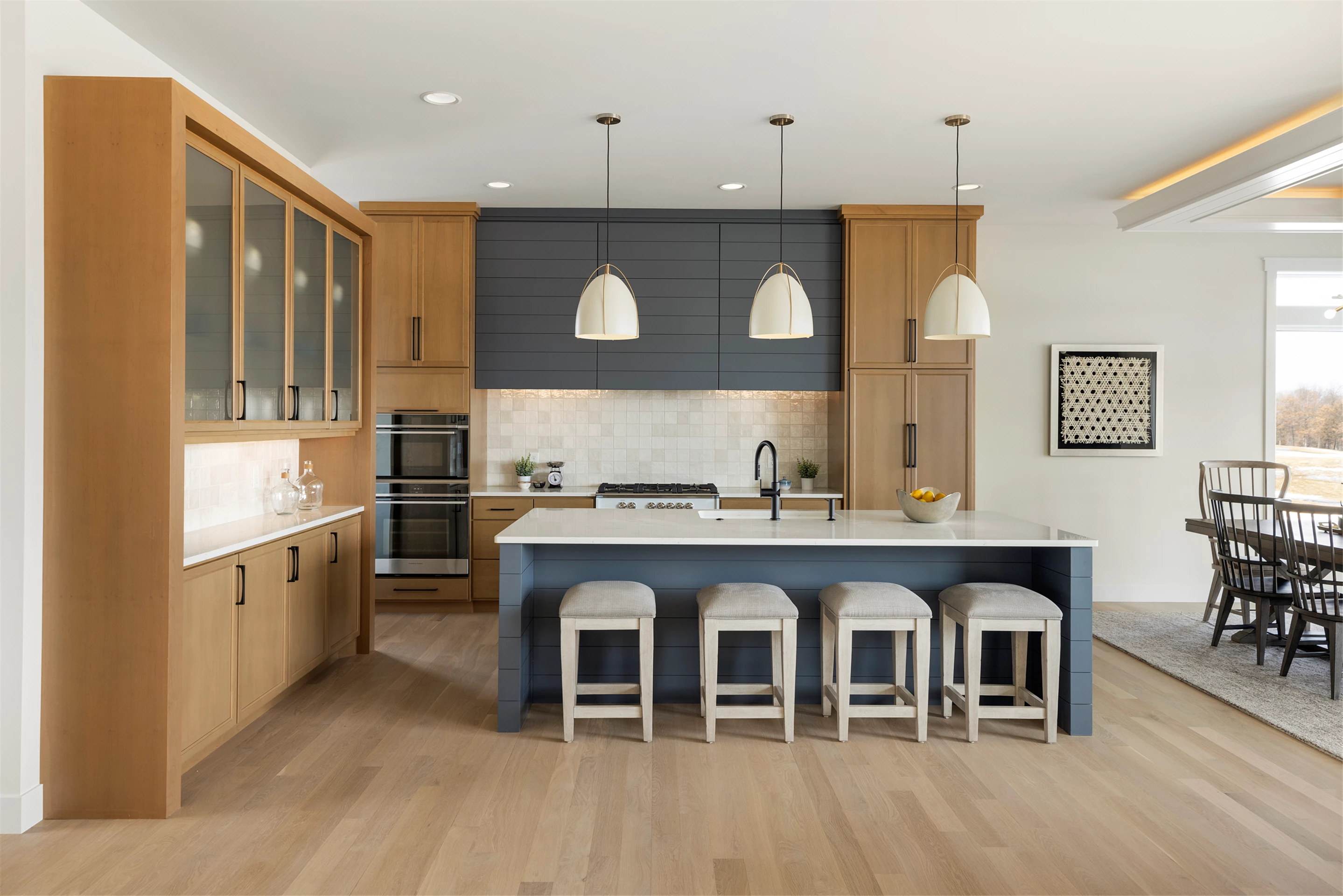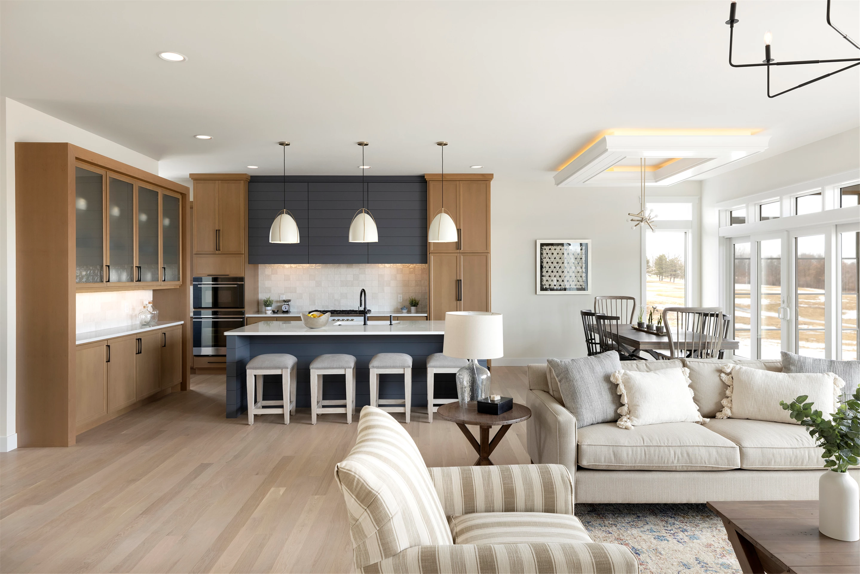 Inside this Scandi Modern Cottage, you’ll find stained alder wood cabinetry on the kitchen perimeter, Slate Blue painted island, Corian Quartz counters, and white oak flooring. The thoughtfully designed wrap-around pantry w/sink, refrigerator/freezer drawers, and open shelving add to the room's functionality. Expansive windows in the great room allow for ample natural lighting. Other features include a reverse box vault in the dining room. Sliding patio doors open up to the 3 season porch with Spiced Rum Trex flooring. The upper level offers two additional bedrooms, a full bath, and a large family room with a deck that offers gorgeous panoramic lake & golf course views - perfect for entertaining!