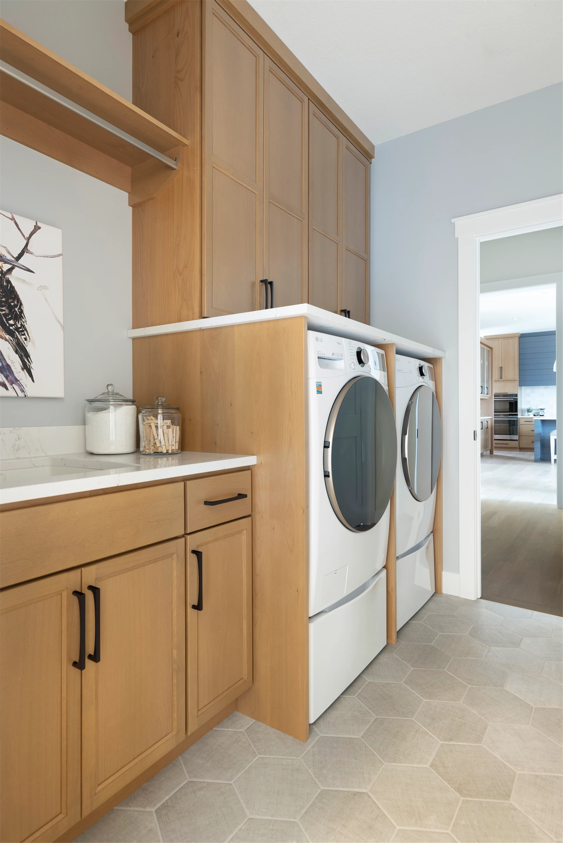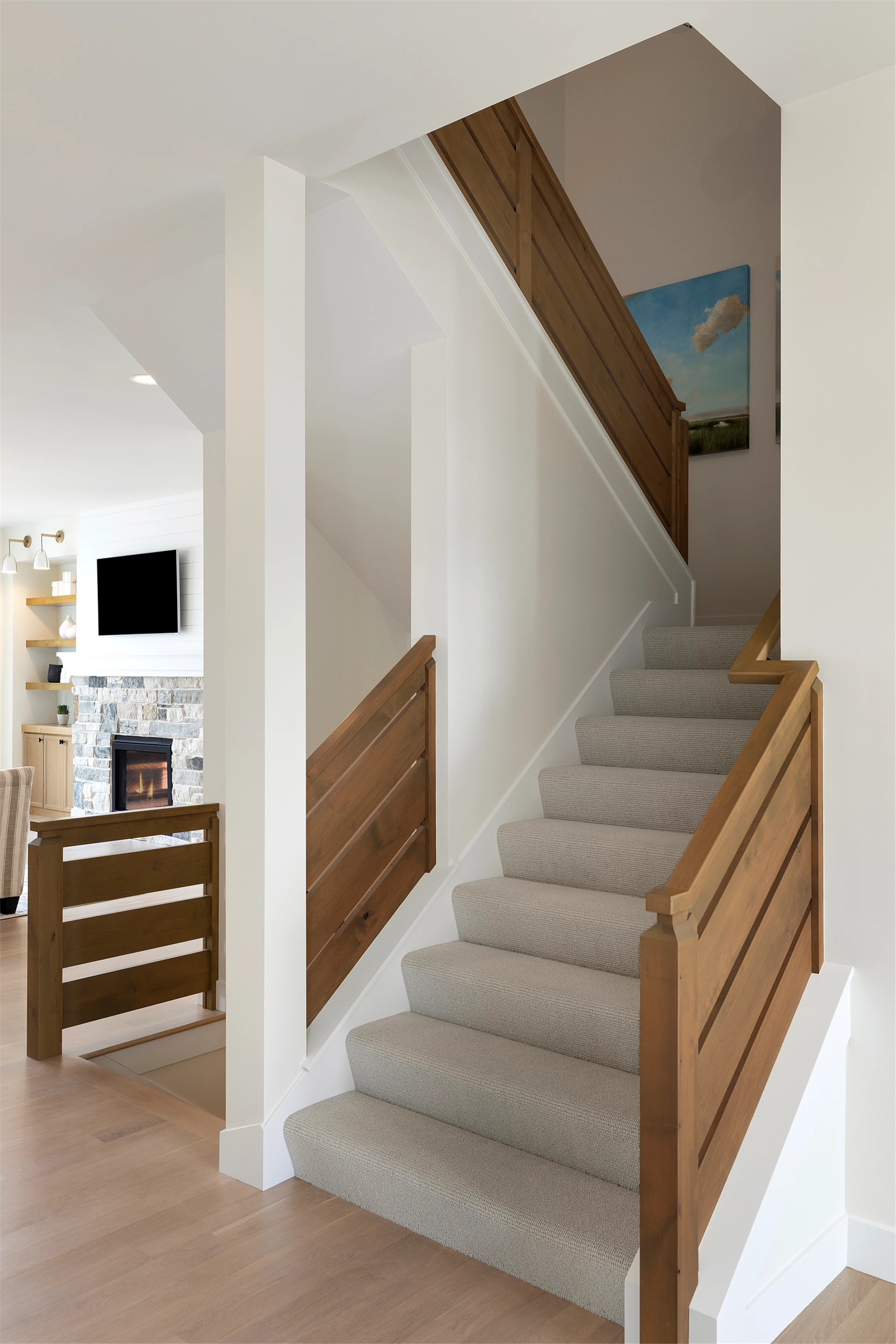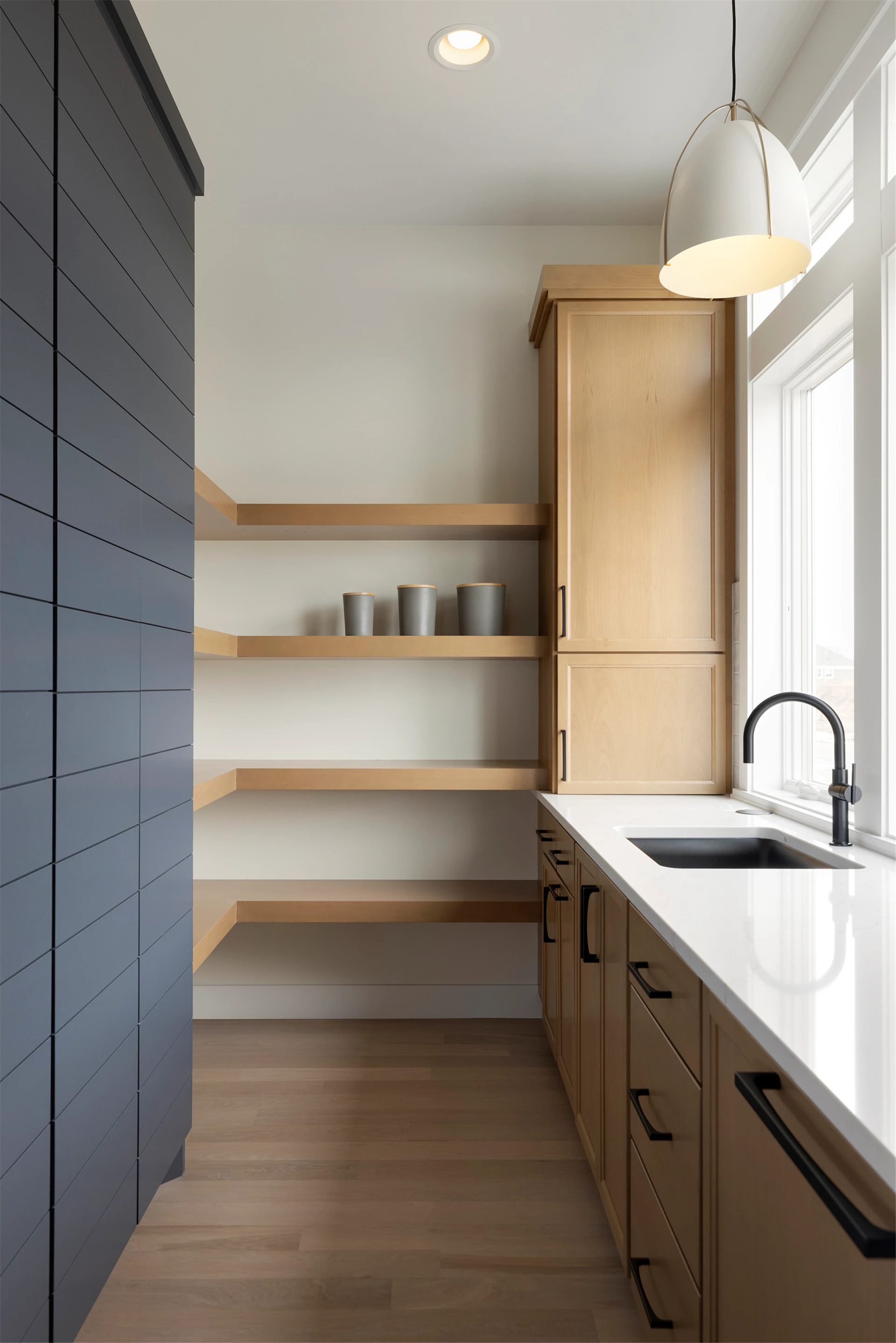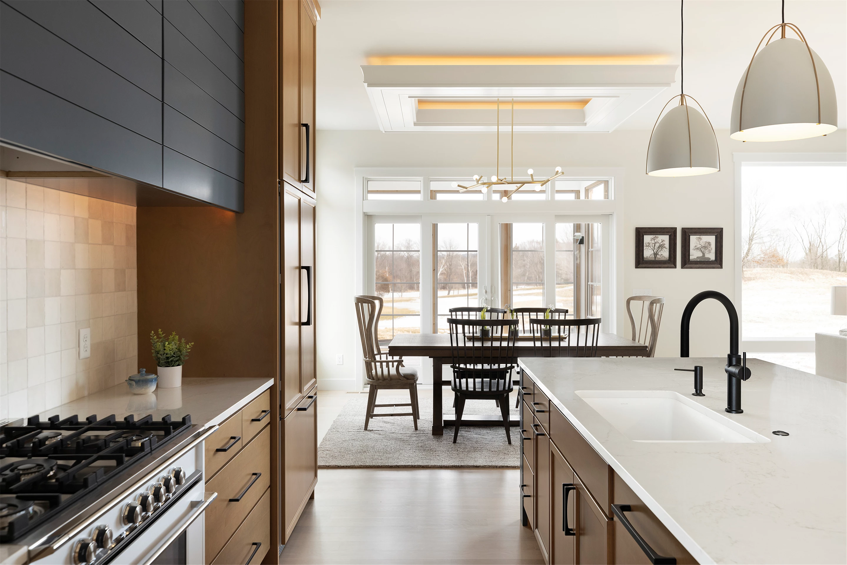 Inside this Scandi Modern Cottage, you’ll find stained alder wood cabinetry on the kitchen perimeter, Slate Blue painted island, Corian Quartz counters, and white oak flooring. The thoughtfully designed wrap-around pantry w/sink, refrigerator/freezer drawers, and open shelving add to the room's functionality. Expansive windows in the great room allow for ample natural lighting. Other features include a reverse box vault in the dining room. Sliding patio doors open up to the 3 season porch with Spiced Rum Trex flooring. The upper level offers two additional bedrooms, a full bath, and a large family room with a deck that offers gorgeous panoramic lake & golf course views - perfect for entertaining!