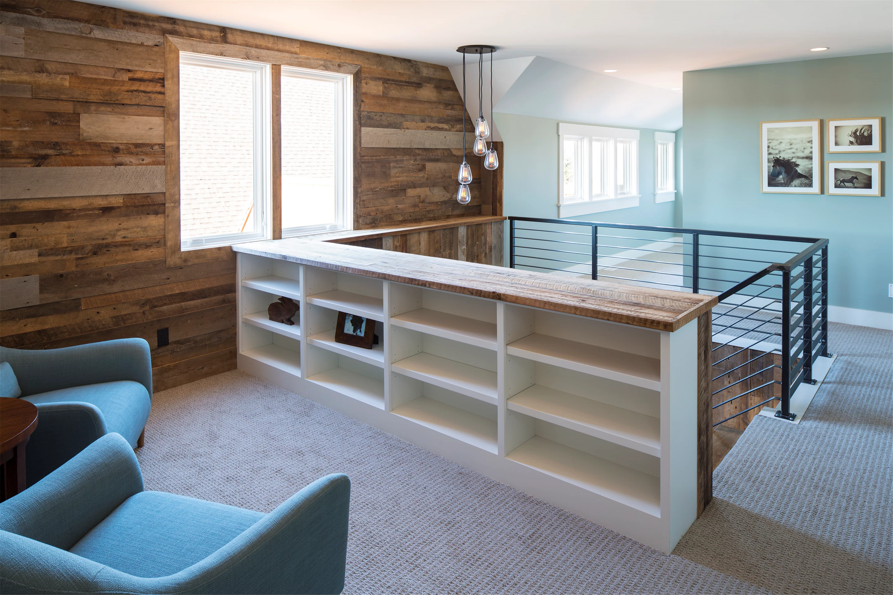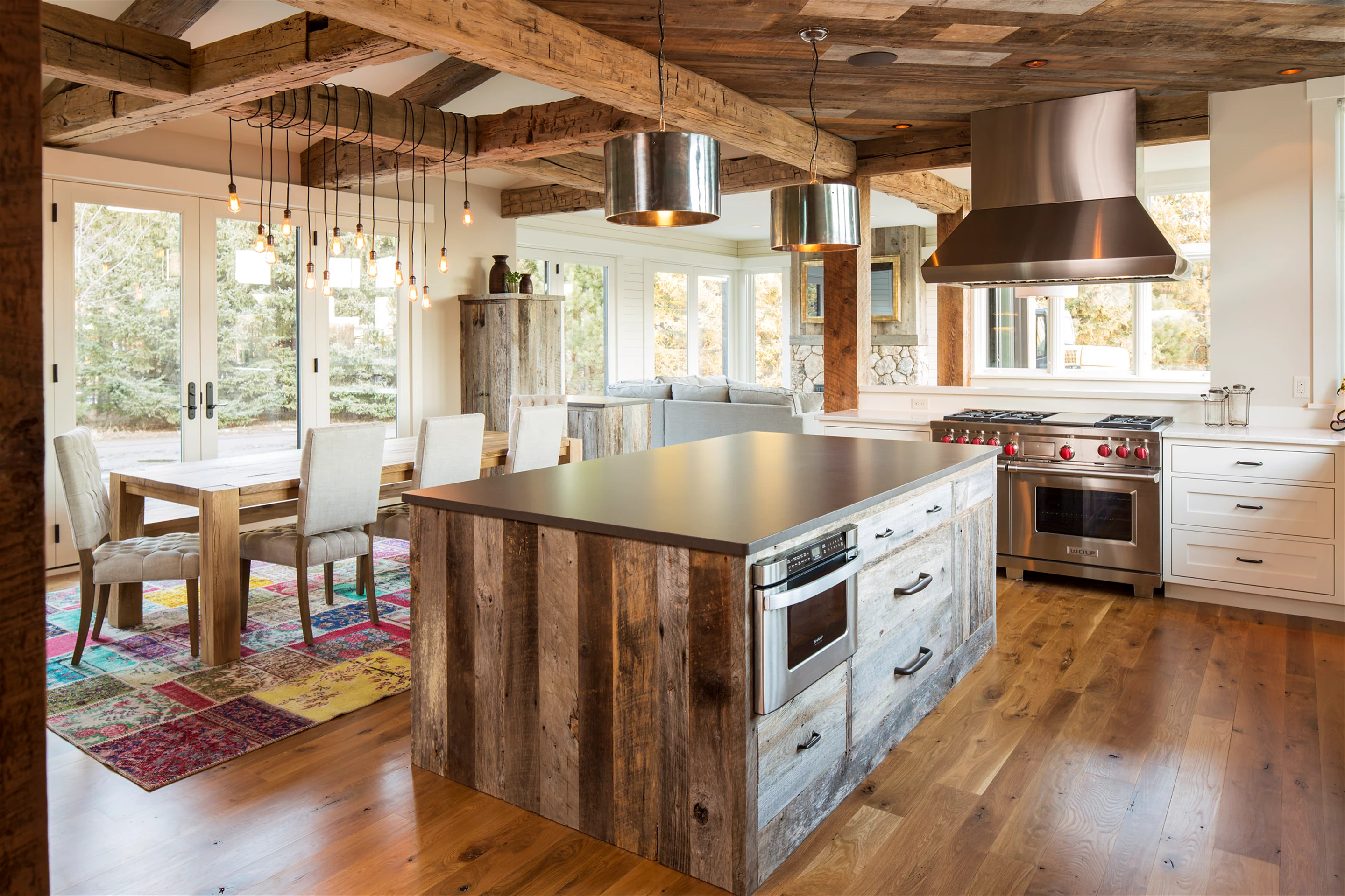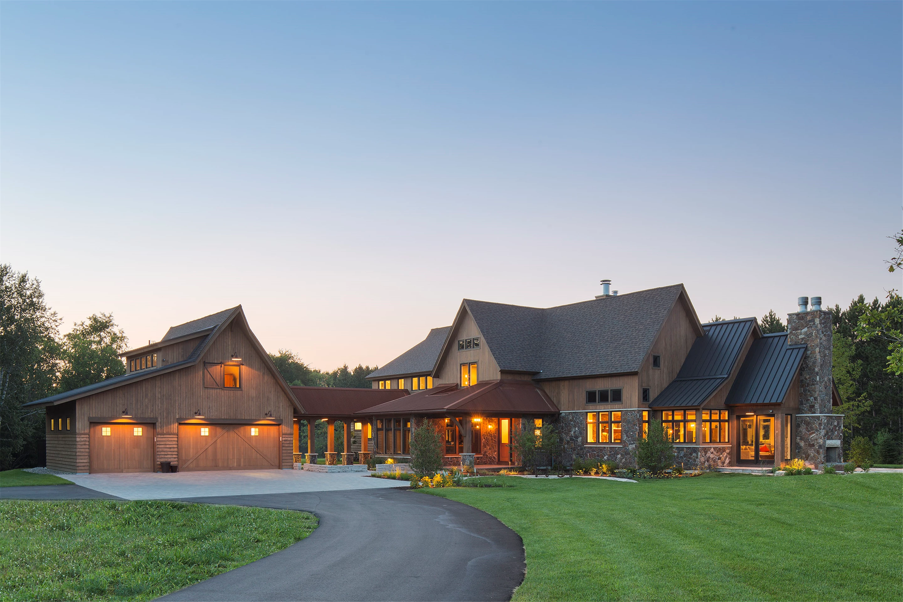 With four bedrooms, six bathrooms, 5,705 square feet, this modified two-story features a stone and cedar exterior that is a perfect counterpoint for the steel roofing and rusted corrugated accents. Just a breezeway away is the horse-barn-inspired garage with a yoga studio above plus plenty of outdoor living spaces. Four stone fireplaces create a warm ambiance throughout the residence. Life in the country is accommodated well by a tack room including a pet and boot washing area. Graceful application of reclaimed barn wood and corrugated steel winds a historic thread throughout and preservation oak flooring in varying widths spans the kitchen, dining, and great room beautifully. Secluded, yet conveniently located on the main level, the owners’ suite is just steps from the laundry, with his and her studies and a four-season porch. The yoga loft is perfectly Zen, with bamboo flooring, a sauna, and a bath.
